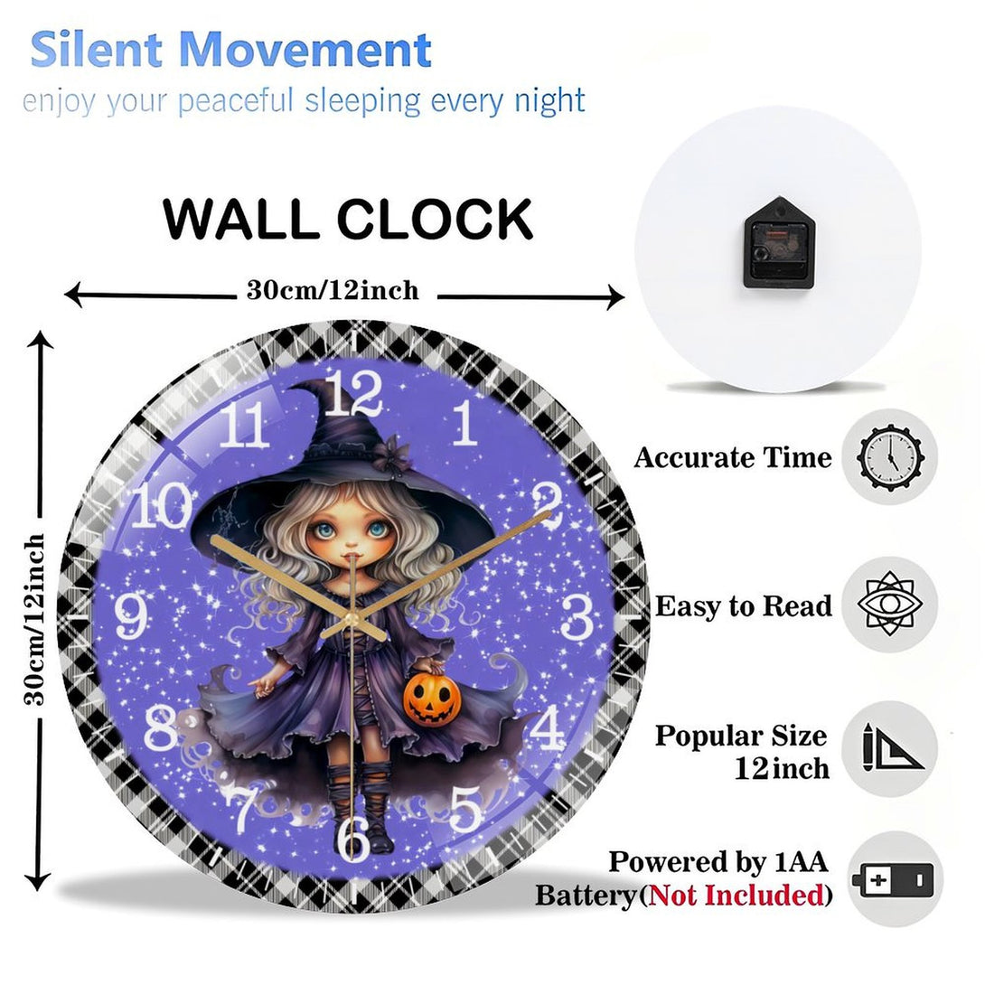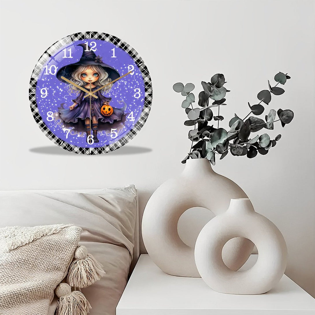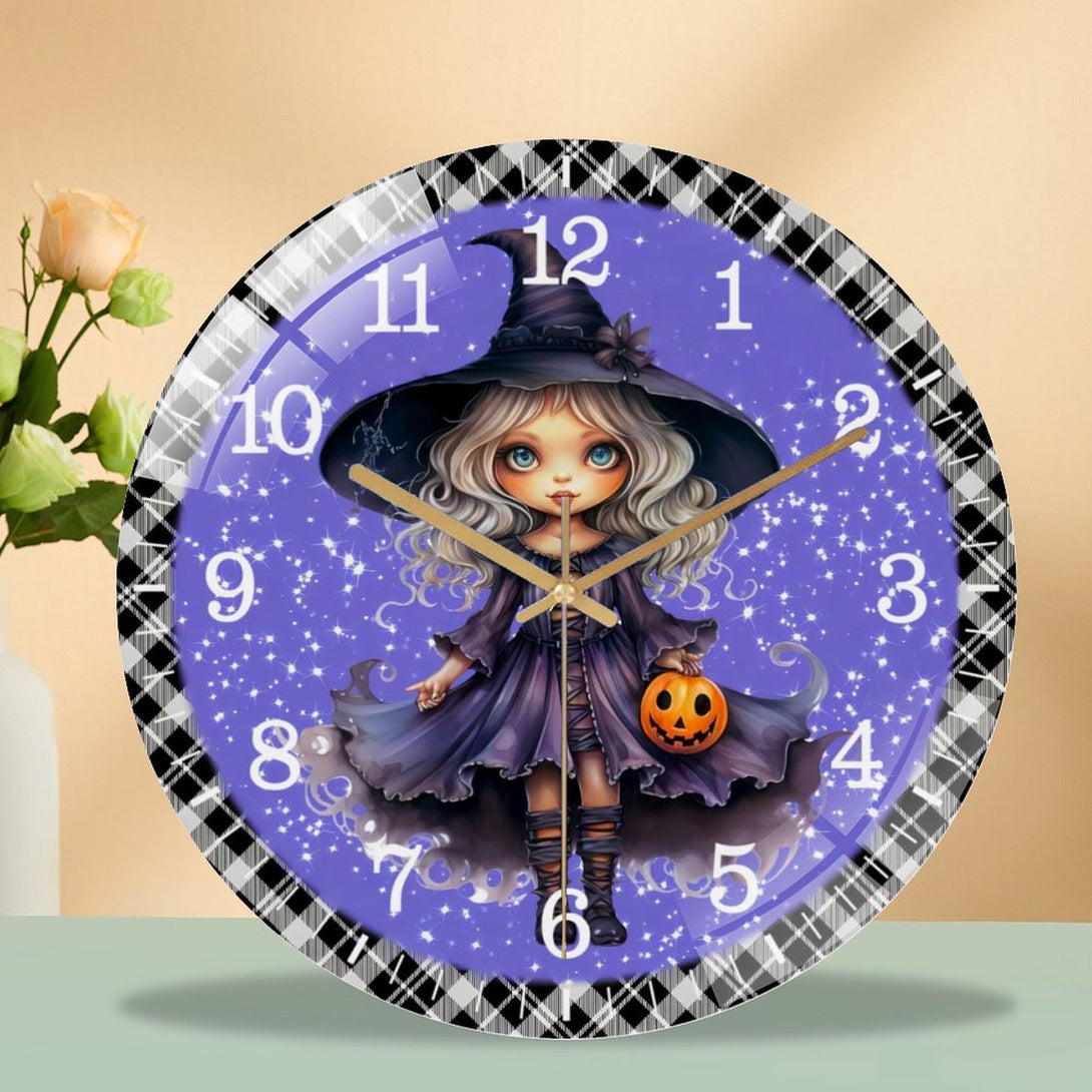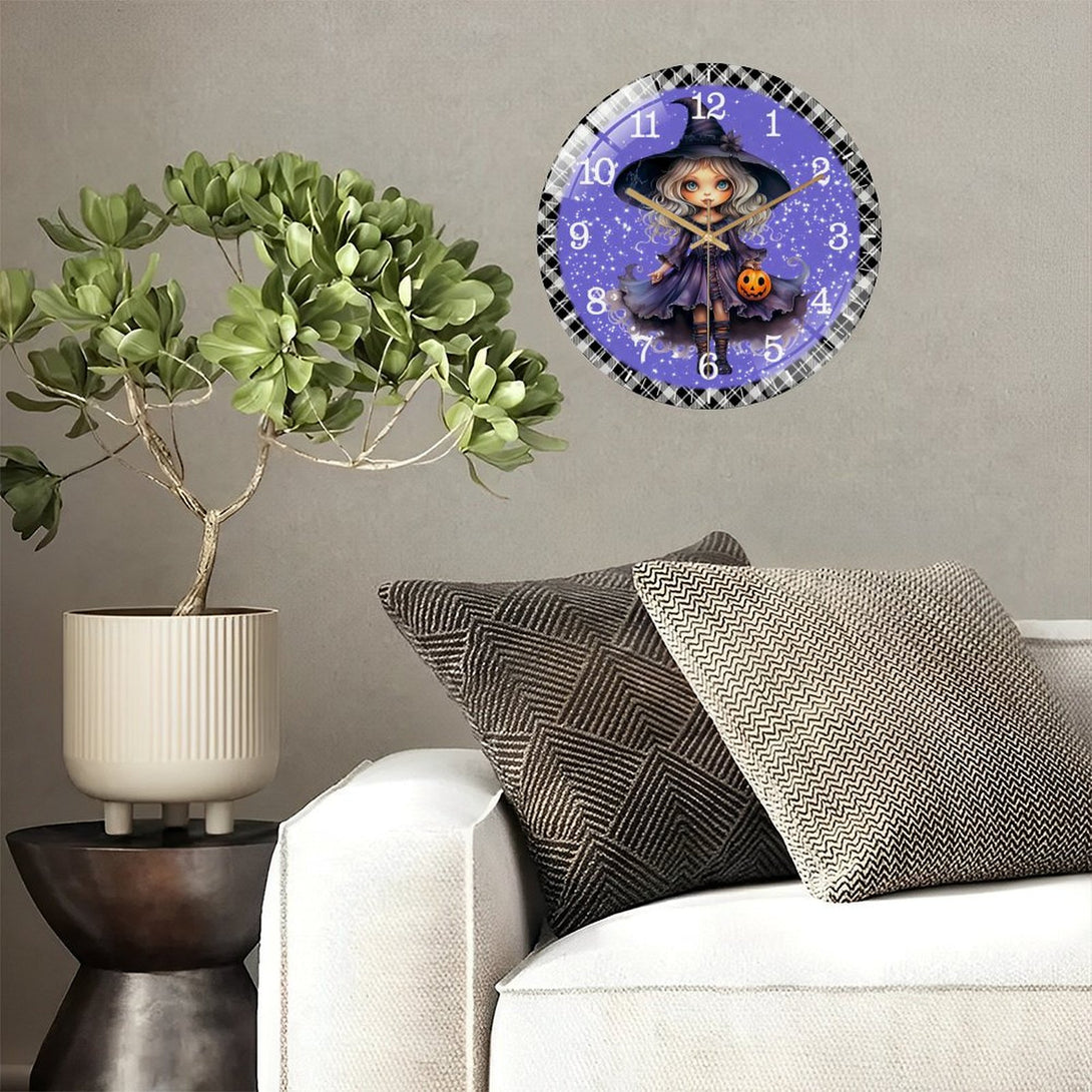 Hallo-ween Trick Or Treater Witchy Girl Glass Wall Clock, Cute Witch Girl Wall Clock for Homes, Bars, Offices, Man Caves, Garages, And Living Rooms. Also Makes A Great Gift.,12×12inch(30×30cm)