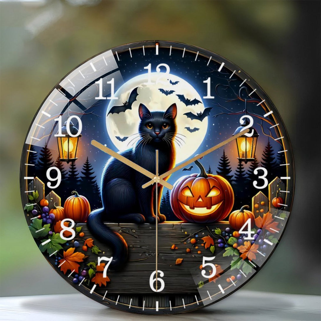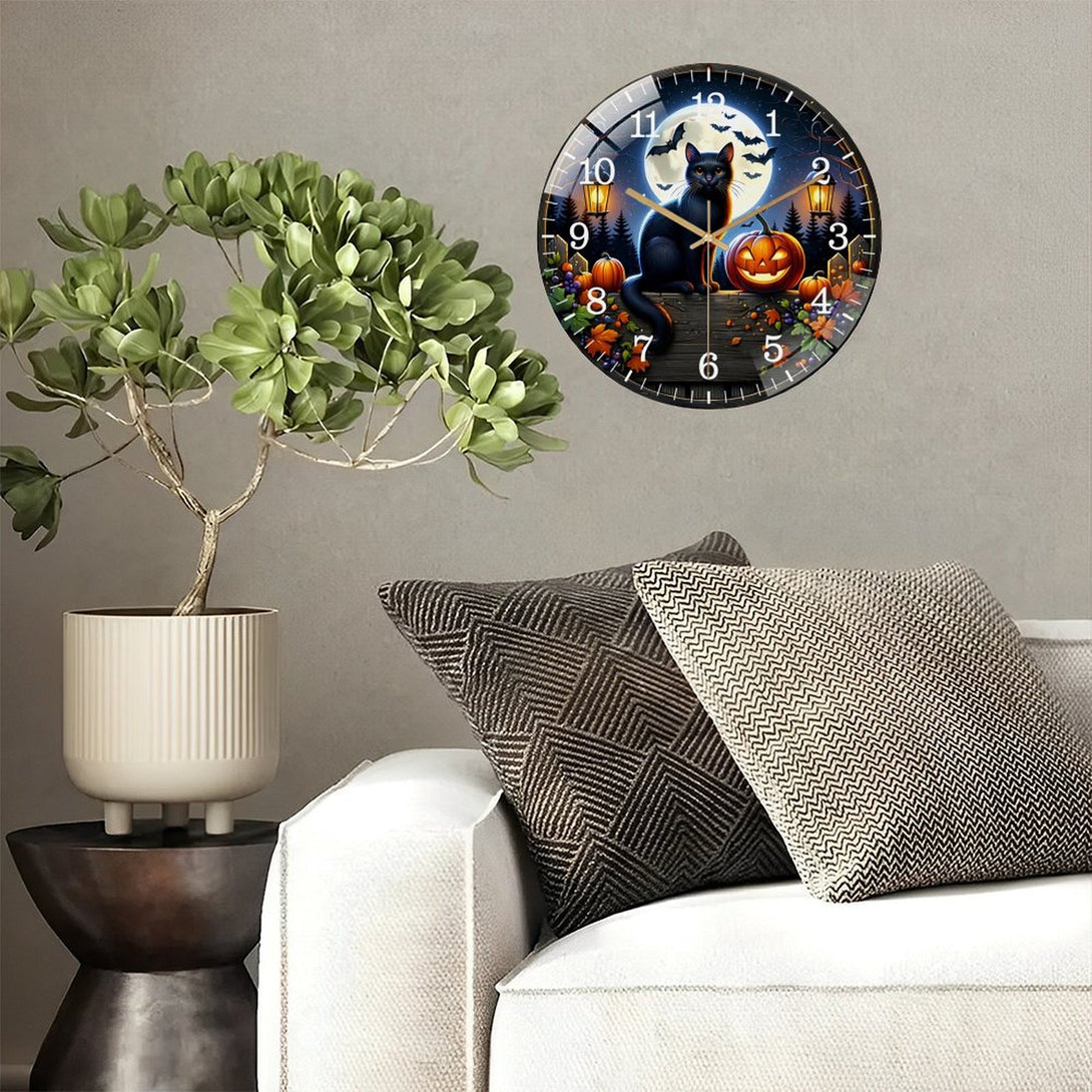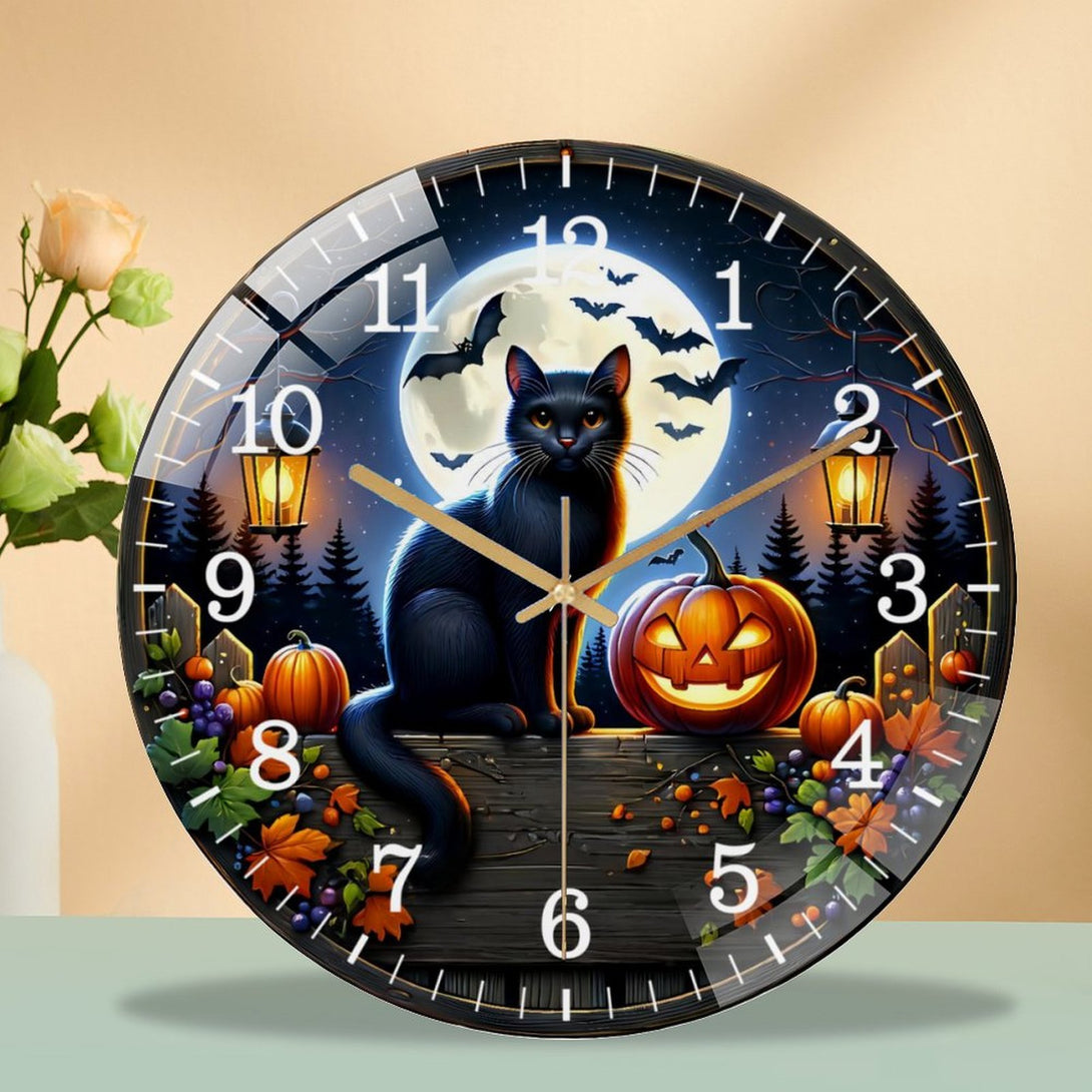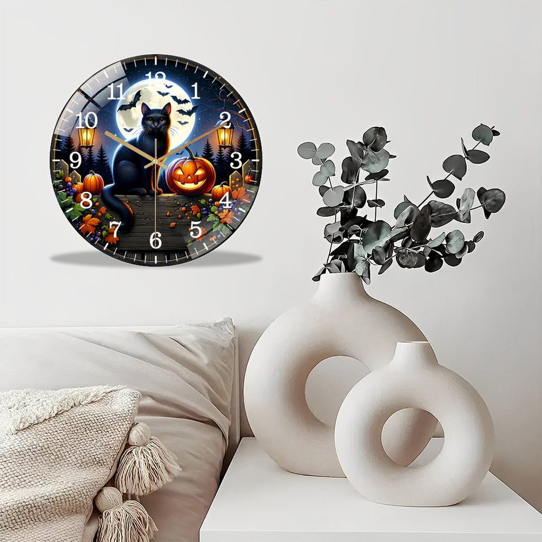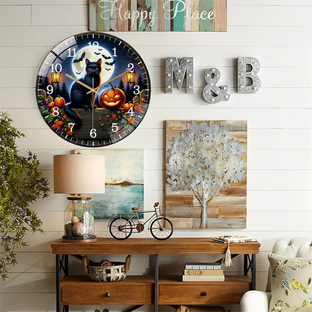 Decor Wall Clocks: Happy Halloween Black Cat Glass Wall Clock , Jack O Lantern Wreath Glass Wall Clock for Homes, Bars, Offices, Man Caves, Garages, And Living Rooms. Also Makes A Great Gift.