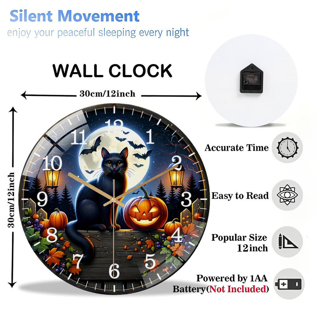 Happy Halloween Black Cat Glass Wall Clock , Jack O Lantern Wreath Glass Wall Clock for Homes, Bars, Offices, Man Caves, Garages, And Living Rooms. Also Makes A Great Gift.,12×12inch(30×30cm)