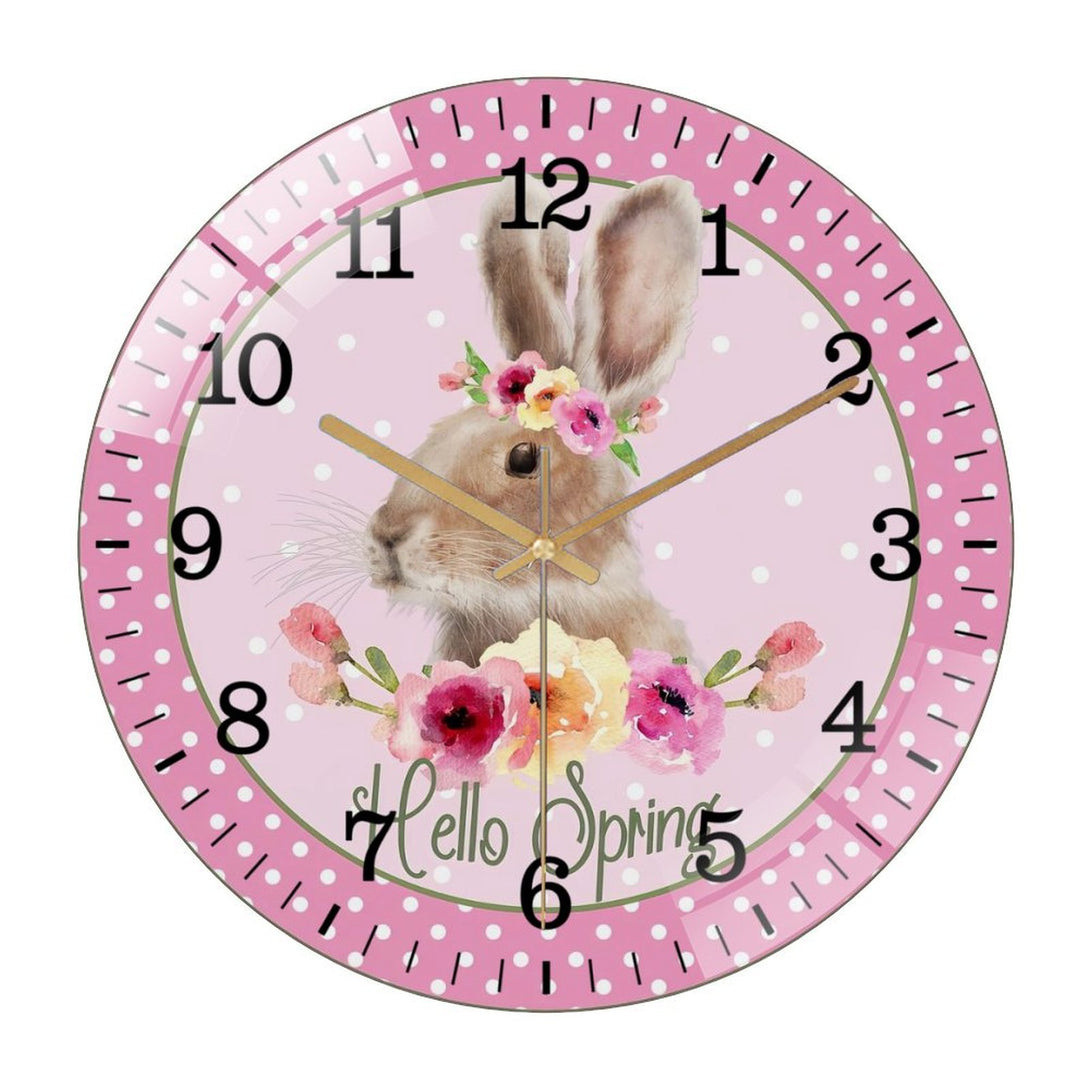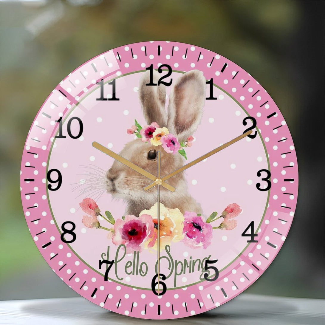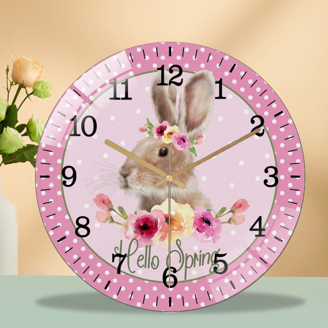 Decor Wall Clocks: Hello Spring Pink Bunny Wreath Glass Wall Clock ,Spring Wall Clock for Homes, Bars, Offices, Man Caves, Garages, And Living Rooms. Also Makes A Great Gift. Style 12×12inch(30×30cm)