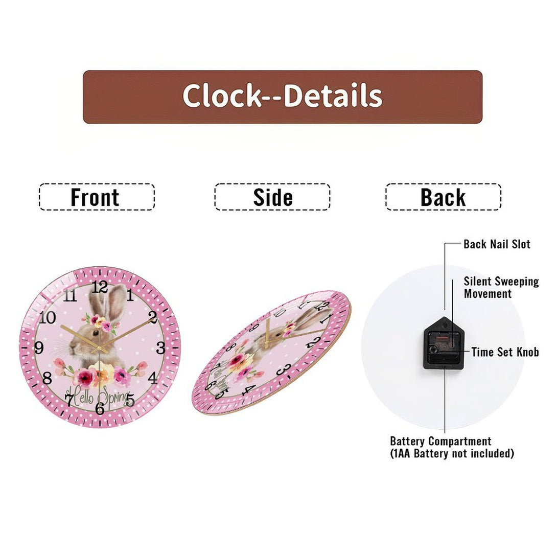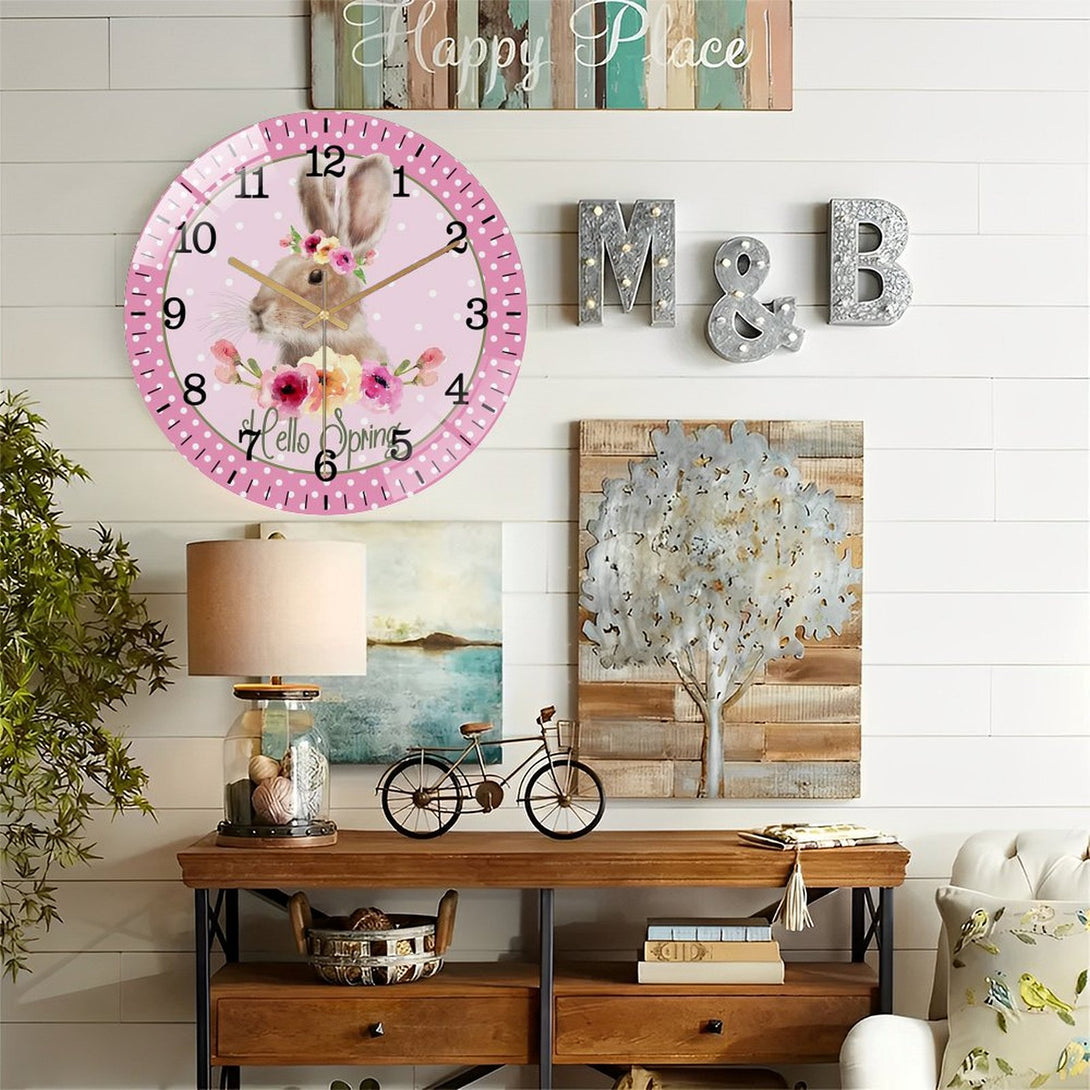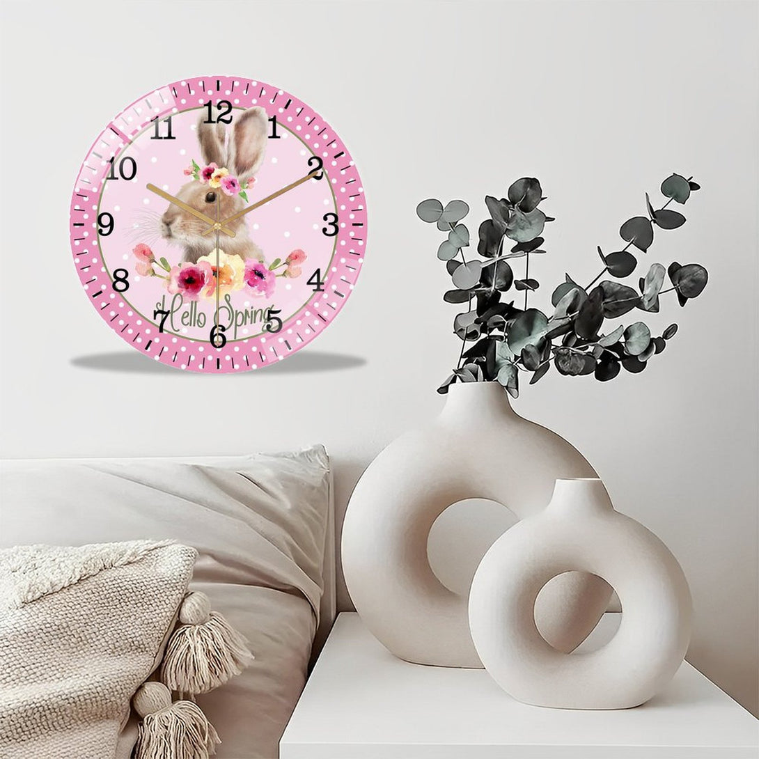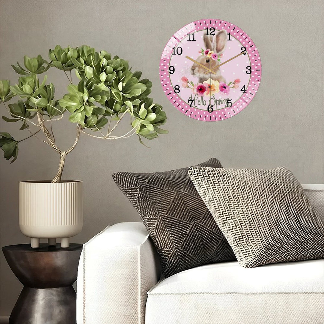 Decor Wall Clocks: Hello Spring Pink Bunny Wreath Glass Wall Clock ,Spring Wall Clock for Homes, Bars, Offices, Man Caves, Garages, And Living Rooms. Also Makes A Great Gift. Style 12×12inch(30×30cm)