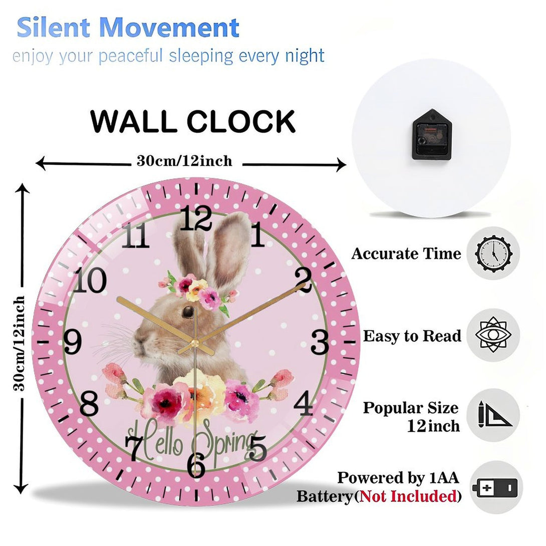 Hello Spring Pink Bunny Wreath Glass Wall Clock ,Spring Wall Clock for Homes, Bars, Offices, Man Caves, Garages, And Living Rooms. Also Makes A Great Gift.,12×12inch(30×30cm)