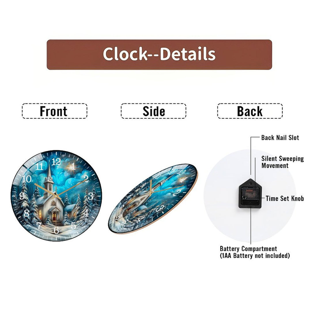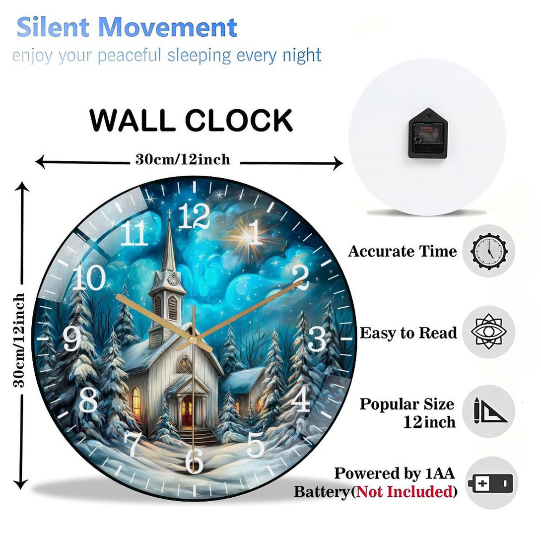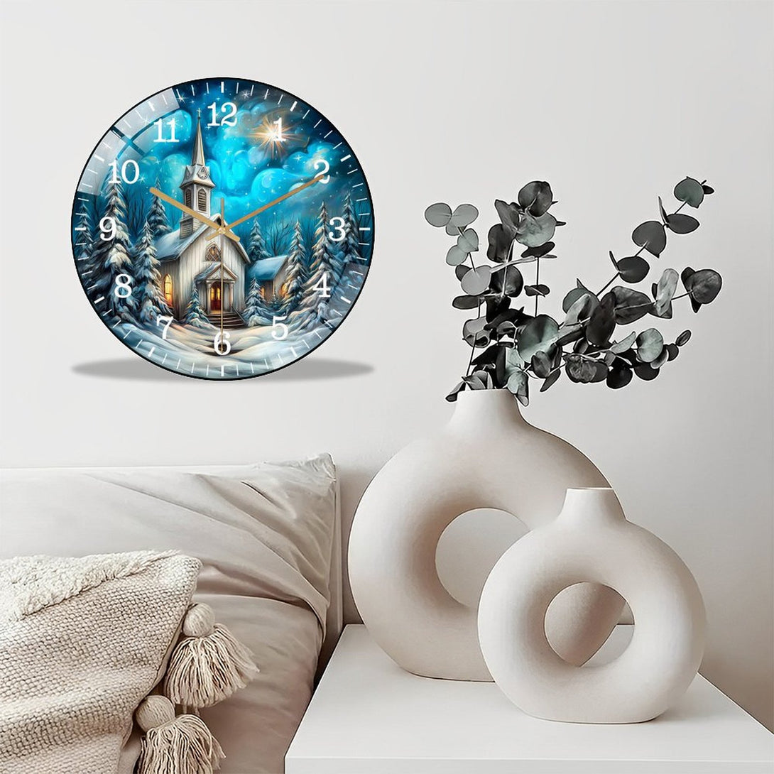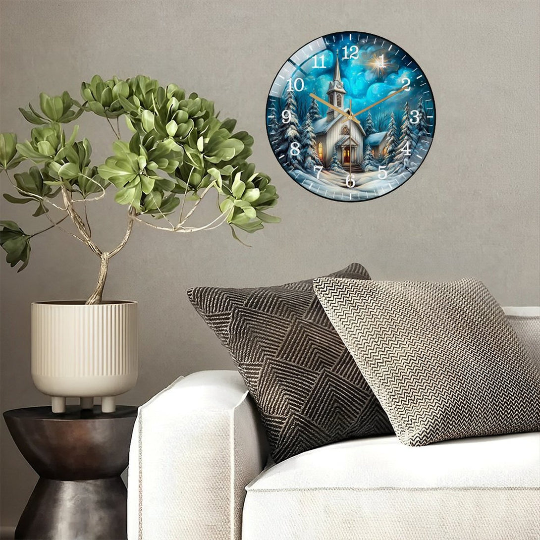 Holiday White Church in The Snow Glass Wall Clock, Winter Christmas Decor Wall Clock for Homes, Bars, Offices, Man Caves, Garages, And Living Rooms .Also Makes A Great Gift.,12×12inch(30×30cm)