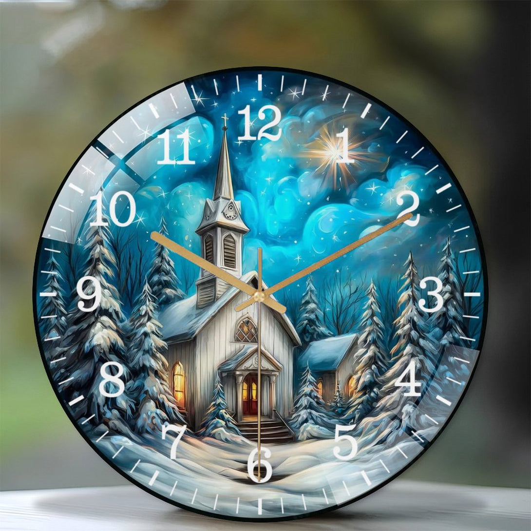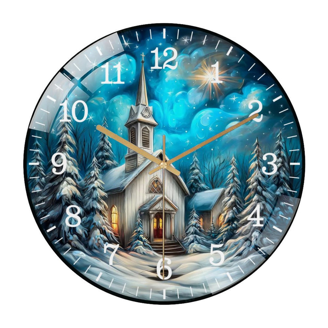 Decor Wall Clocks: Holiday White Church in The Snow Glass Wall Clock, Winter Christmas Decor Wall Clock for Homes, Bars, Offices, Man Caves, Garages, And Living Rooms .Also Makes A Great Gift.