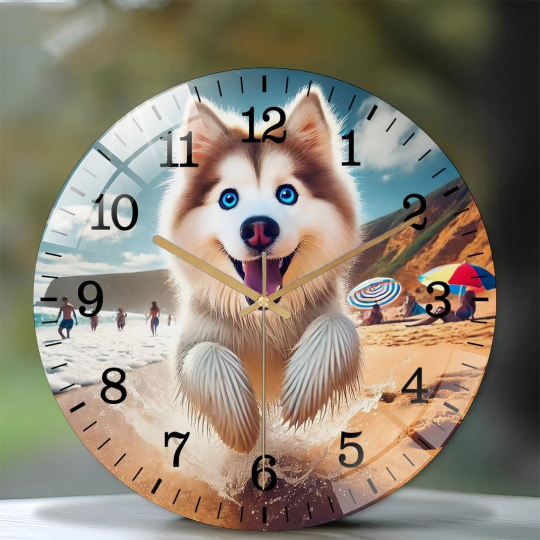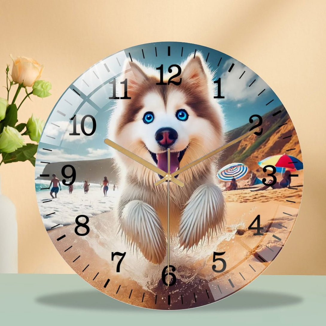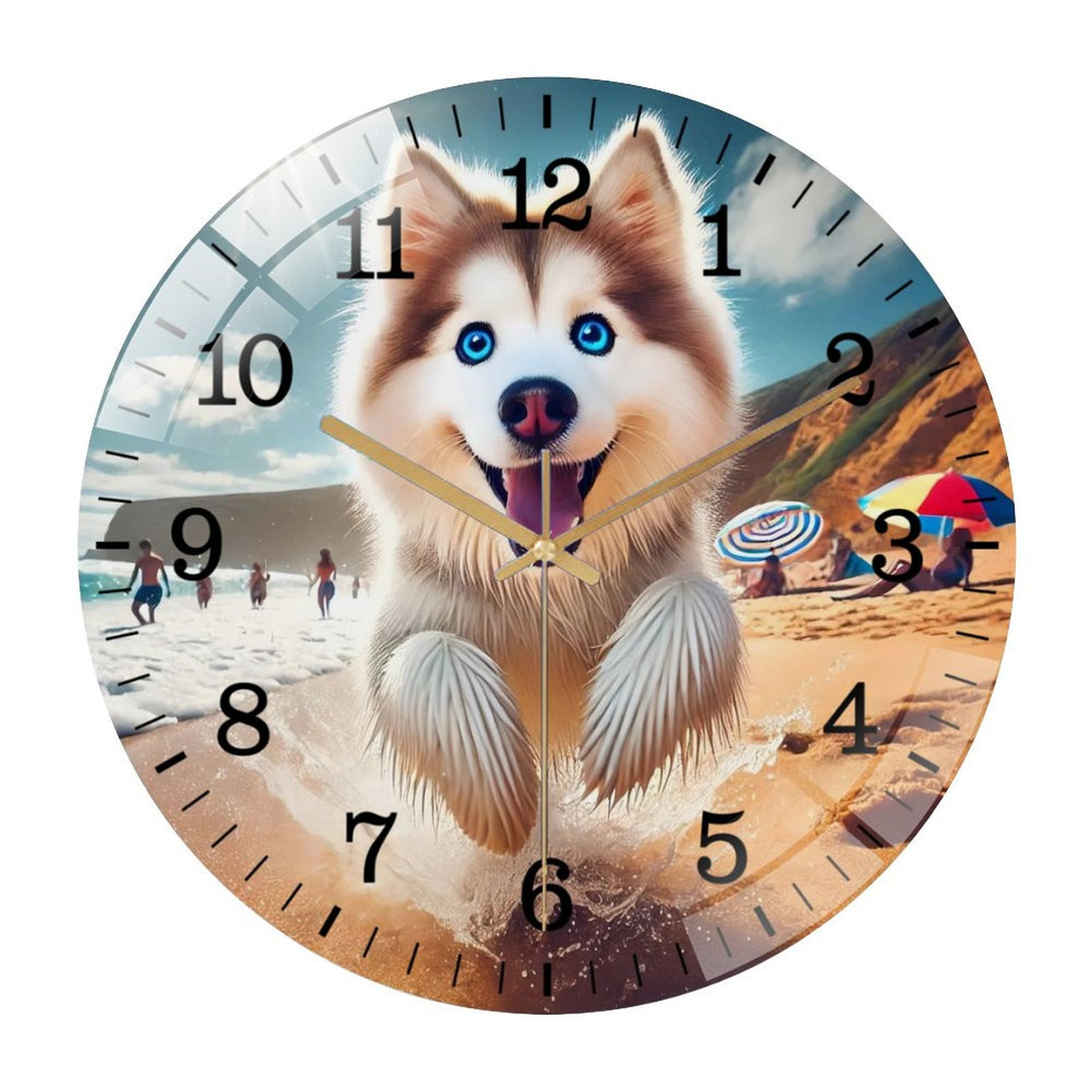 Husky on The Beach Glass Wall Clock ,Dog Lover Wall Clock for Homes, Bars, Offices, Man Caves, Garages, And Living Rooms. .Also Makes A Great Gift.,12×12inch(30×30cm)