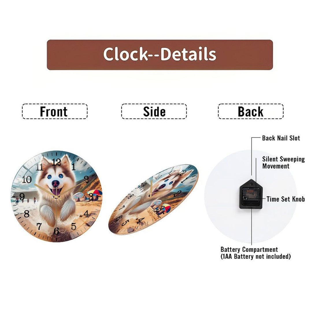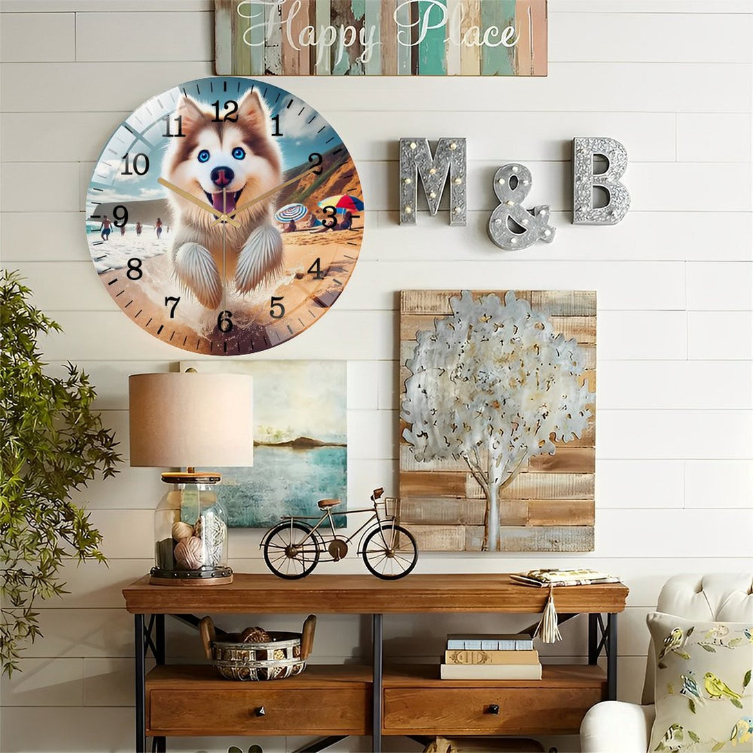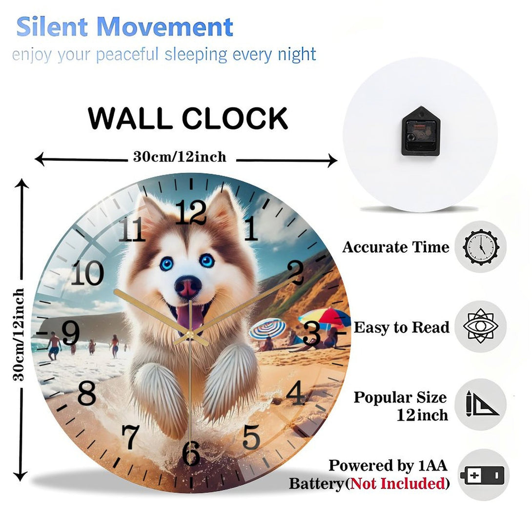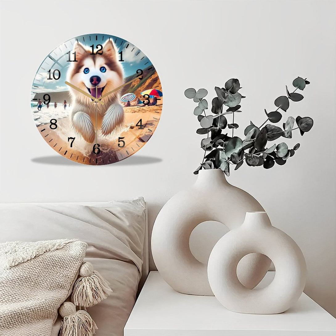 Husky on The Beach Glass Wall Clock ,Dog Lover Wall Clock for Homes, Bars, Offices, Man Caves, Garages, And Living Rooms. .Also Makes A Great Gift.,12×12inch(30×30cm)