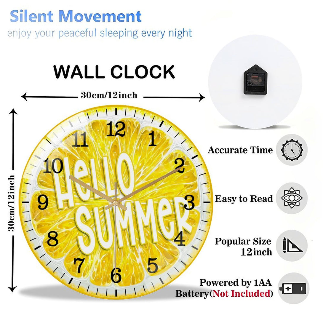 Lemon Slice Hello Summer Lemon Glass Wall Clock, Lemon Decor Wall Clock for Homes, Bars, Offices, Man Caves, Garages, And Living Rooms .Also Makes A Great Gift.,12×12inch(30×30cm)