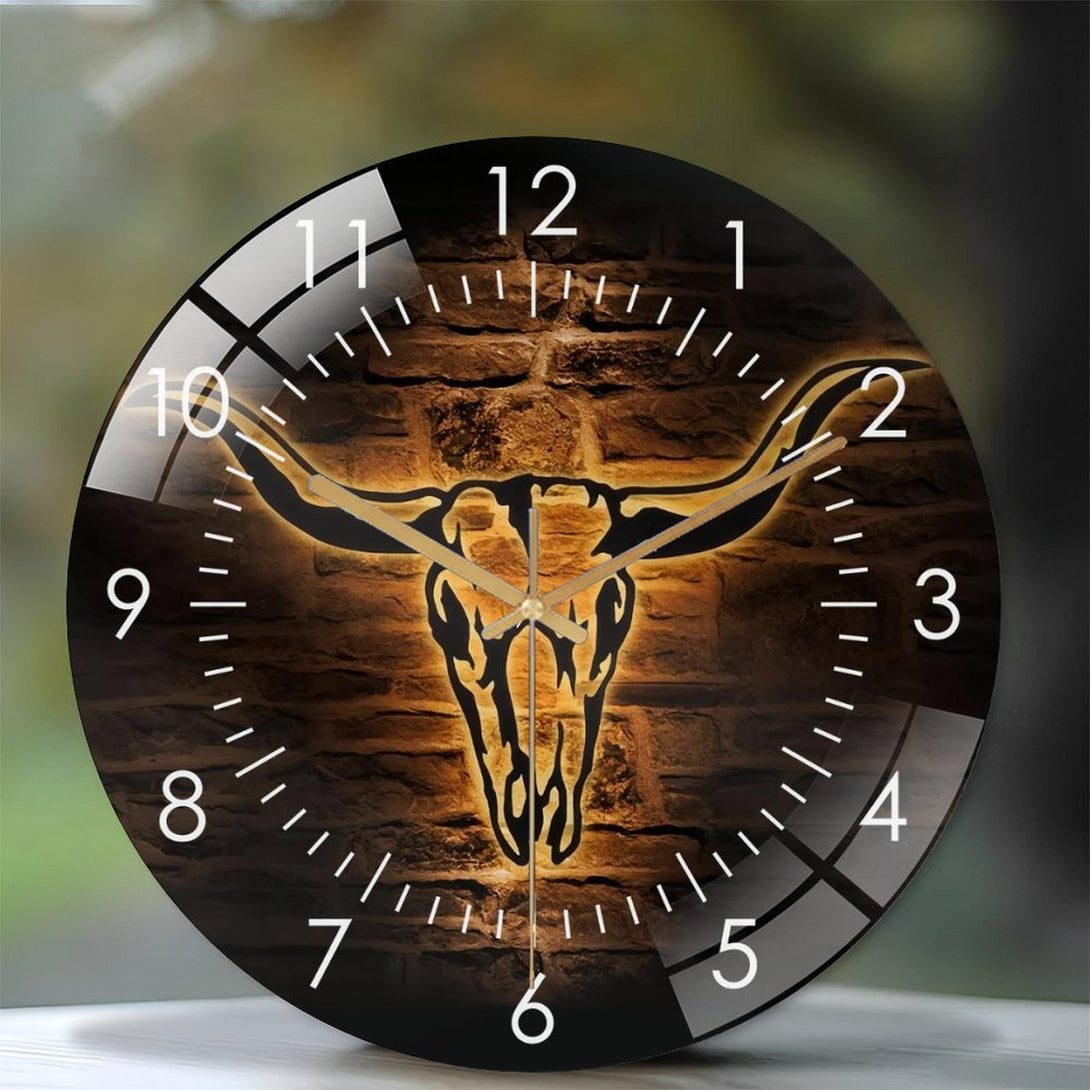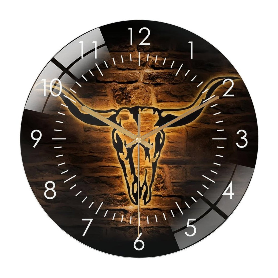 Longhorn Bull Skull Glass Wall Clock,Cowboy Western Life Glass Wall Clock, Home Decor Boho Buffalo Decoration Man Cave Housewarming Father's Day,12×12inch(30×30cm)