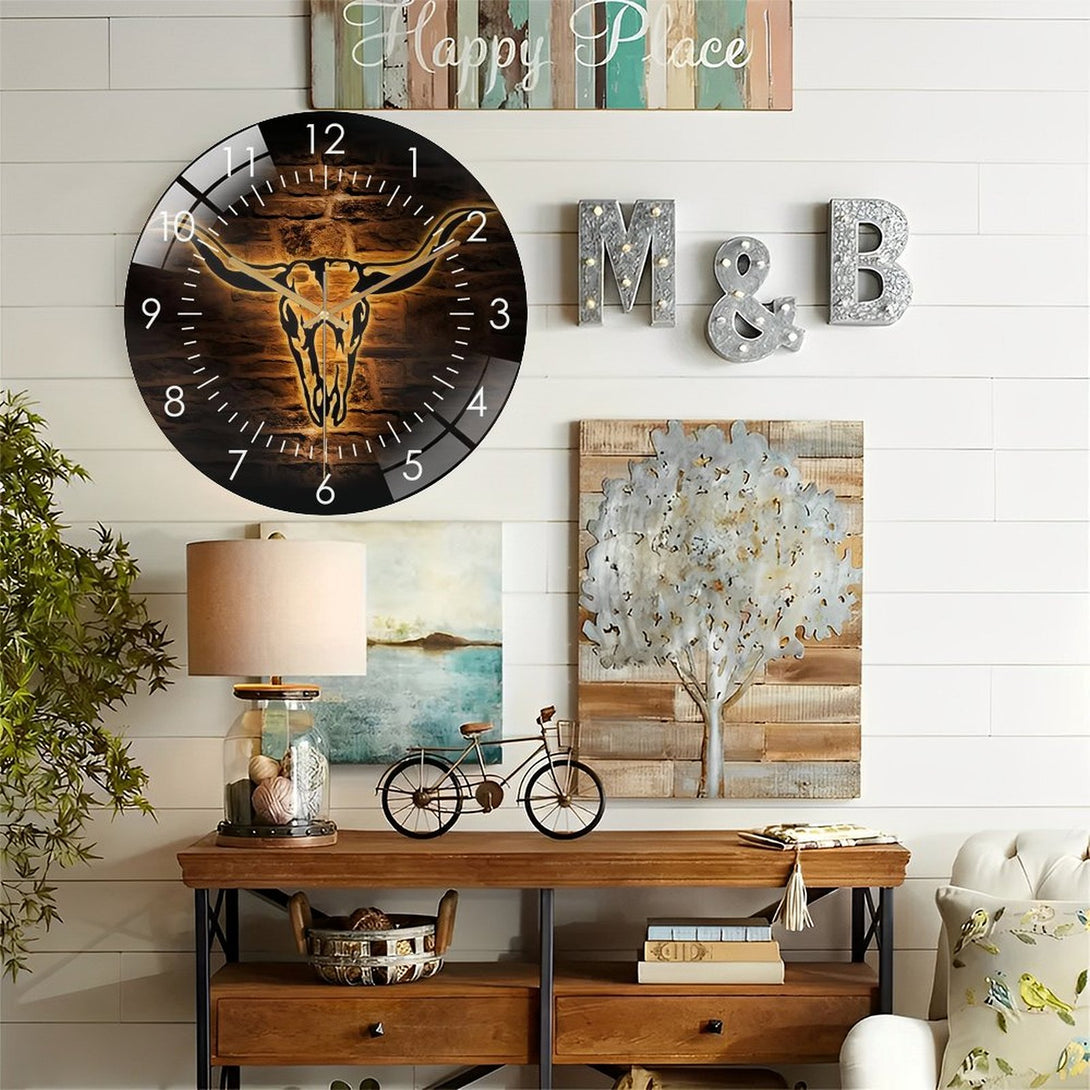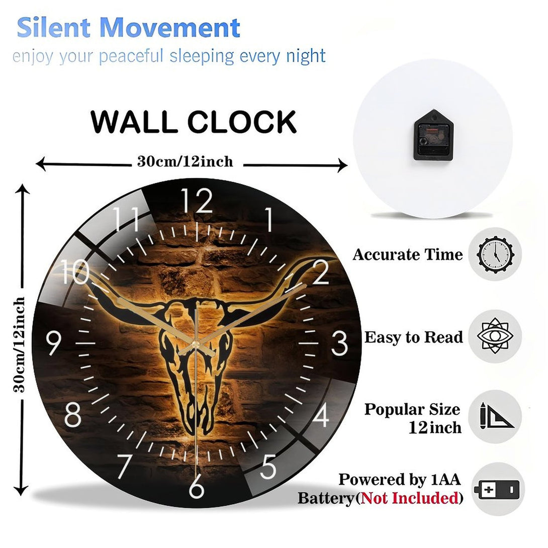 Decor Wall Clocks: Longhorn Bull Skull Glass Wall Clock,Cowboy Western Life Glass Wall Clock, Home Decor Boho Buffalo Decoration Man Cave Housewarming Father's Day Style 12×12inch(30×30cm)