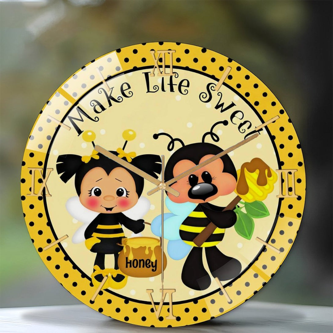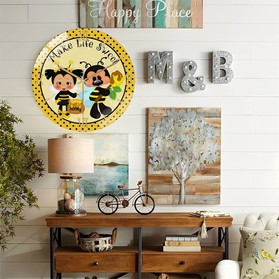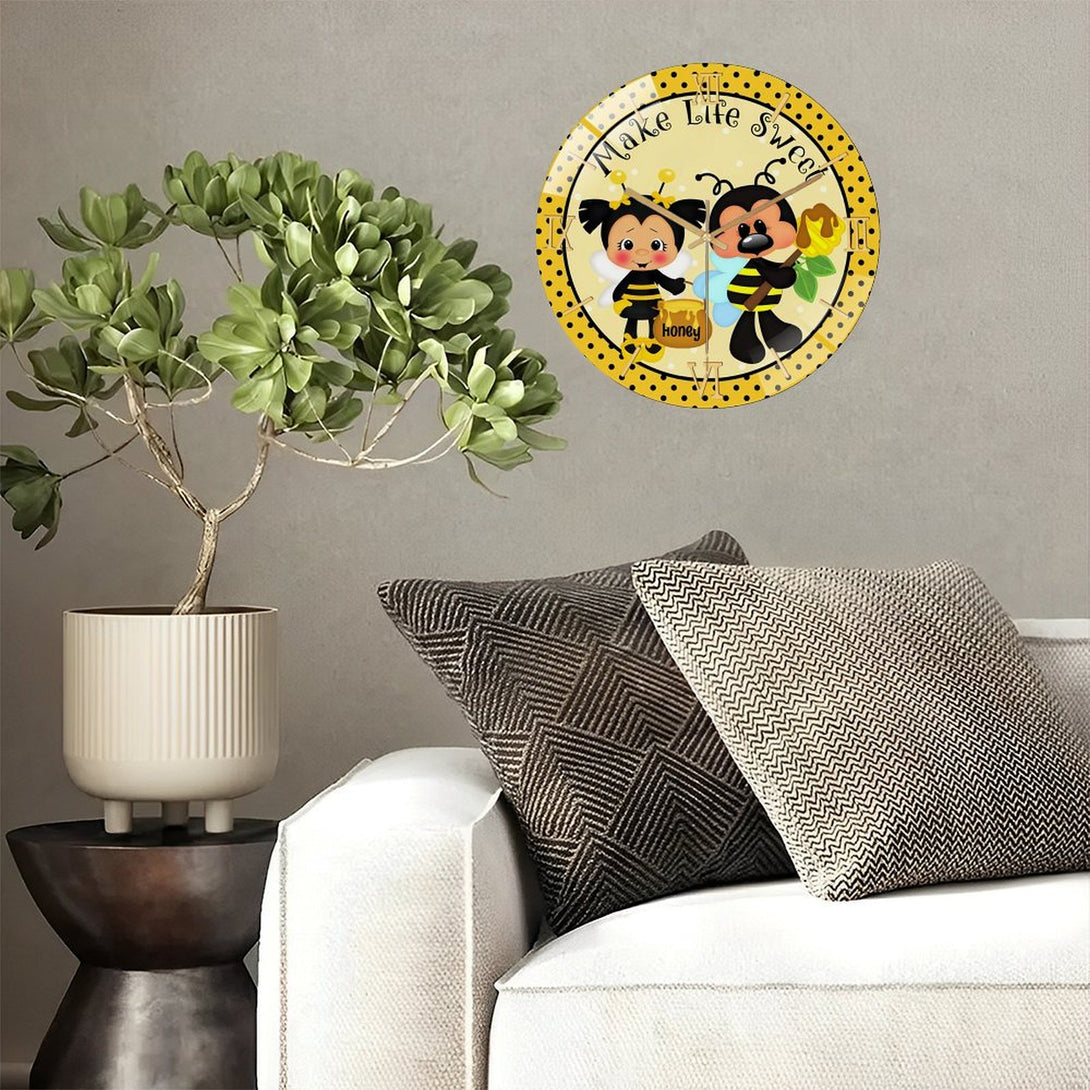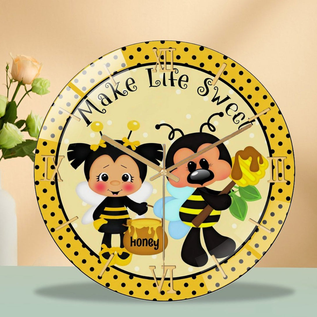Decor Wall Clocks: Make Life Sweet Bee Glass Wall Clock Round Spring Summer Wall Clock for Homes, Bars, Offices, Man Caves, Garages, And Living Rooms. Also Makes A Great Gift.