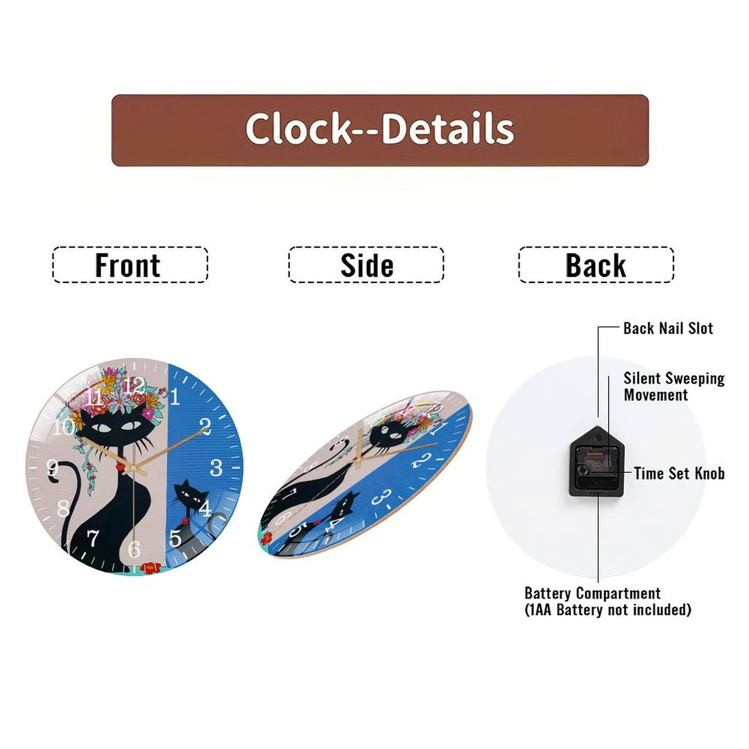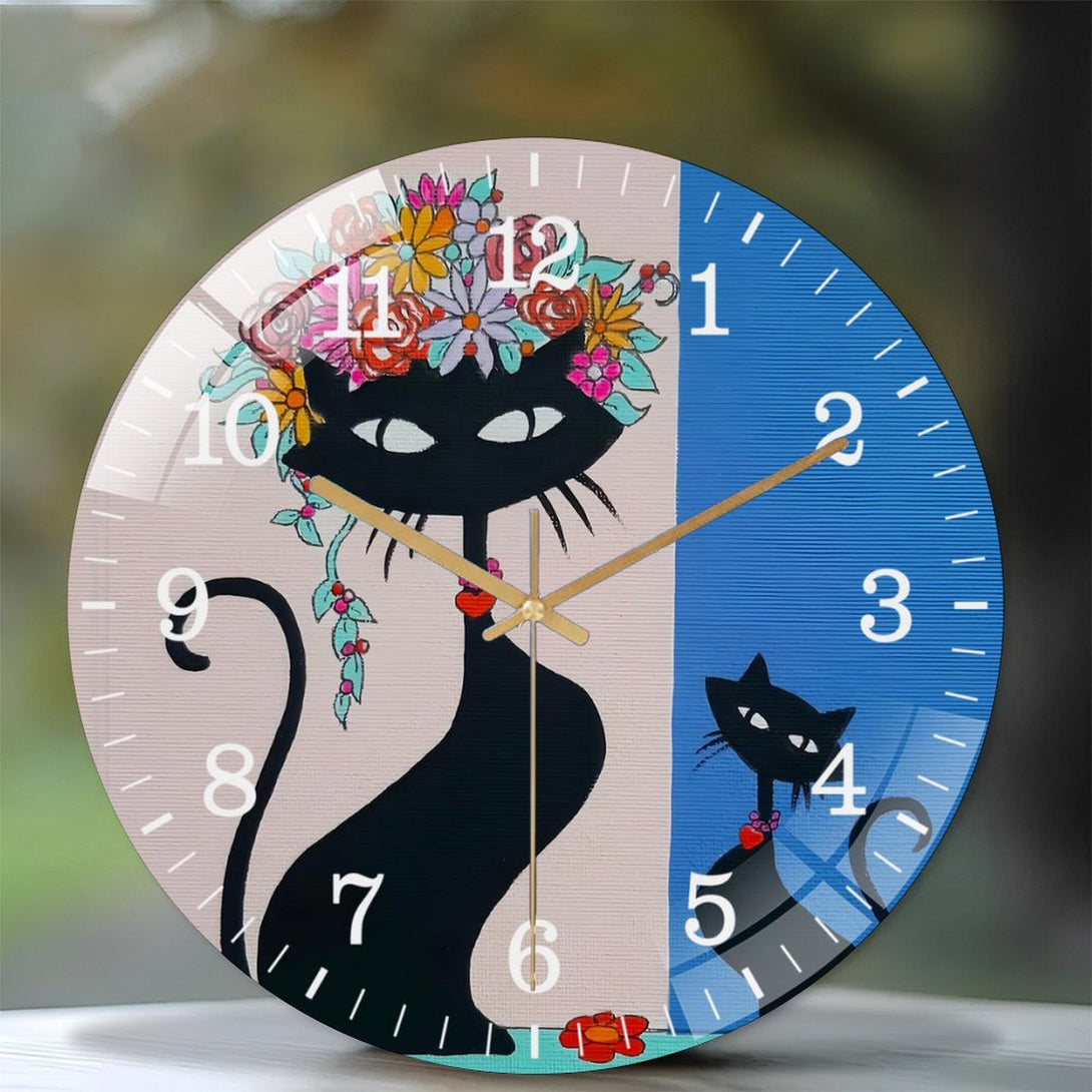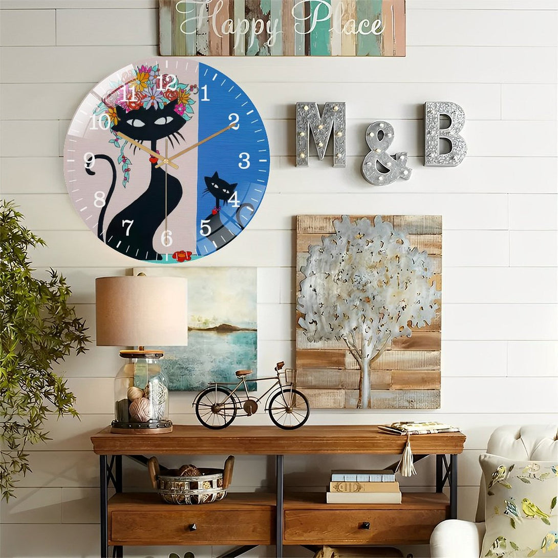 Decor Wall Clocks: Mid Century Black Cats with Flower Hat, Cat Art Glass Wall Clock, Black Cats Wall Clock, Art for Cat Lovers Decor Wall Clock for Homes, Bars, Offices, Man Caves, Garages,