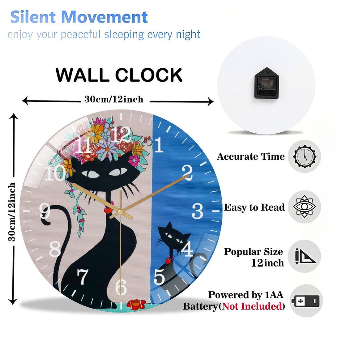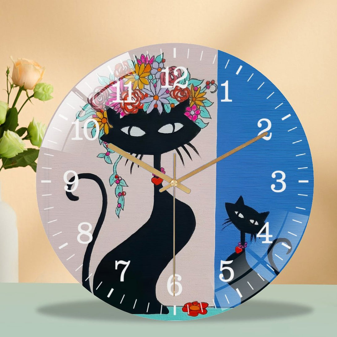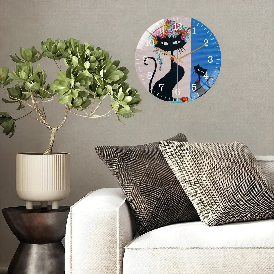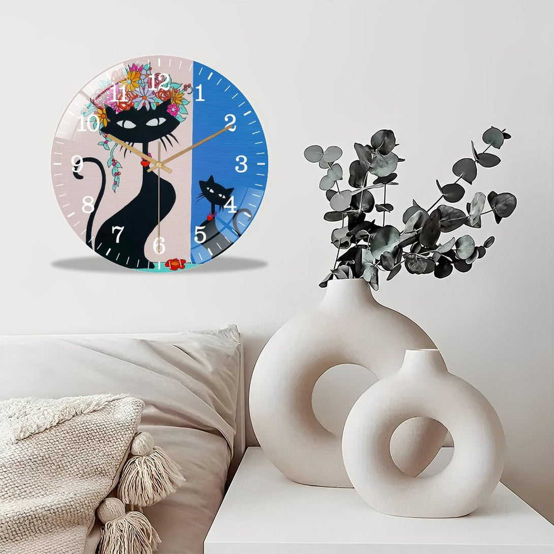 Mid Century Black Cats with Flower Hat, Cat Art Glass Wall Clock, Black Cats Wall Clock, Art for Cat Lovers Decor Wall Clock for Homes, Bars, Offices, Man Caves, Garages, And Living R,12×12inch(30×30cm)