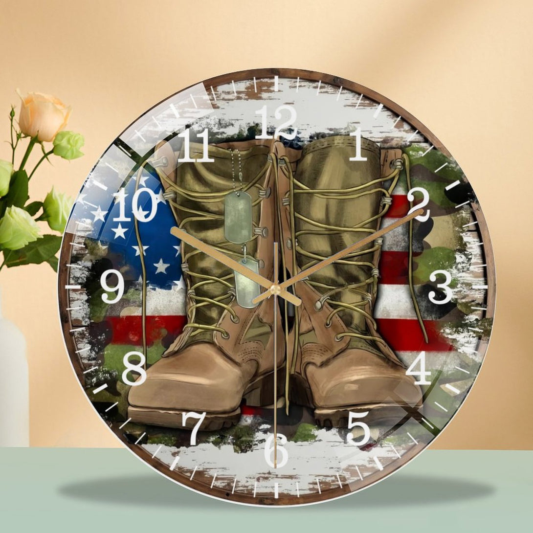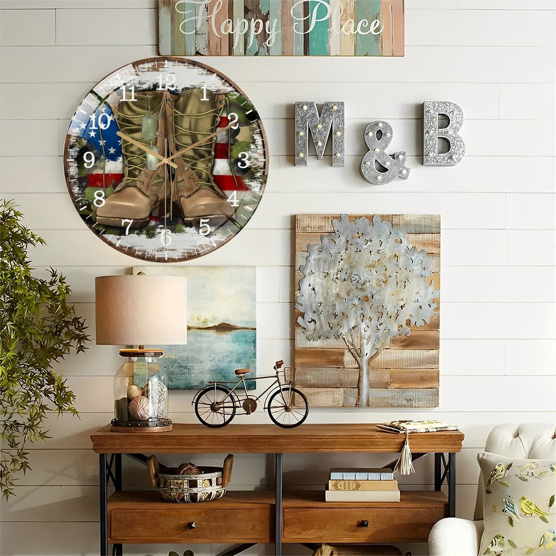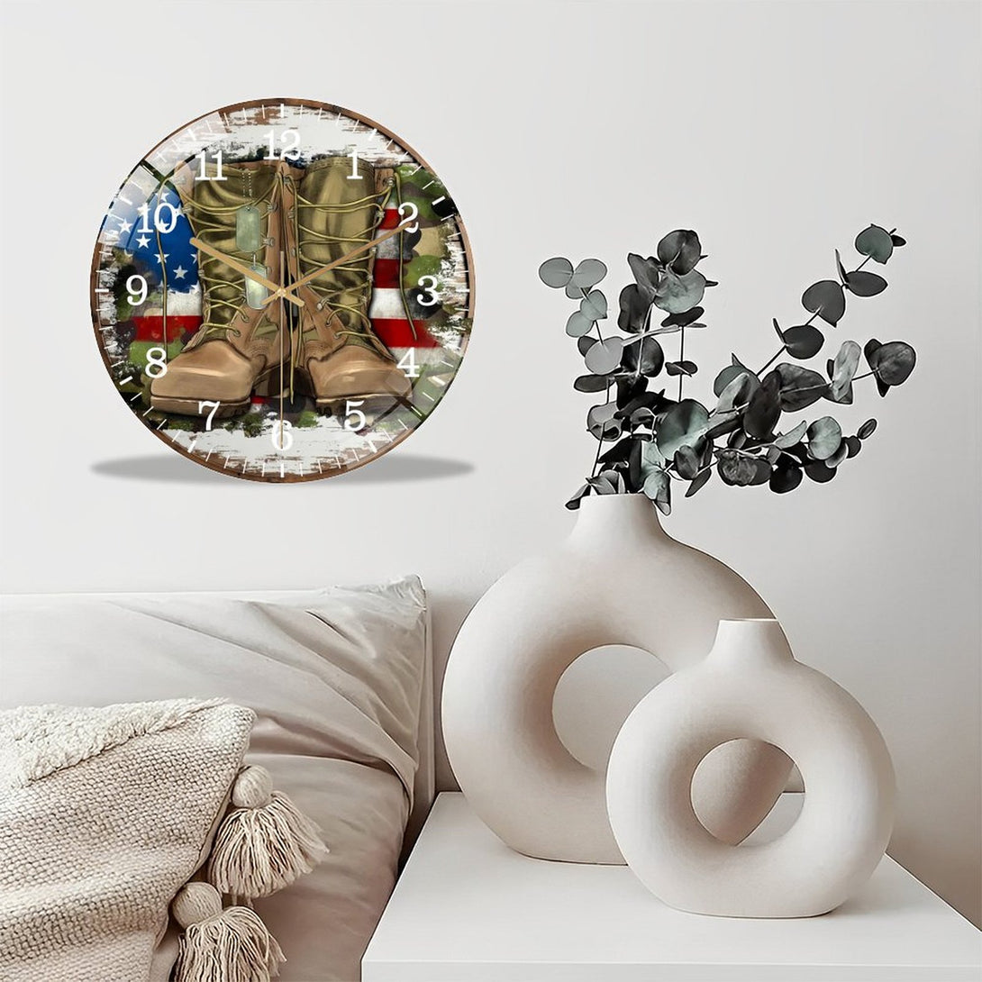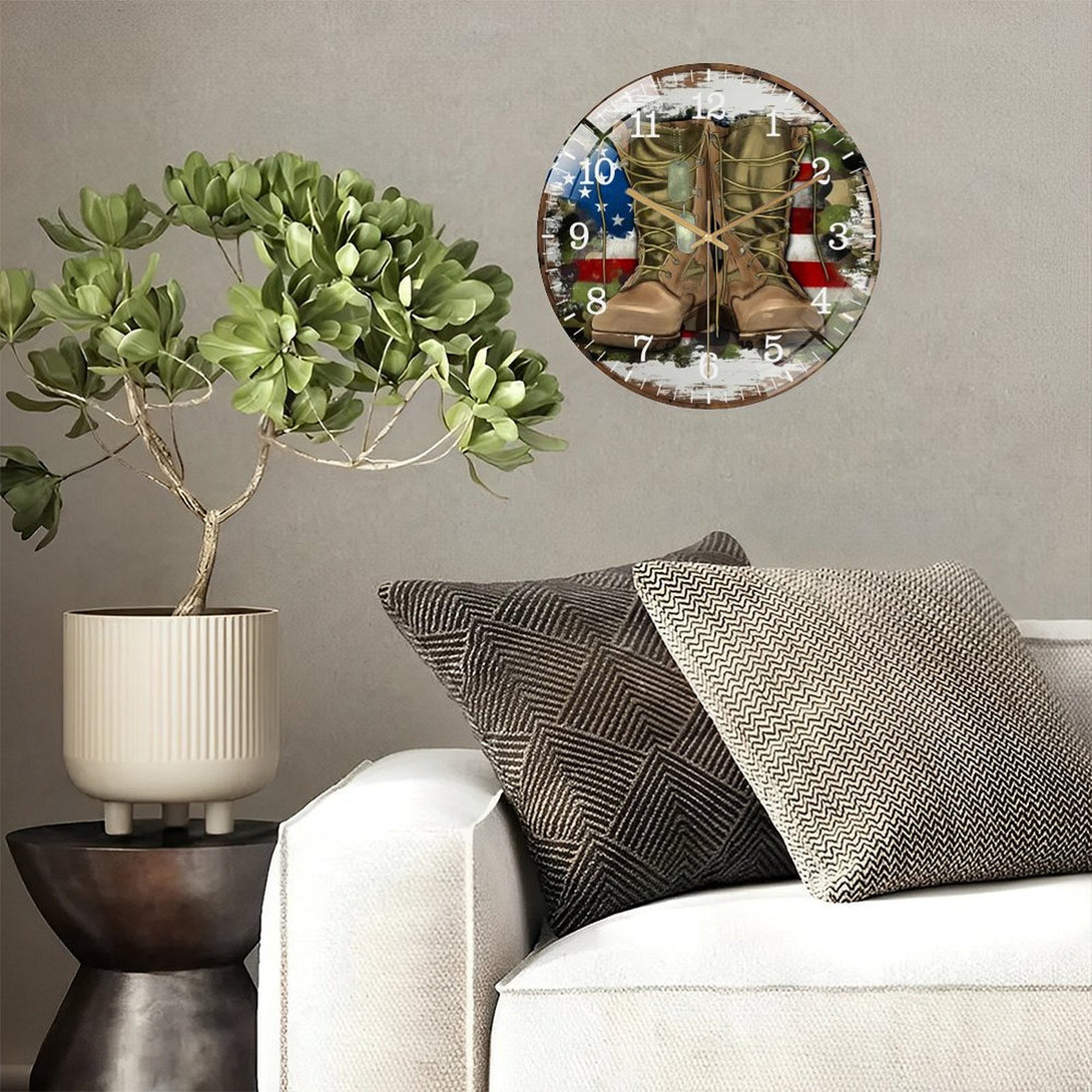 Decor Wall Clocks: Patriotic Boots American Flag Glass Wall Clock, Fourth of July Decor Wall Clock for Homes, Bars, Offices, Man Caves, Garages, And Living Rooms .Also Makes A Great Gift.