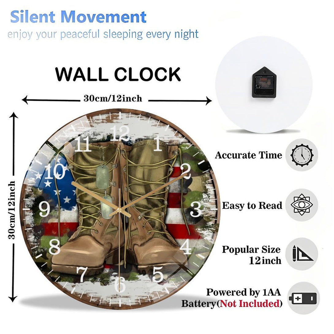 Patriotic Boots American Flag Glass Wall Clock, Fourth of July Decor Wall Clock for Homes, Bars, Offices, Man Caves, Garages, And Living Rooms .Also Makes A Great Gift.,12×12inch(30×30cm)