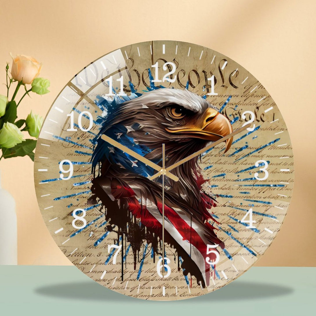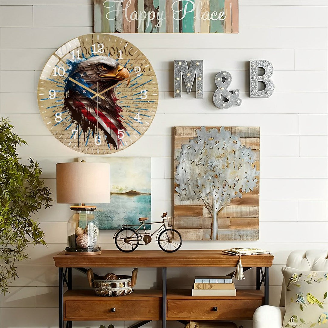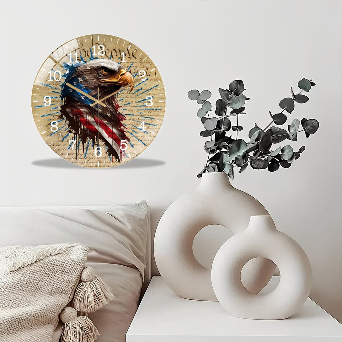 Patriotic Eagle Round Glass Wall Clock ,home Decor Wall Clock for Homes, Bars, Offices, Man Caves, Garages, And Living Rooms. Also Makes A Great Gift.,12×12inch(30×30cm)