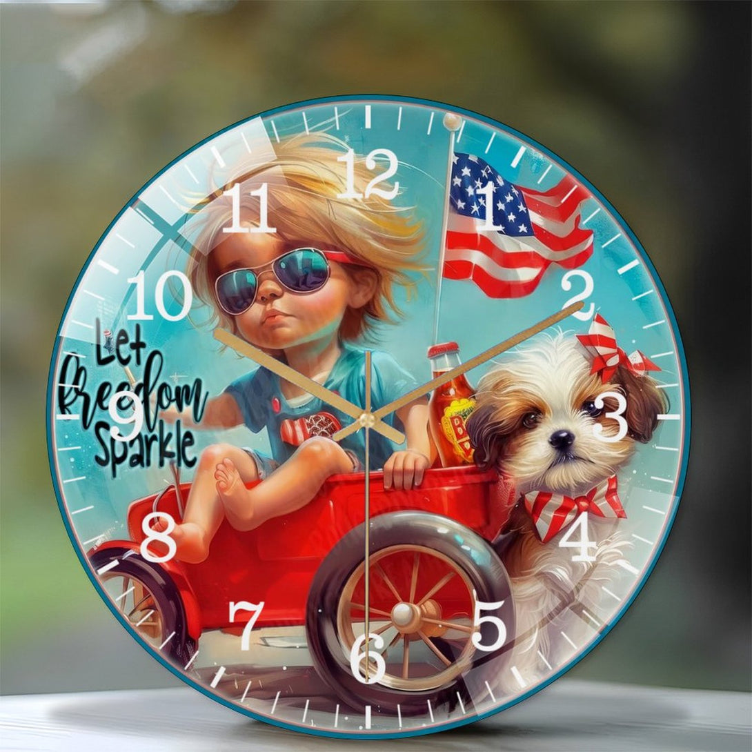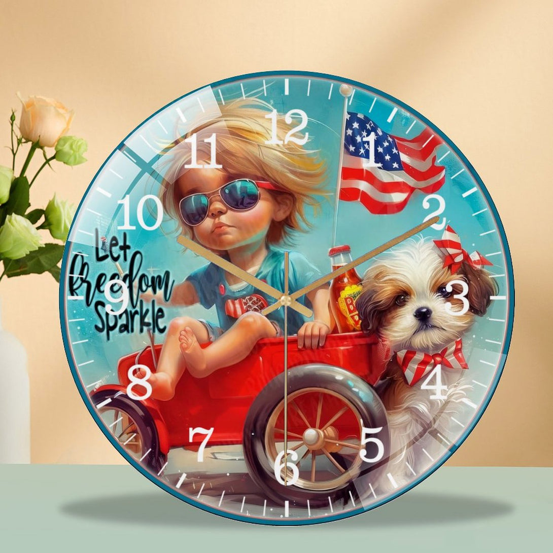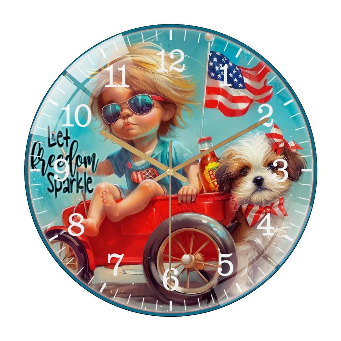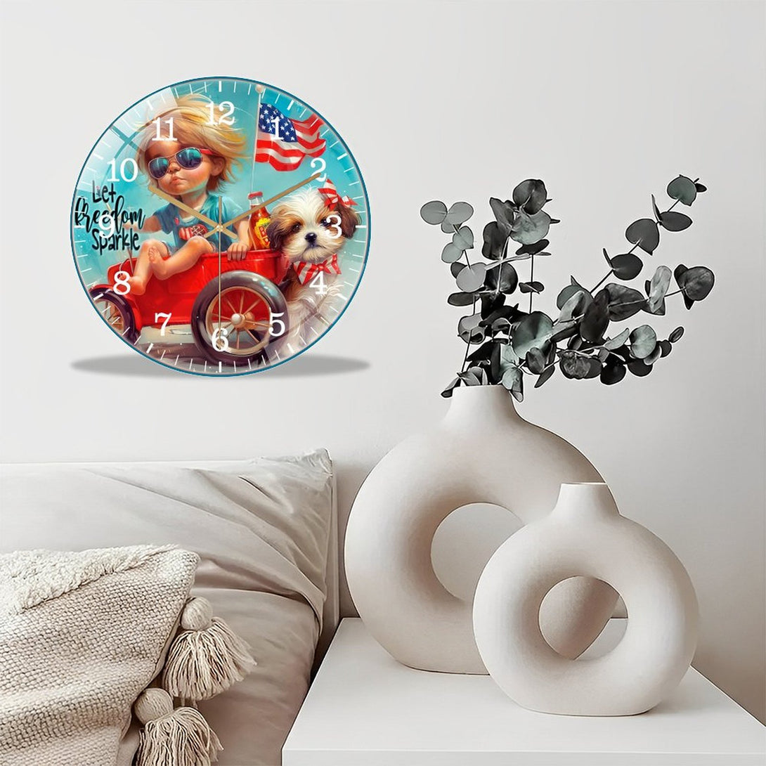 Decor Wall Clocks: Patriotic Glass Wall Clock, Cute Boy 4rth of July Decor Wall Clock for Homes, Bars, Offices, Man Caves, Garages, And Living Rooms .Also Makes A Great Gift.