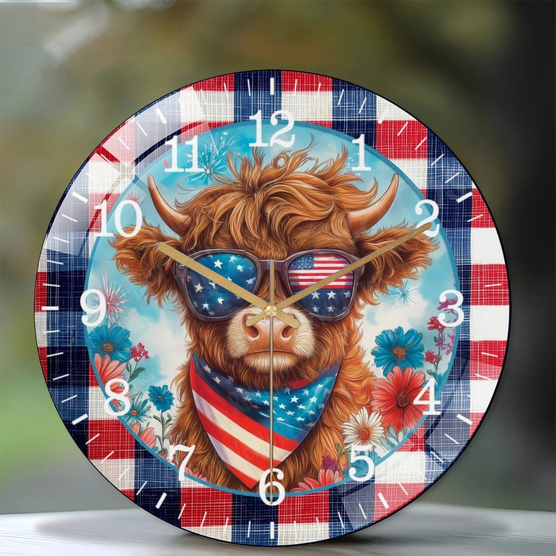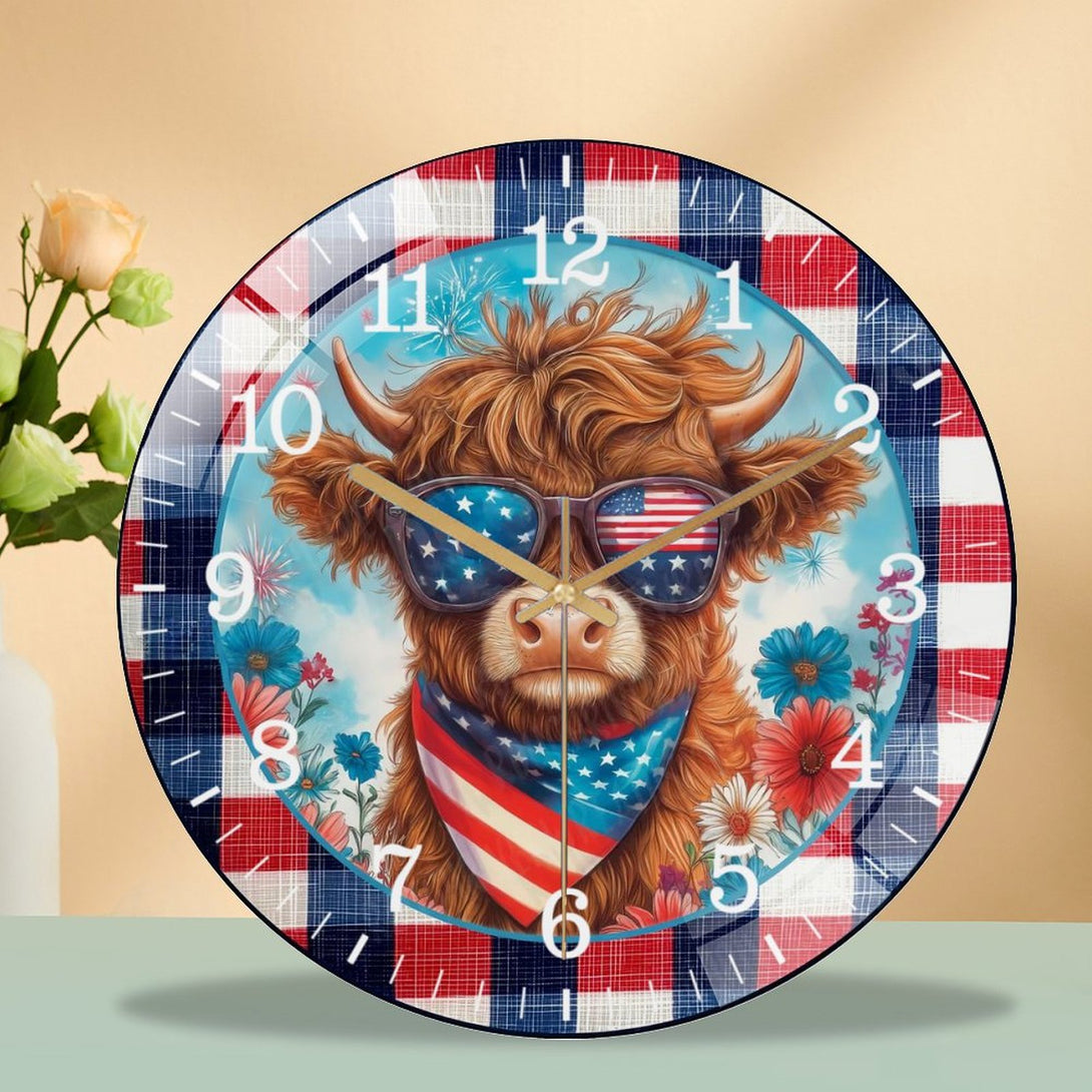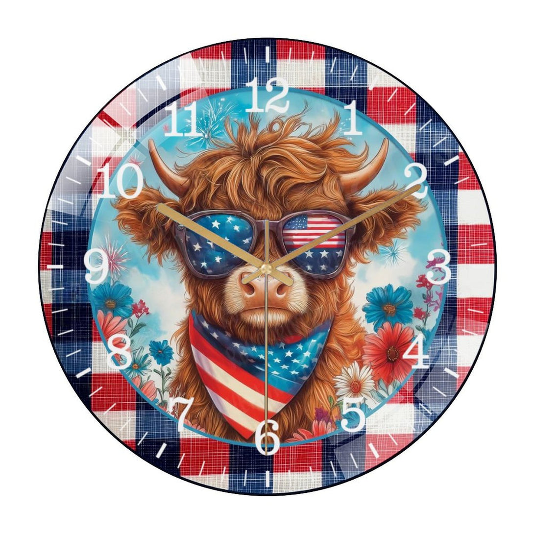 Decor Wall Clocks: Patriotic Highl And Cow Wearing Sunglasses Glass Wall Clock, Cool Cow Adorable Patriotic Cow Decor Wall Clock for Homes, Bars, Offices, Man Caves, Garages, And Living Rooms .