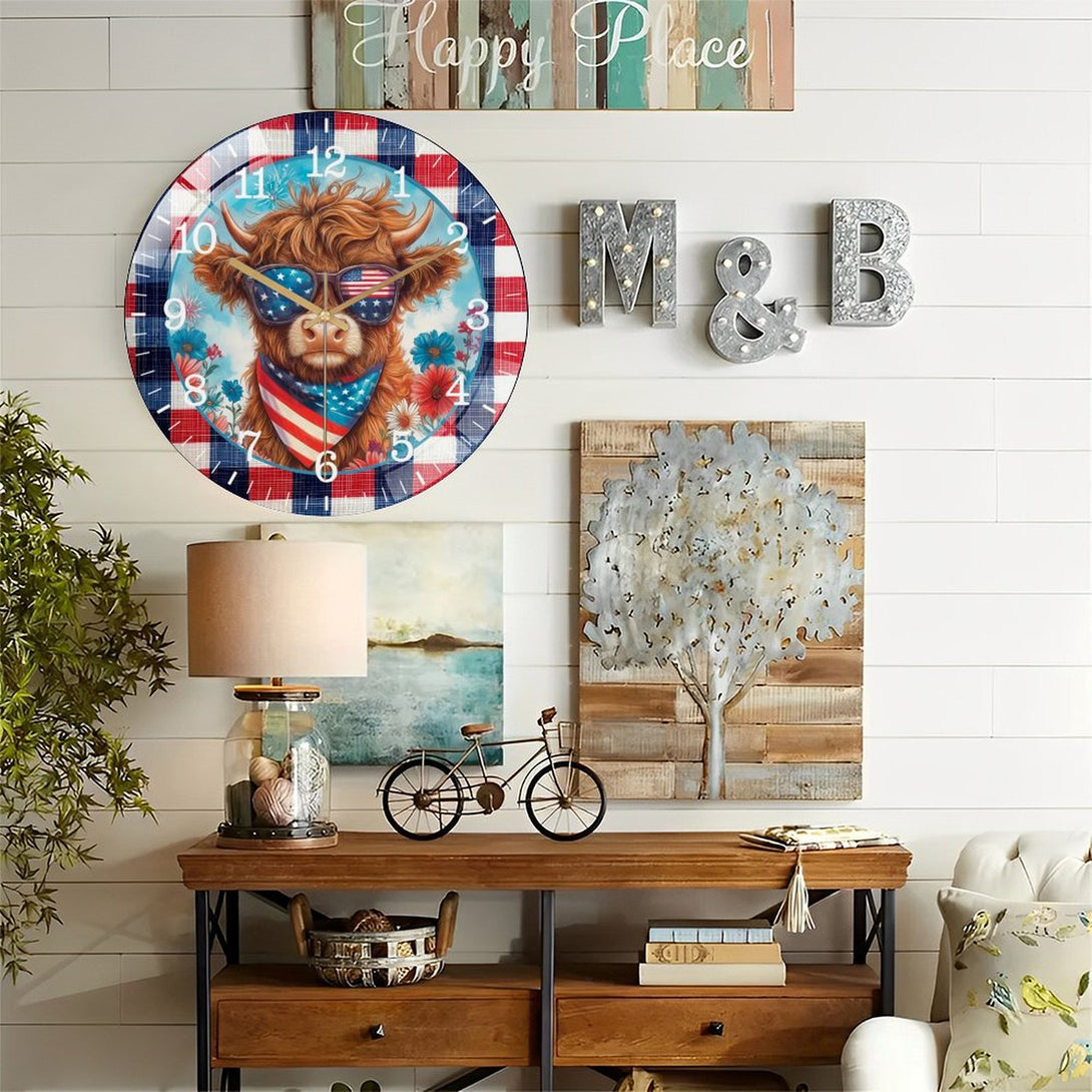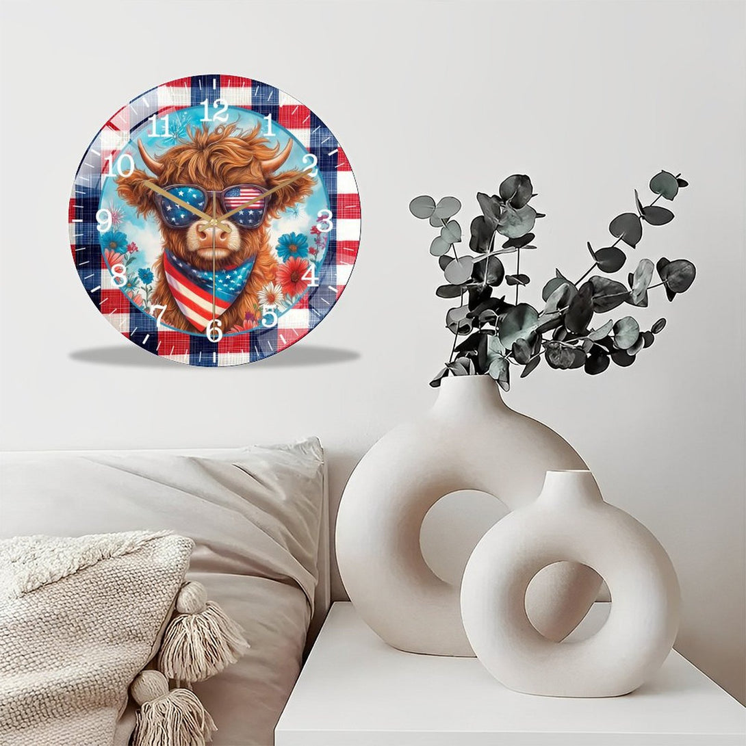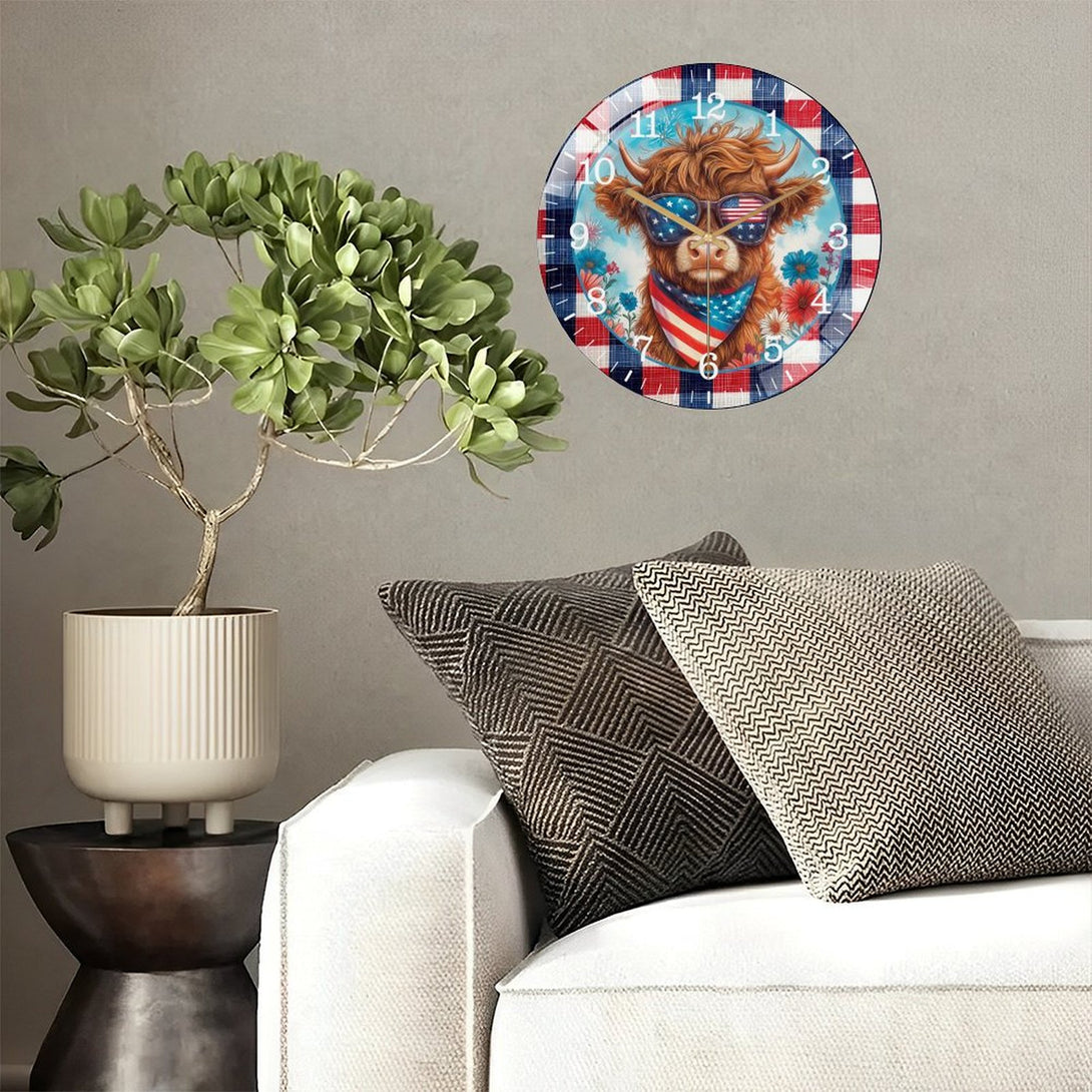 Decor Wall Clocks: Patriotic Highl And Cow Wearing Sunglasses Glass Wall Clock, Cool Cow Adorable Patriotic Cow Decor Wall Clock for Homes, Bars, Offices, Man Caves, Garages, And Living Rooms .