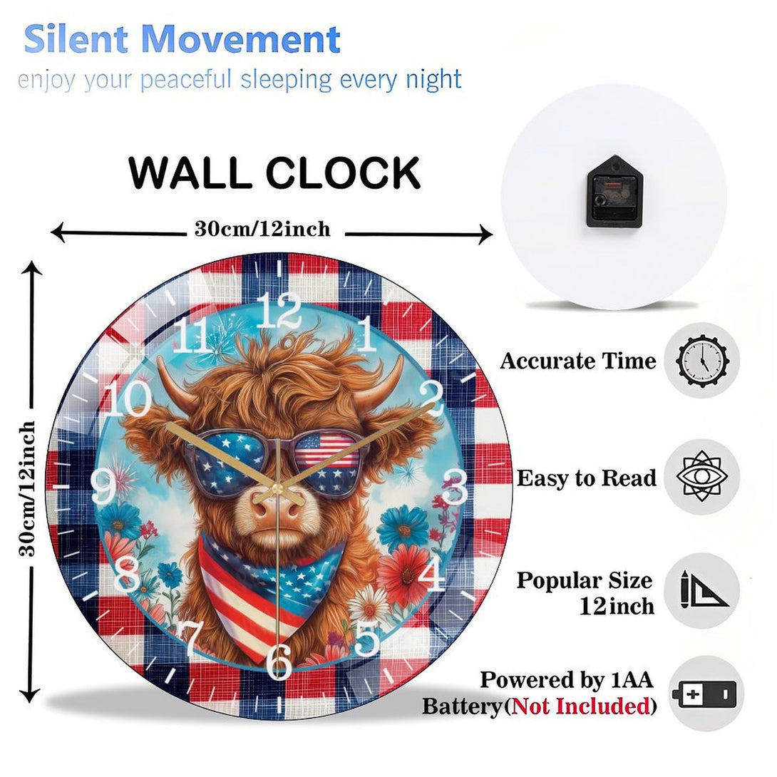 Patriotic Highl And Cow Wearing Sunglasses Glass Wall Clock, Cool Cow Adorable Patriotic Cow Decor Wall Clock for Homes, Bars, Offices, Man Caves, Garages, And Living Rooms .Also Ma,12×12inch(30×30cm)
