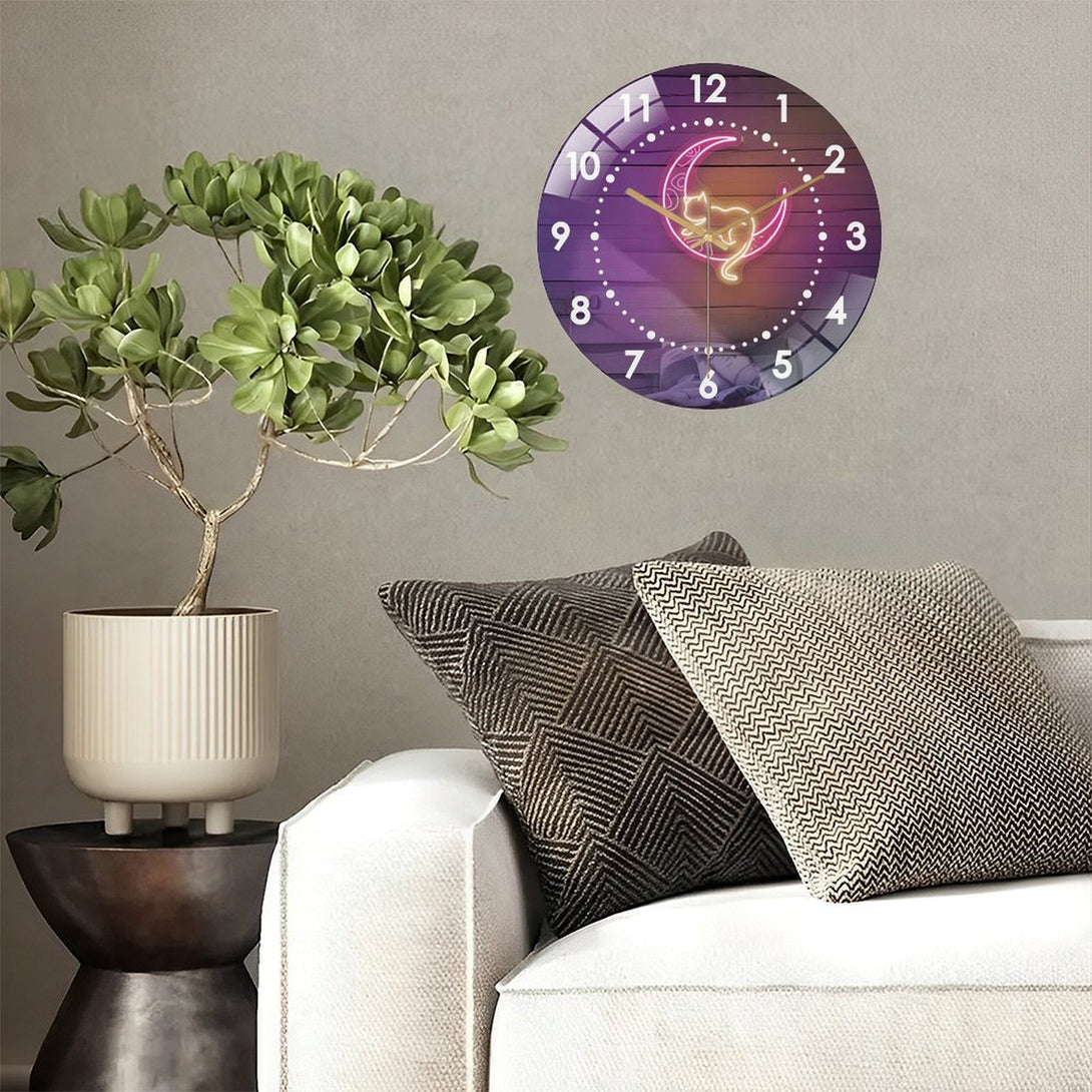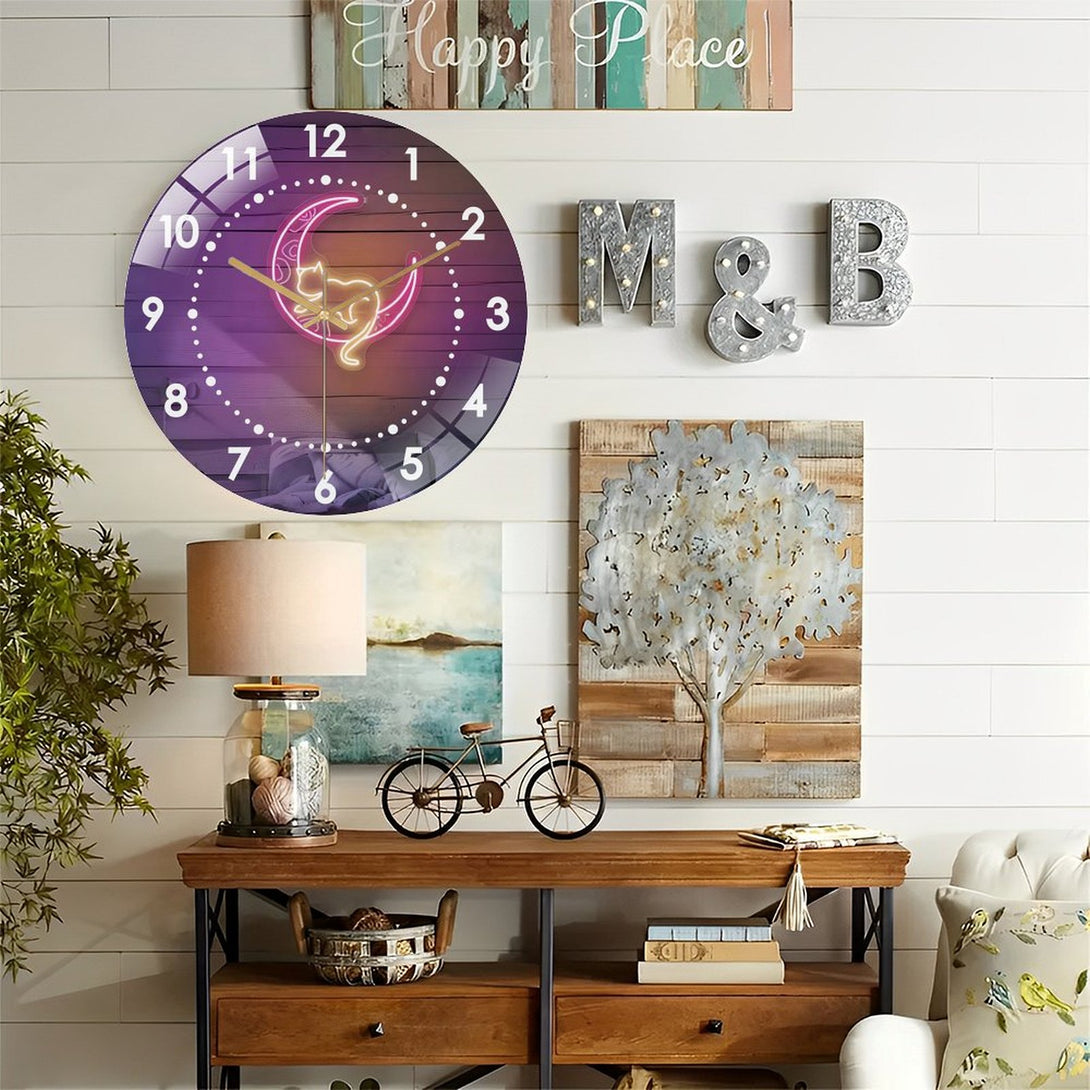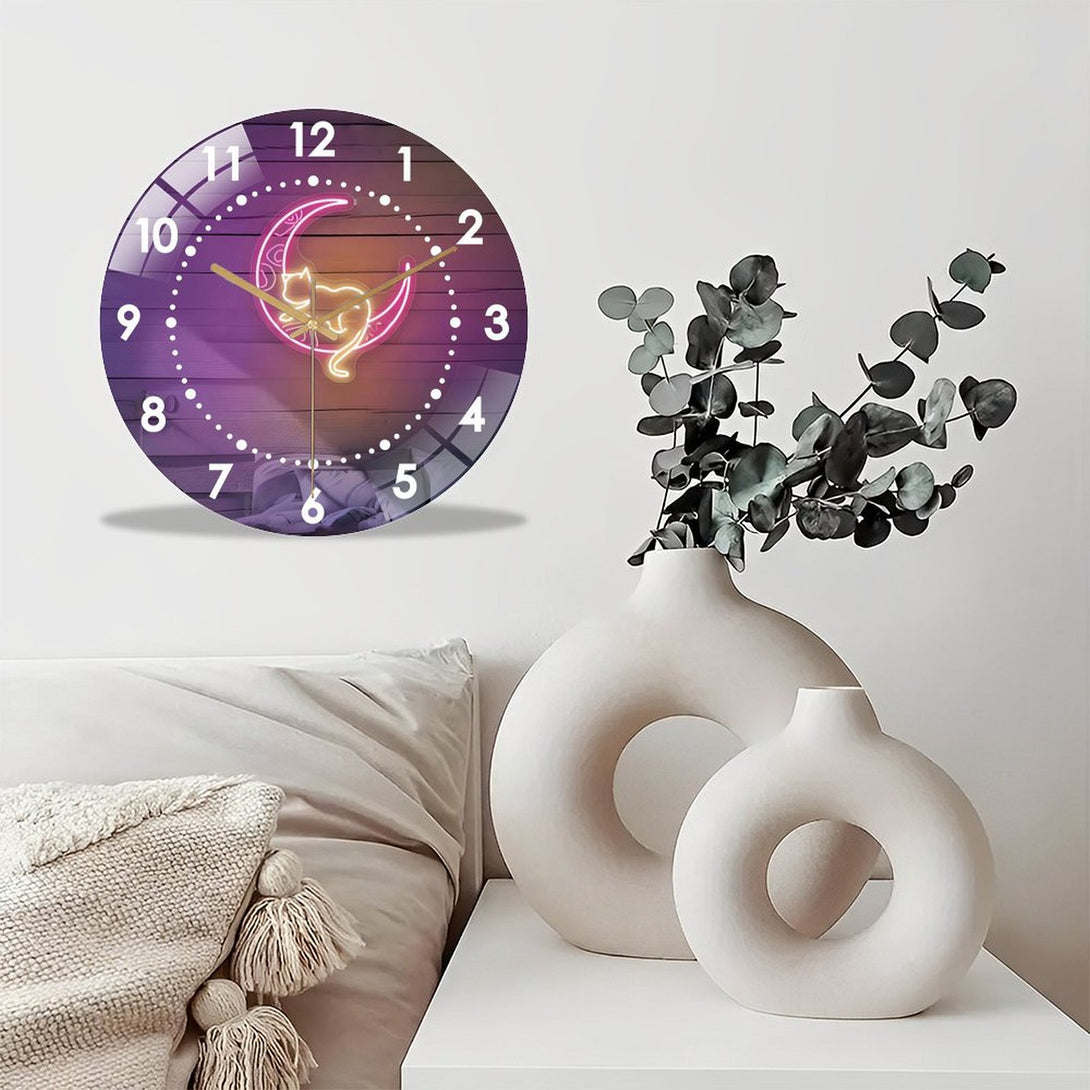 Decor Wall Clocks: Pink Moon And Cat Glass Wall Clock,Witchy Vibes Cat LoversDecor Wall Clock, for Homes, Bars, Offices, Man Caves, Garages, And Living Rooms. Hallo-ween Gift .Also Makes A Grea.