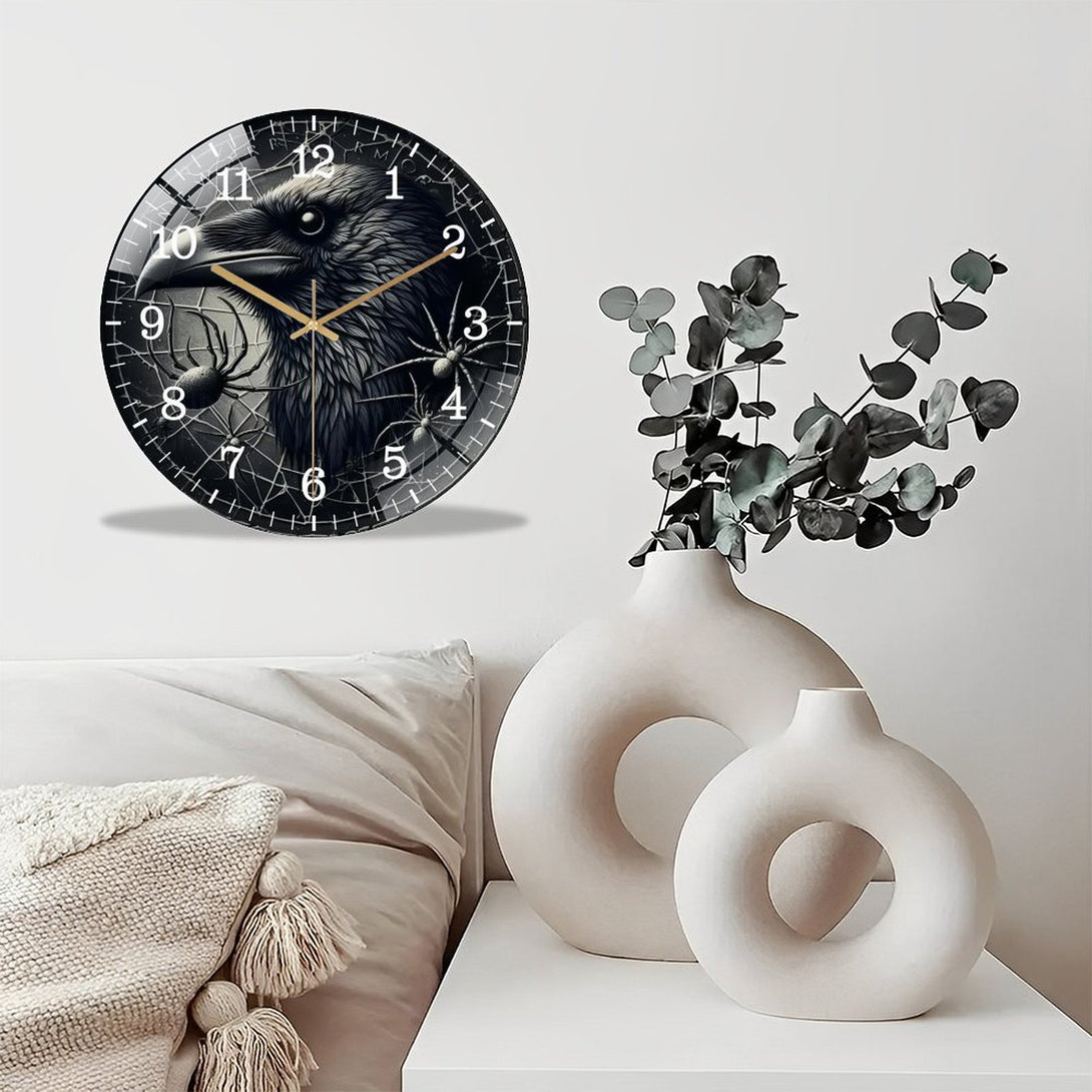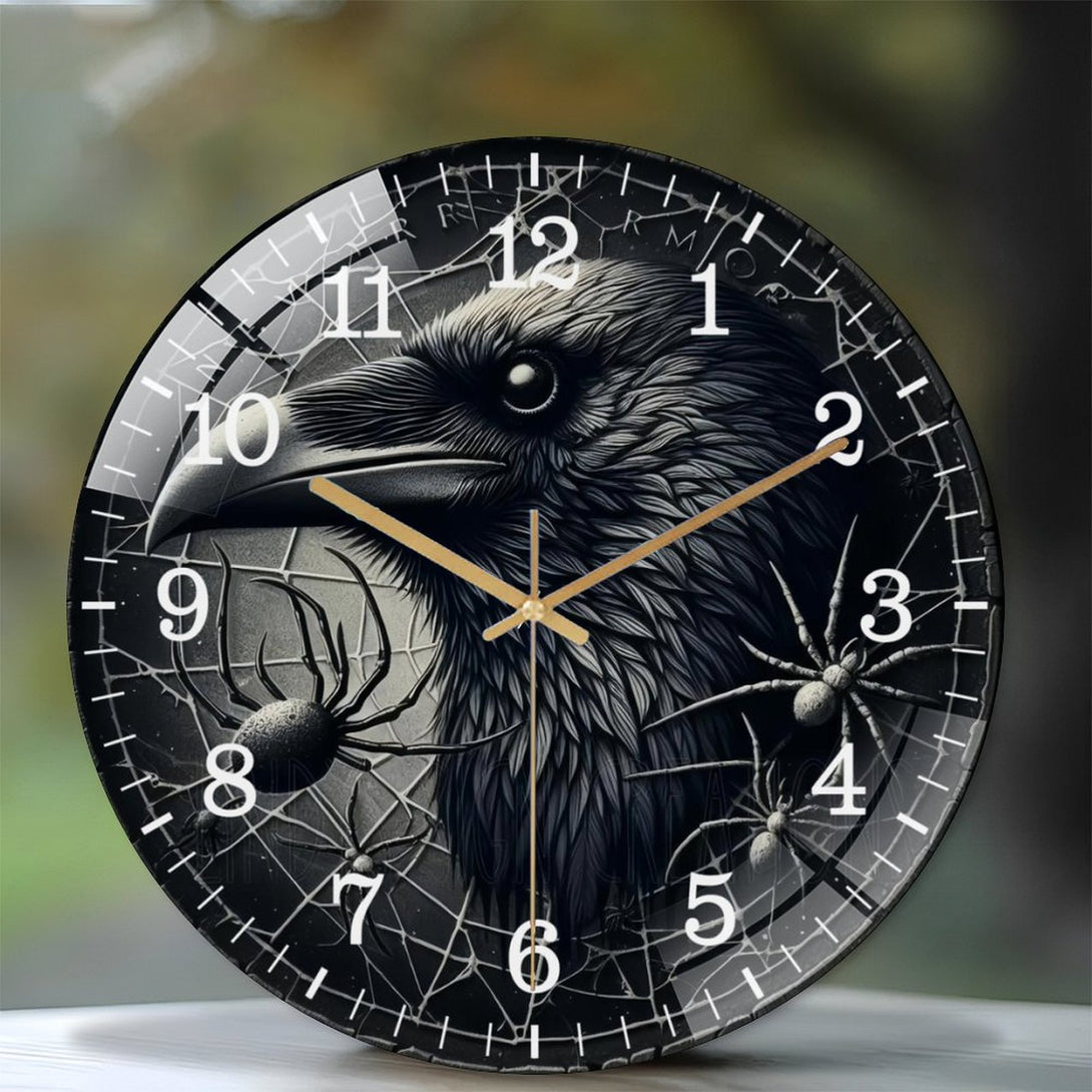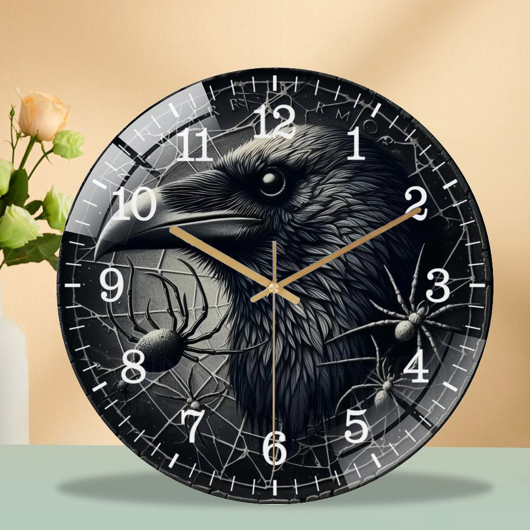 Raven Head And Spiders Hallo-ween Glass Wall Clock, Fall Decor Wall Clock for Homes, Bars, Offices, Man Caves, Garages, And Living Rooms. Hallo-ween Gift,12×12inch(30×30cm)