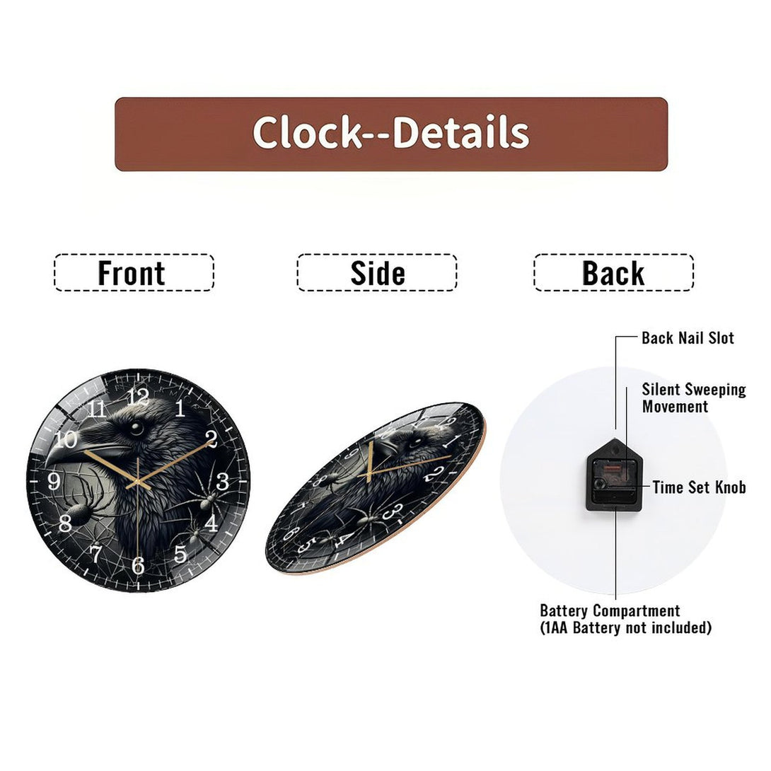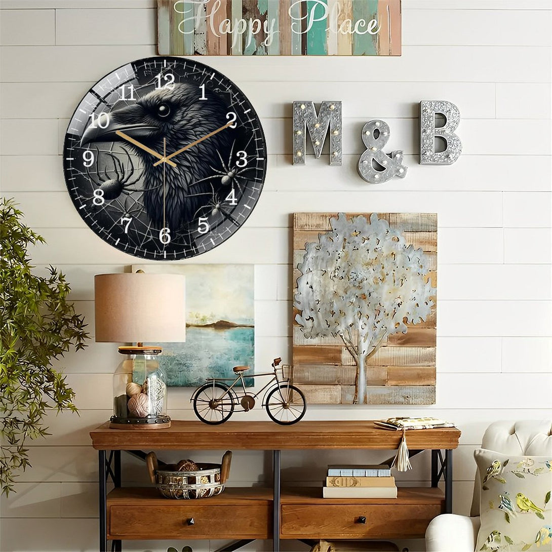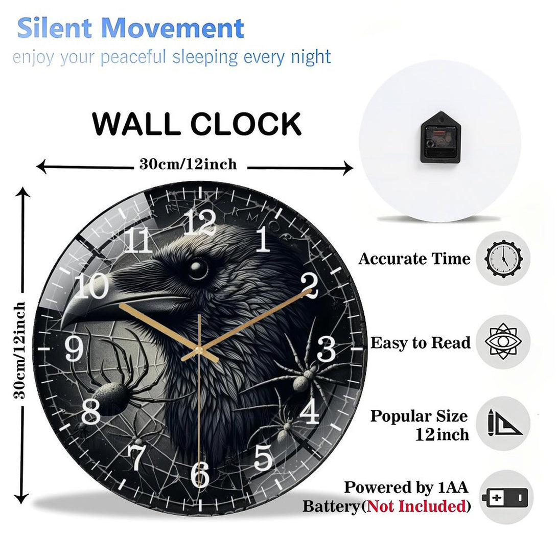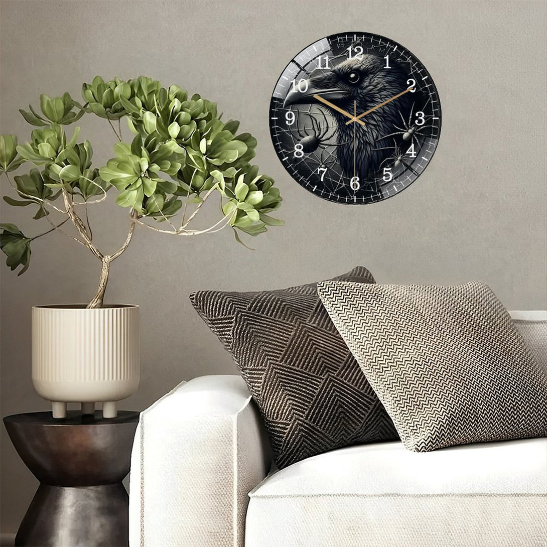 Raven Head And Spiders Hallo-ween Glass Wall Clock, Fall Decor Wall Clock for Homes, Bars, Offices, Man Caves, Garages, And Living Rooms. Hallo-ween Gift,12×12inch(30×30cm)