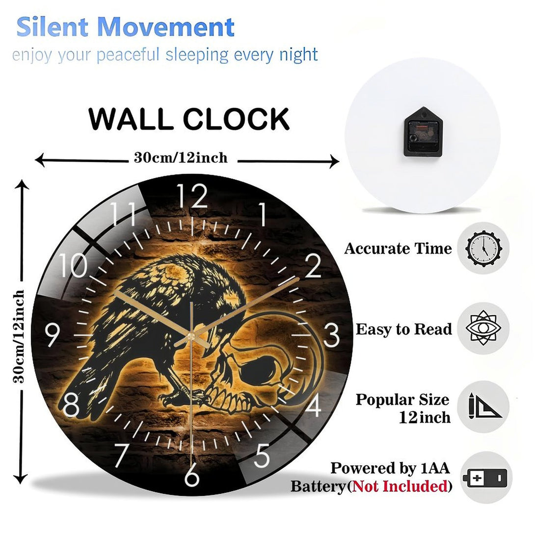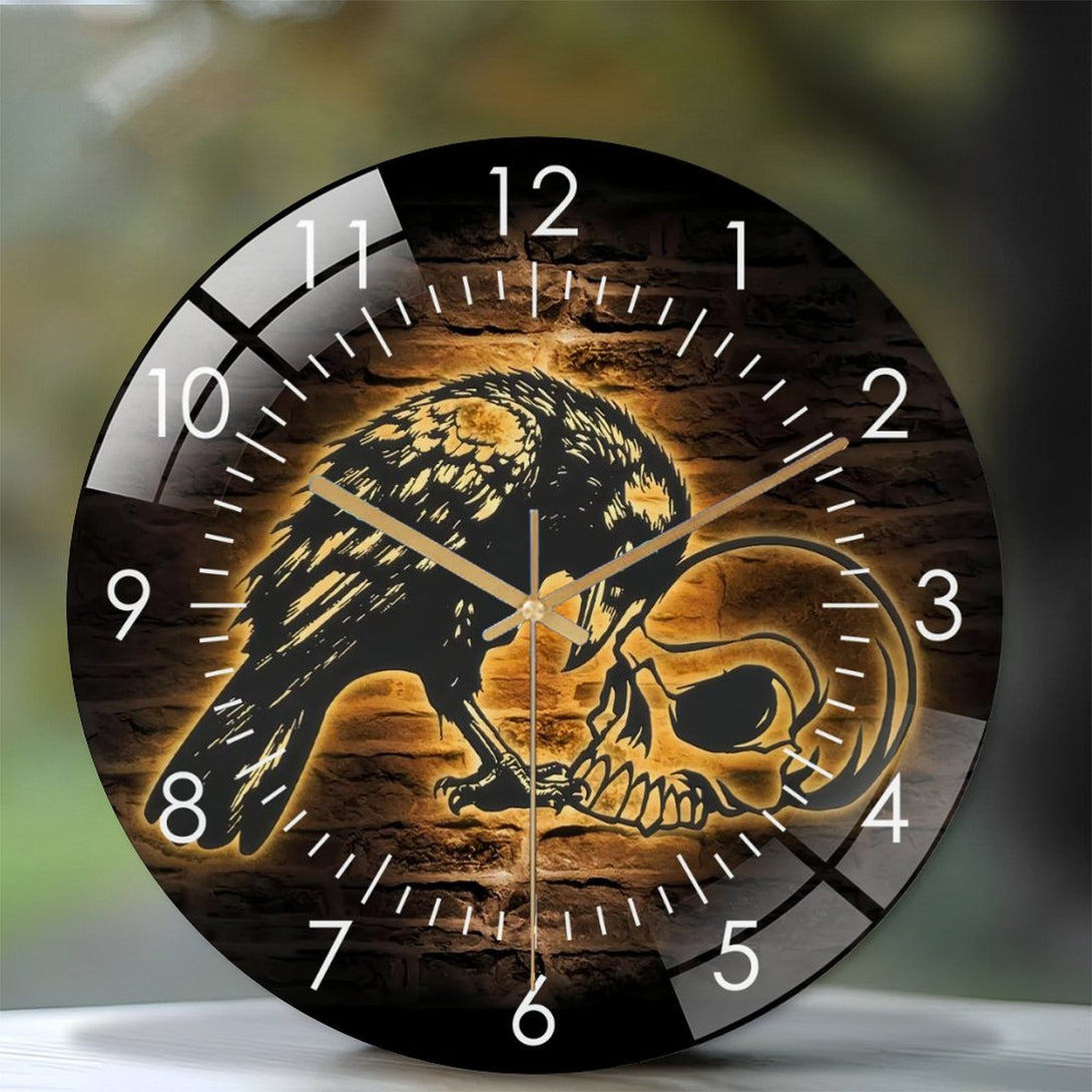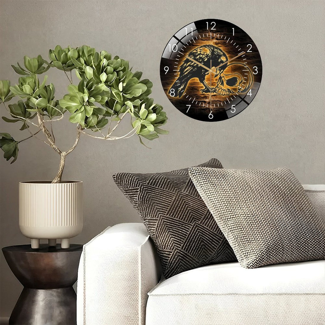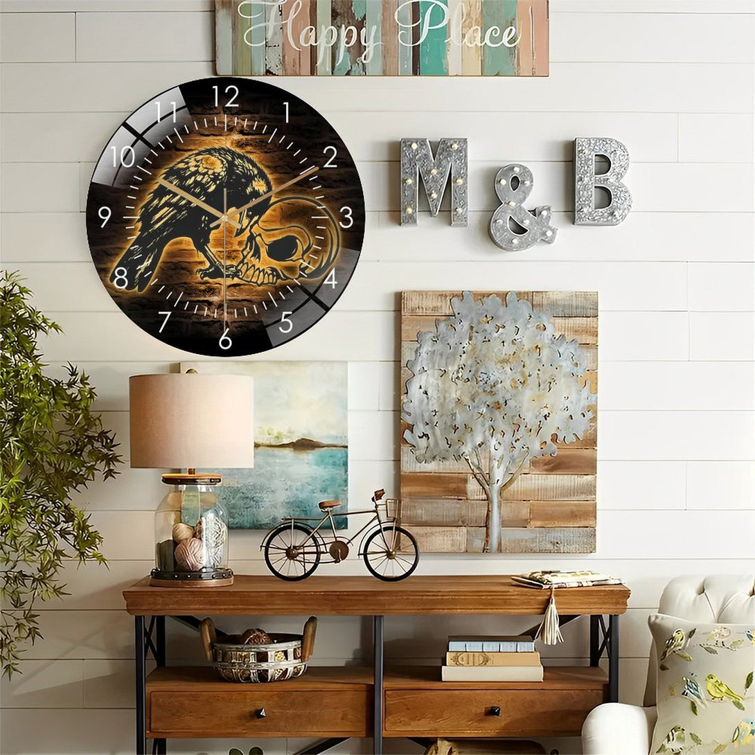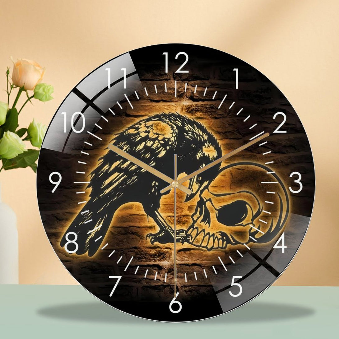 Decor Wall Clocks: Raven With Skull Glass Wall Clock,Crow Horror Bird Decoration Wall Clock, for Homes, Bars, Offices, Man Caves, Garages, And Living Rooms. Halloween Nursery Decoration Man
