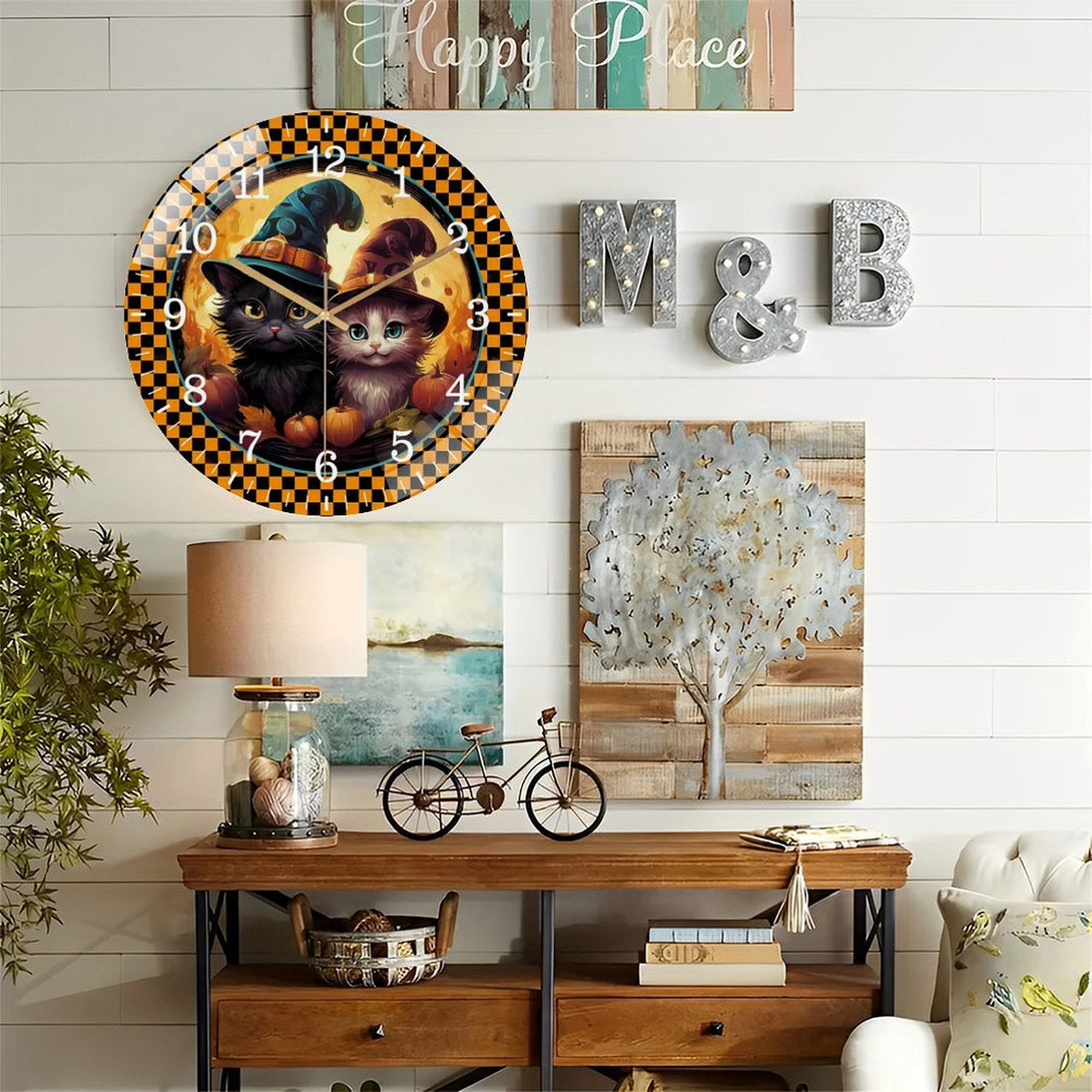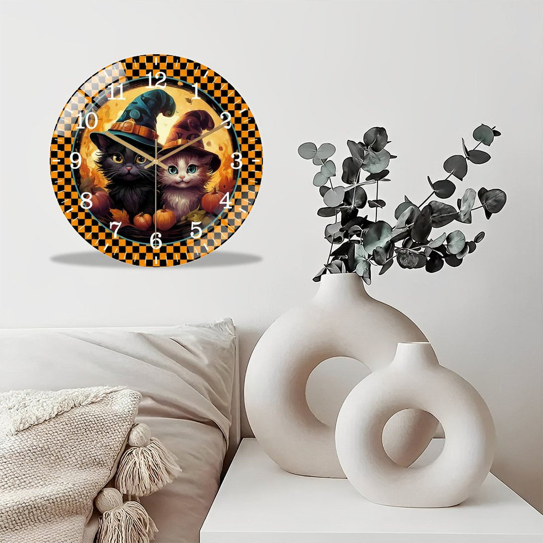 Decor Wall Clocks: Round Hallo-ween Black Cat Wreath Glass Wall Clock for Homes, Bars, Offices, Man Caves, Garages, And Living Rooms. Also Makes A Great Gift. Style 12×12inch(30×30cm)