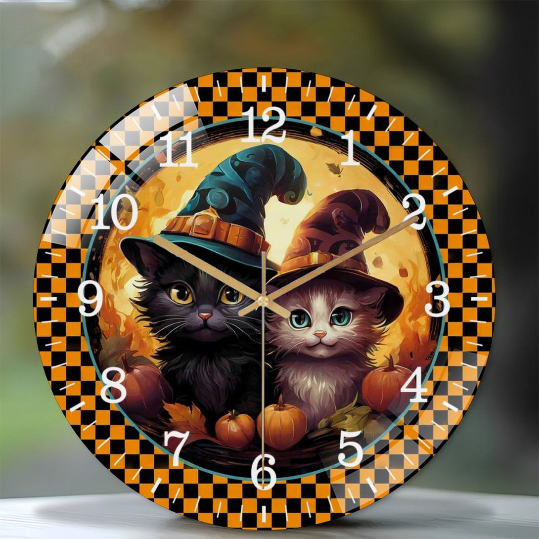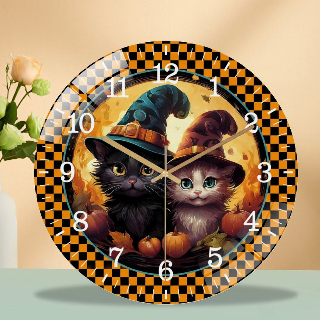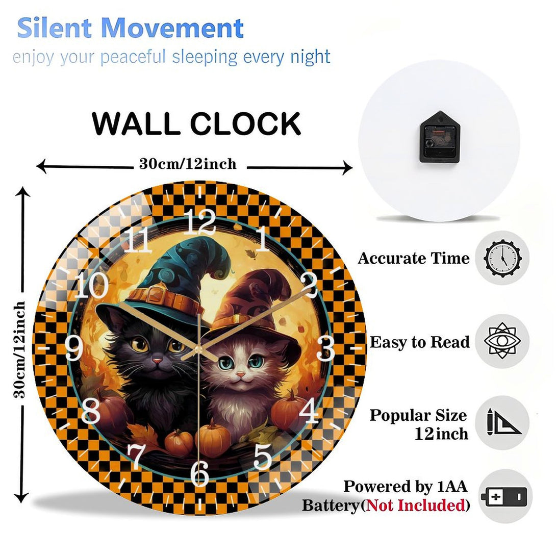 Round Hallo-ween Black Cat Wreath Glass Wall Clock for Homes, Bars, Offices, Man Caves, Garages, And Living Rooms. Also Makes A Great Gift.,12×12inch(30×30cm)