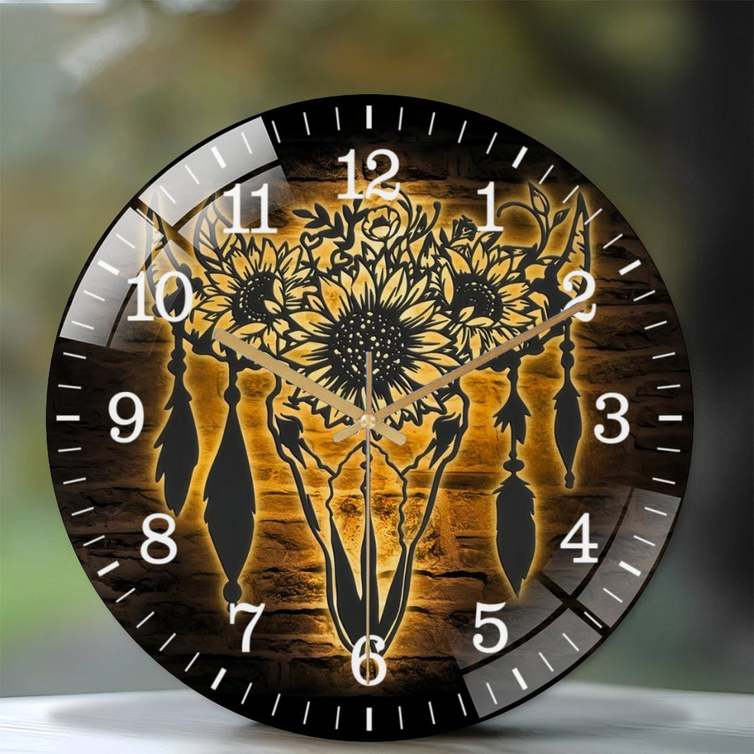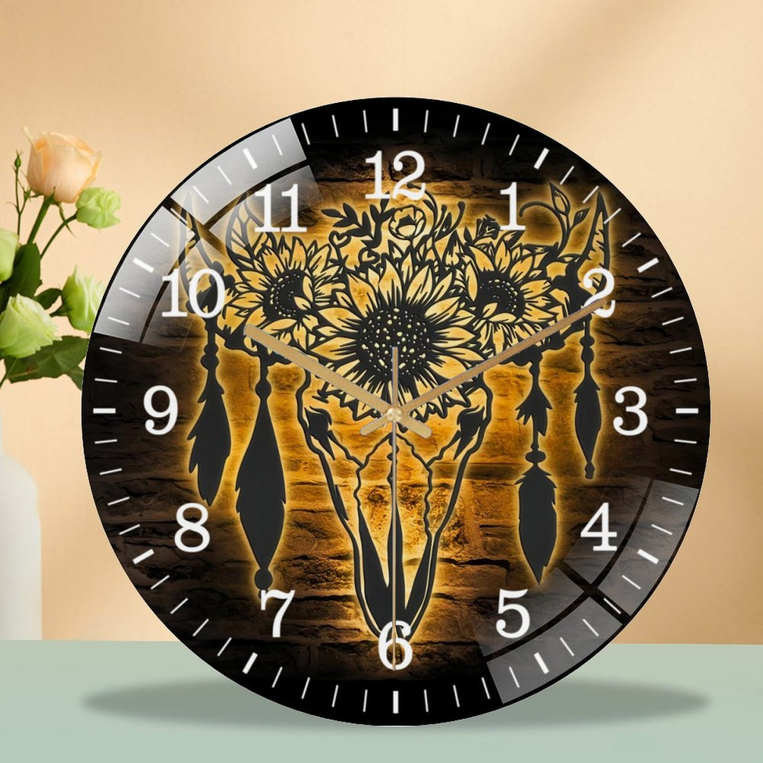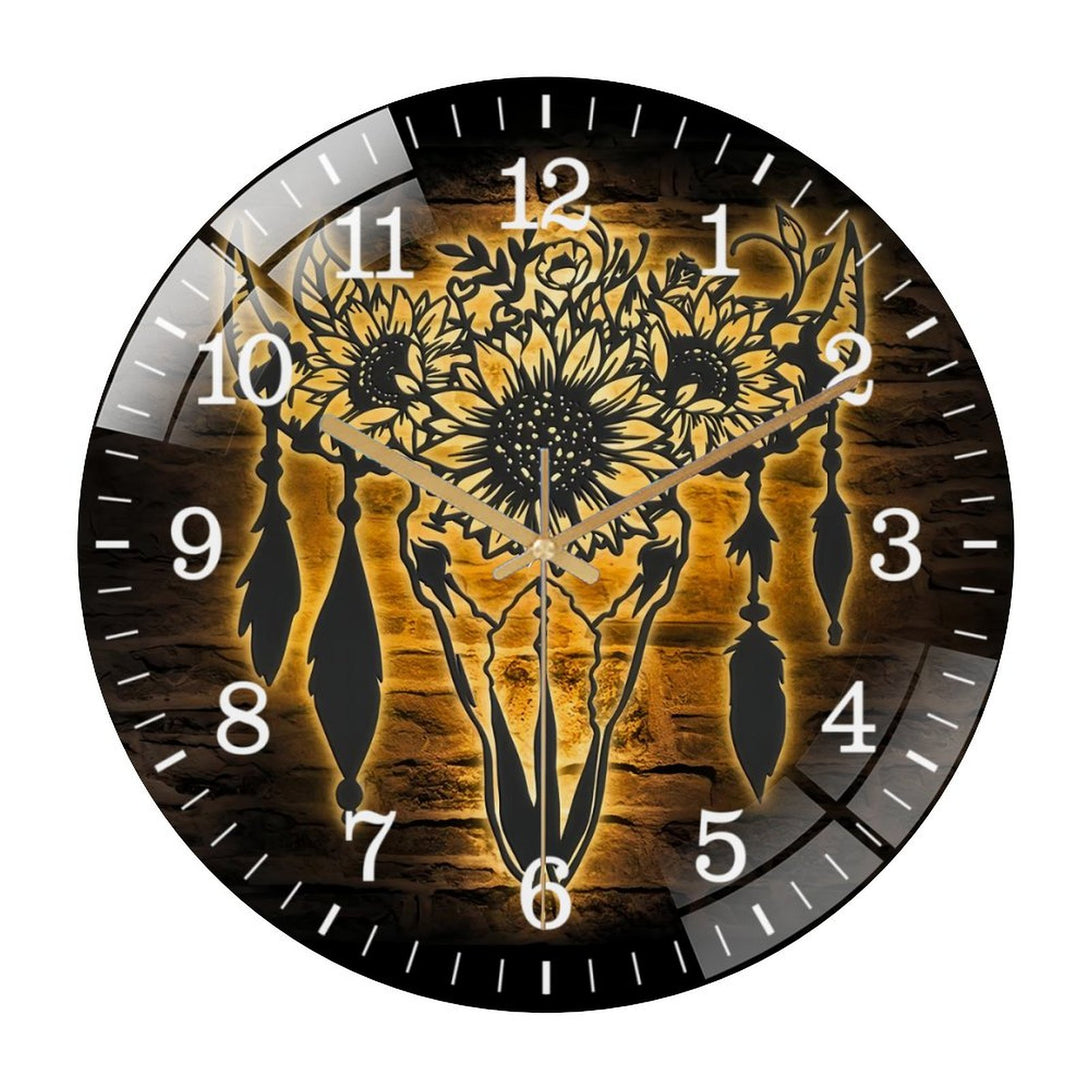Sunflower Cow Skull Farmhouse Glass Wall Clocks,Floral Boho Buffalo Longhorn Glass Wall Clocks,Home Decor Heifer Barn Nursery Decoration Xmas