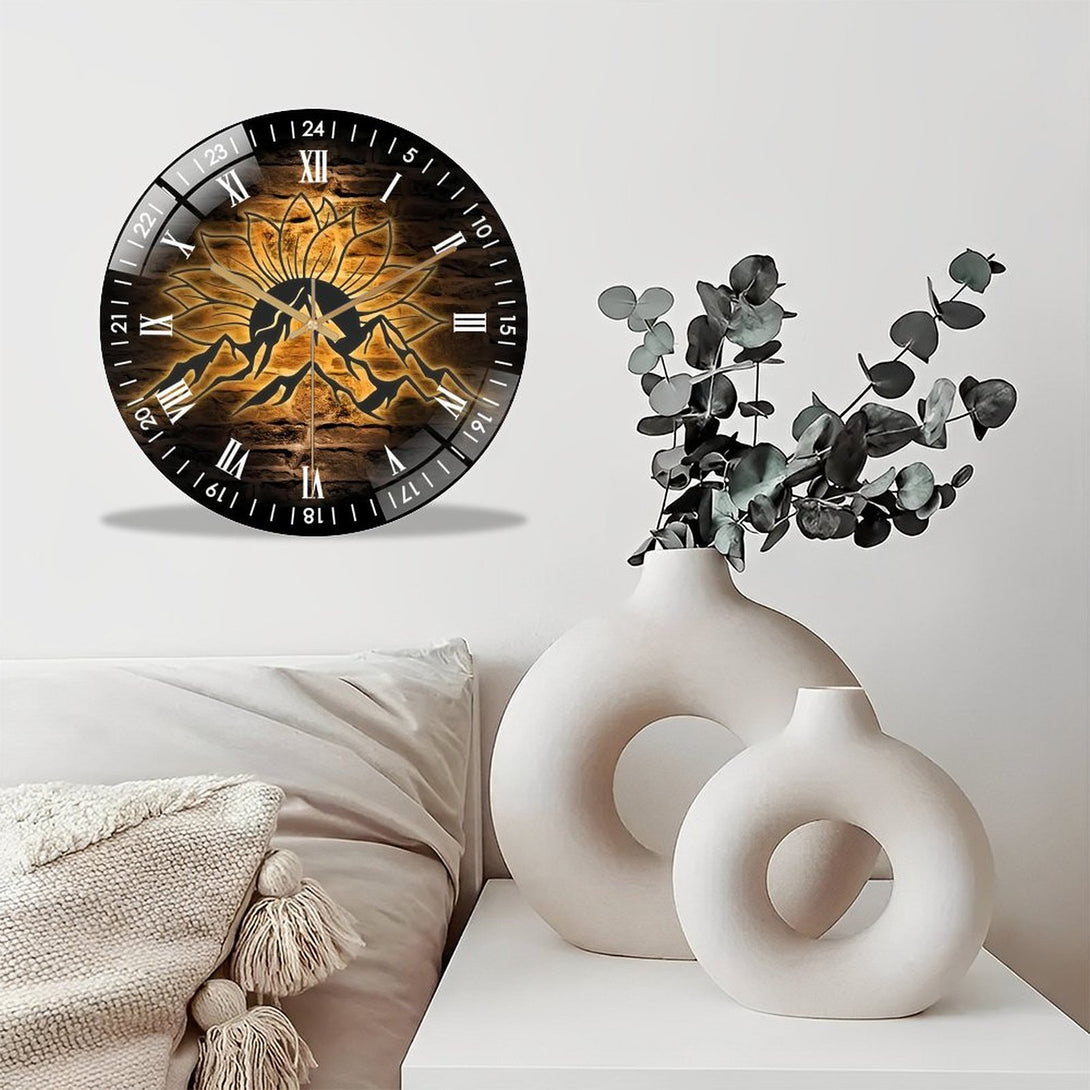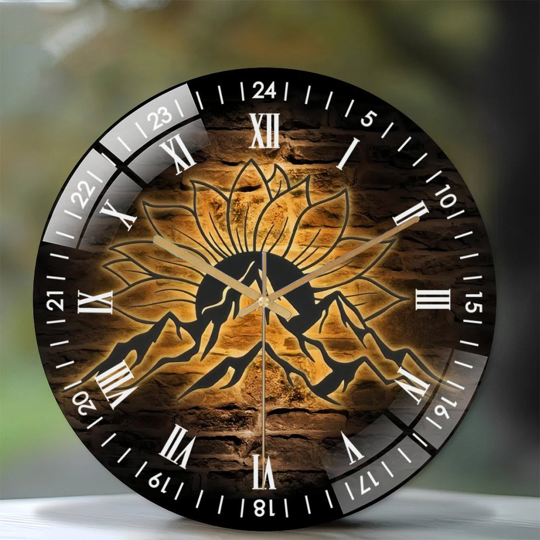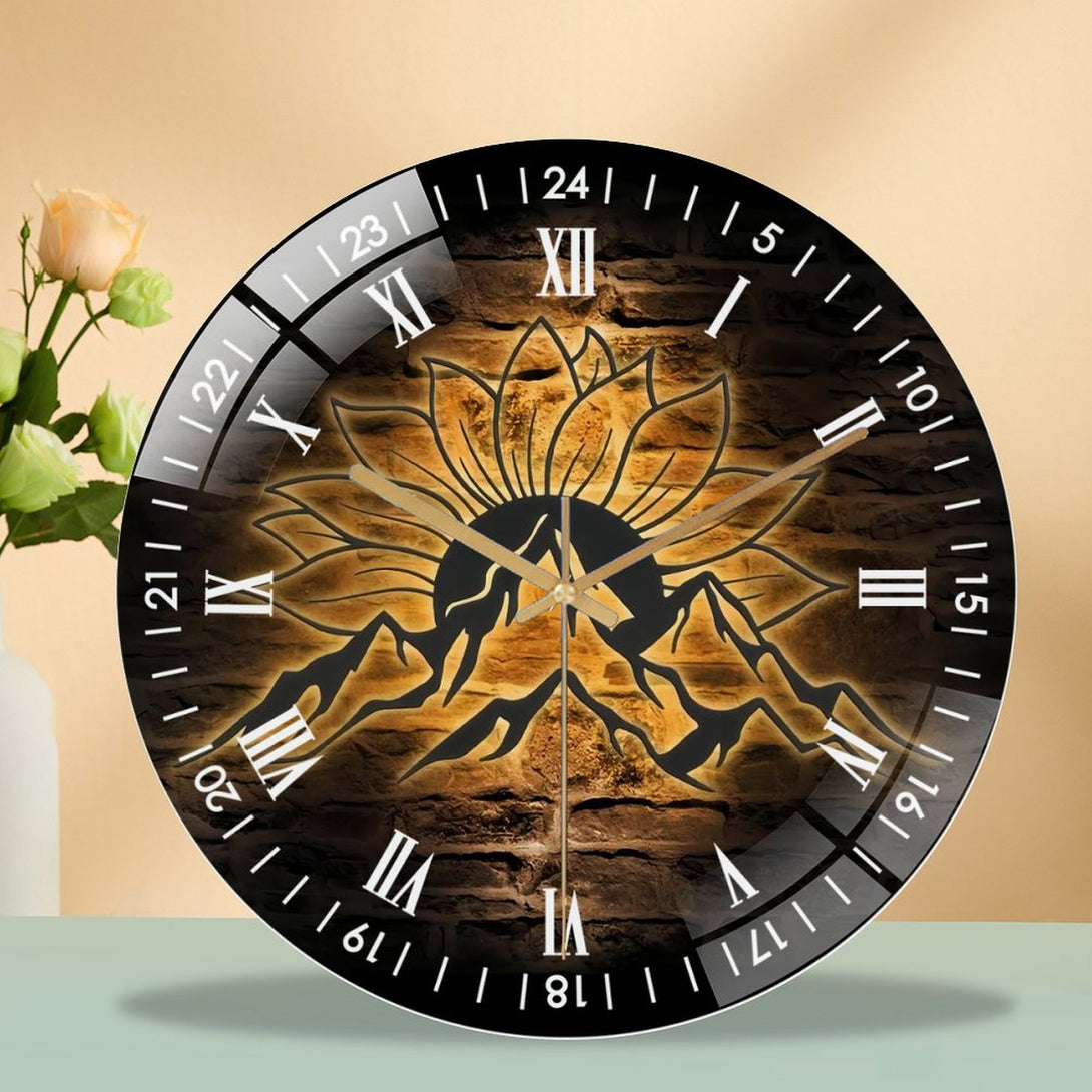 Sunflower Mountain Sunset Glass Wall Clock,Mountain Sunrise Home Decor Wall Clock, for Homes, Bars, Offices, Man Caves, Garages, And Living Rooms.,12×12inch(30×30cm)