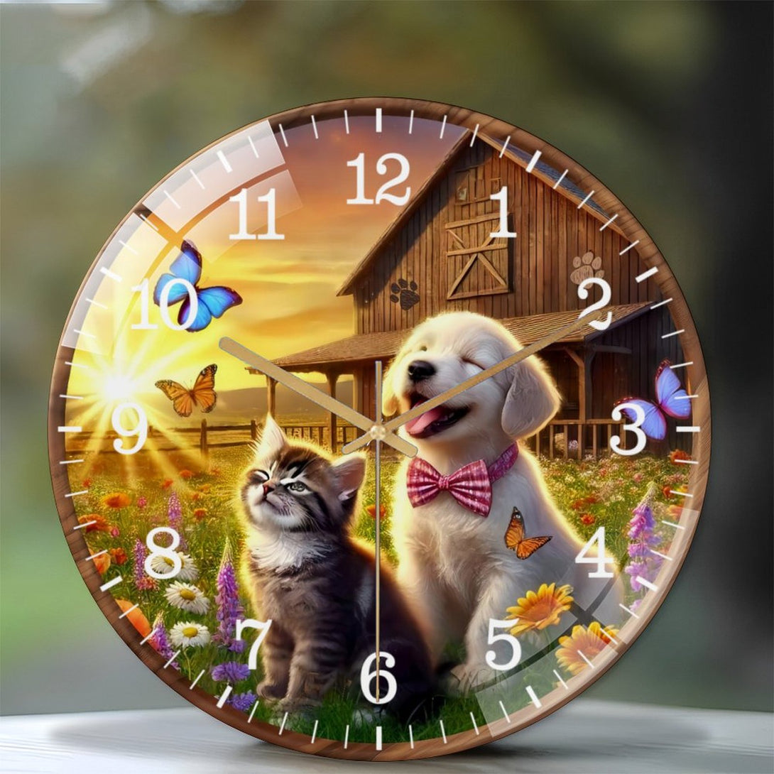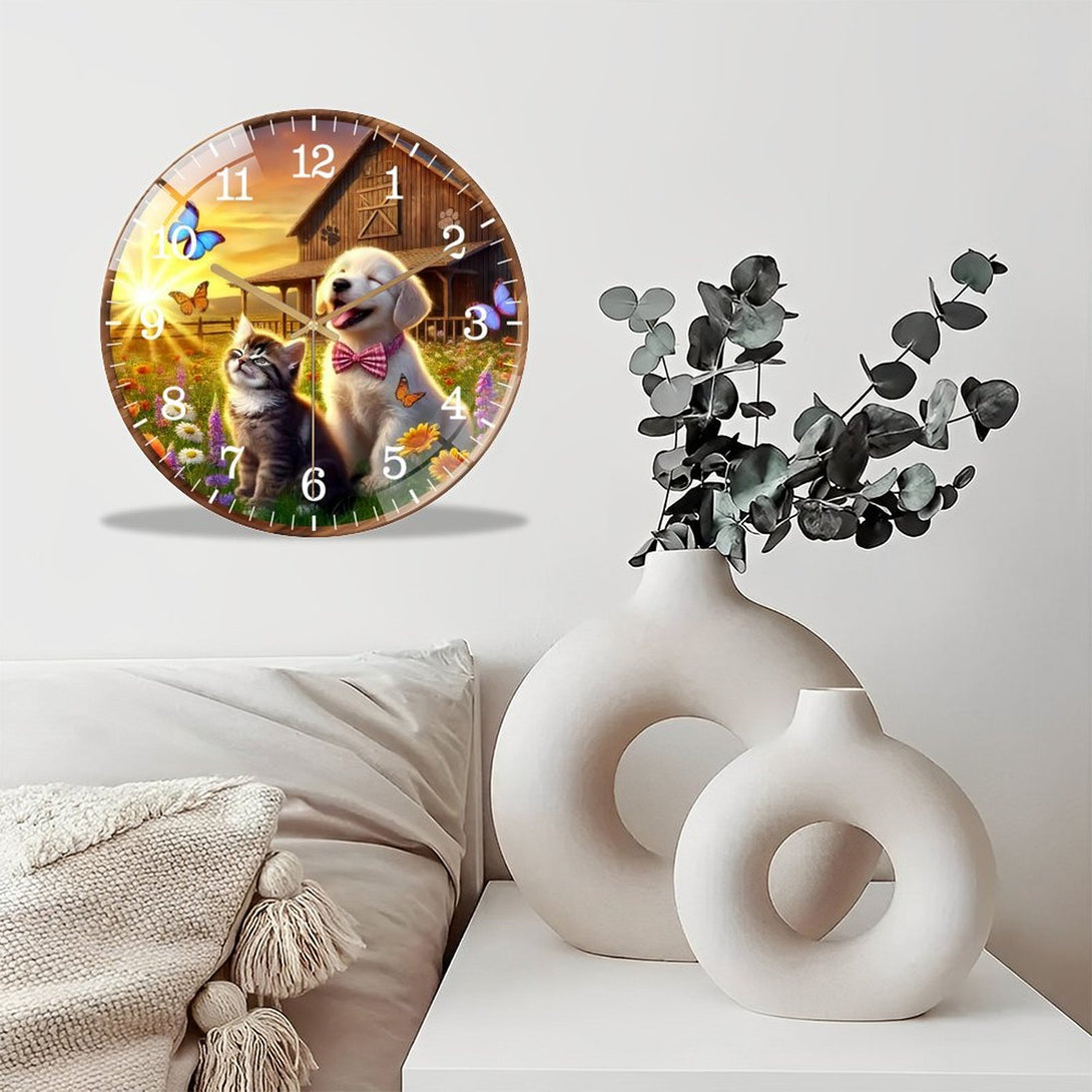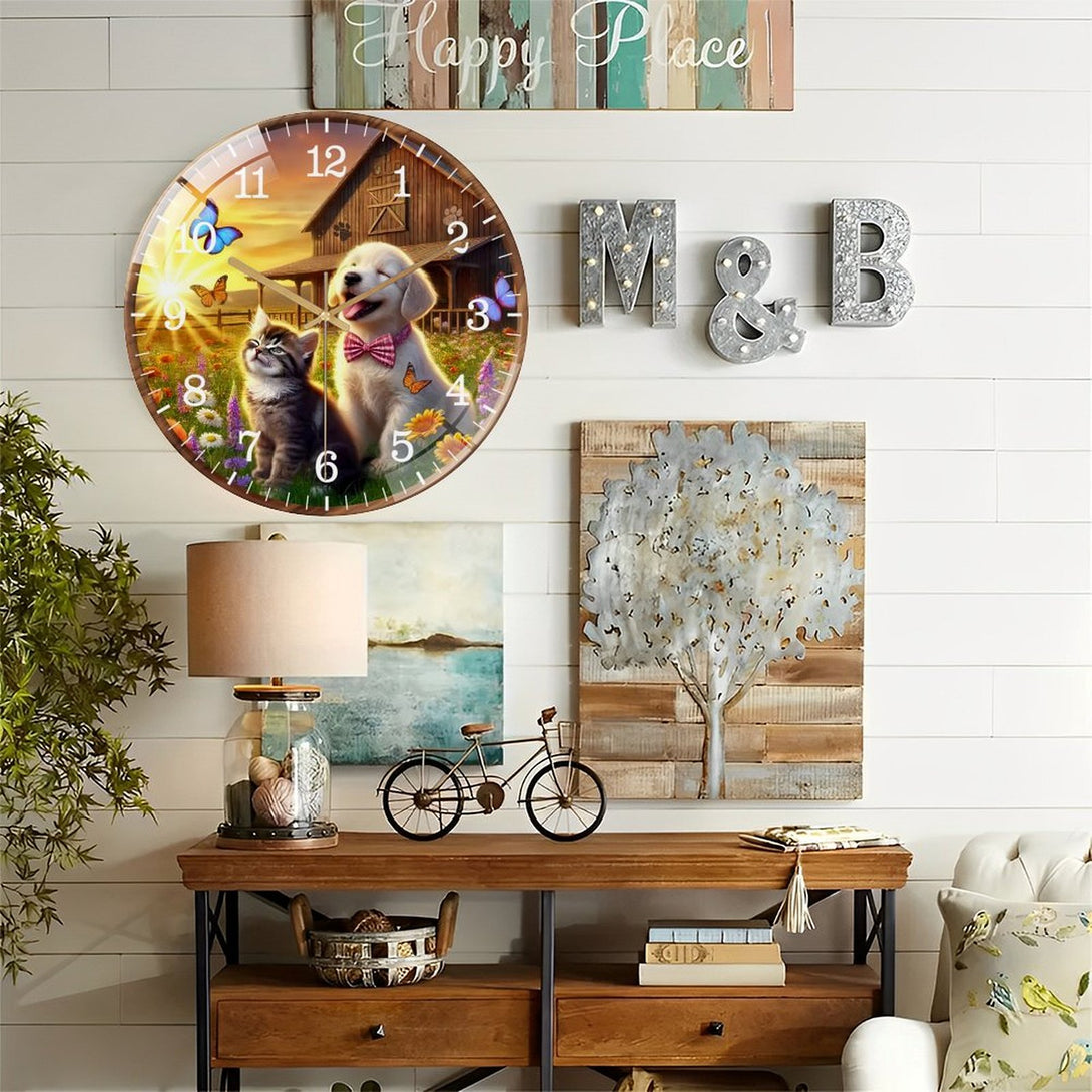 Decor Wall Clocks: Sunshine & Paw Prints Glass Wall Clock,Rustic Farmhouse Dog And CatGlass Wall Clock for Homes, Bars, Offices, Man Caves, Garages, And Living Rooms. Also Makes A Great Gift.