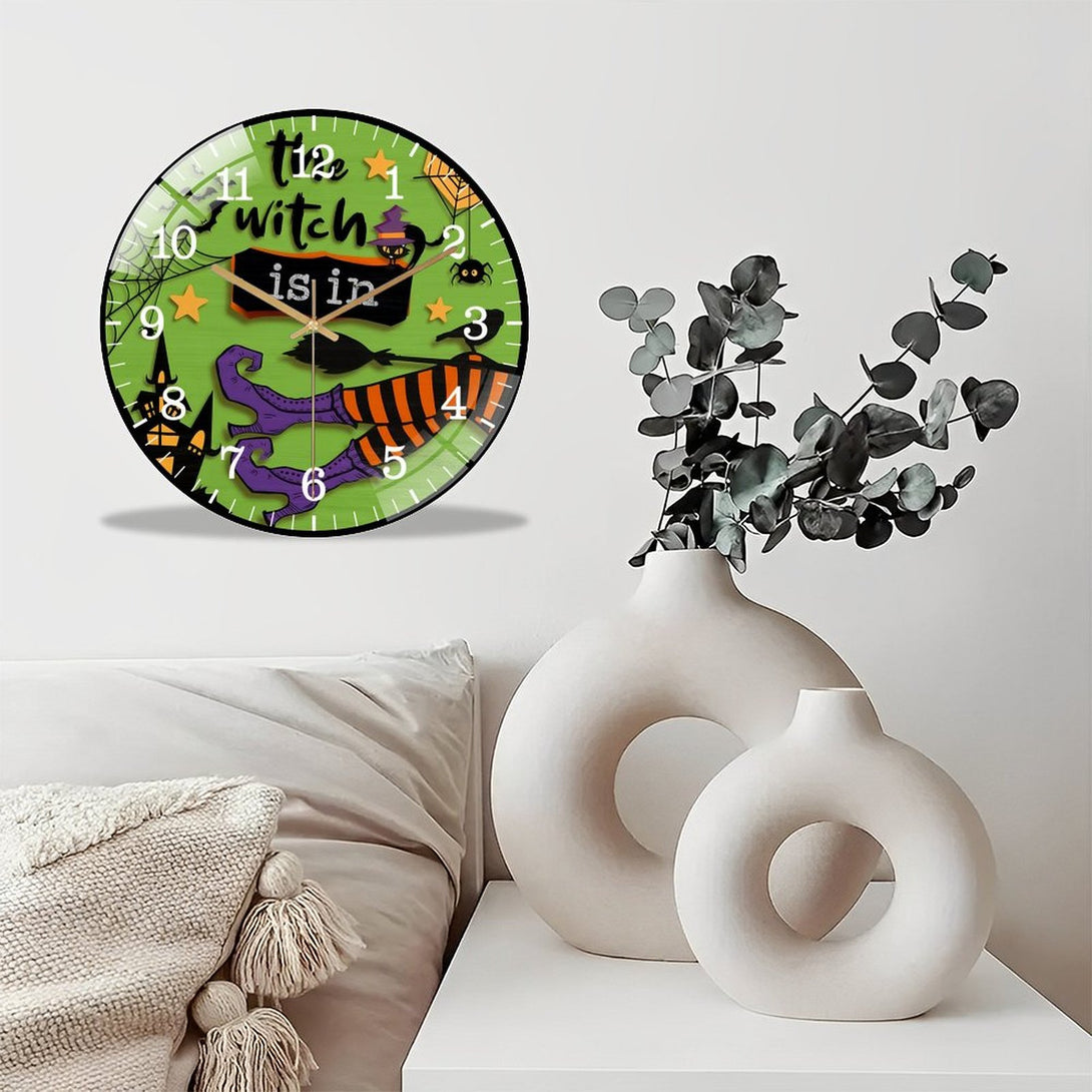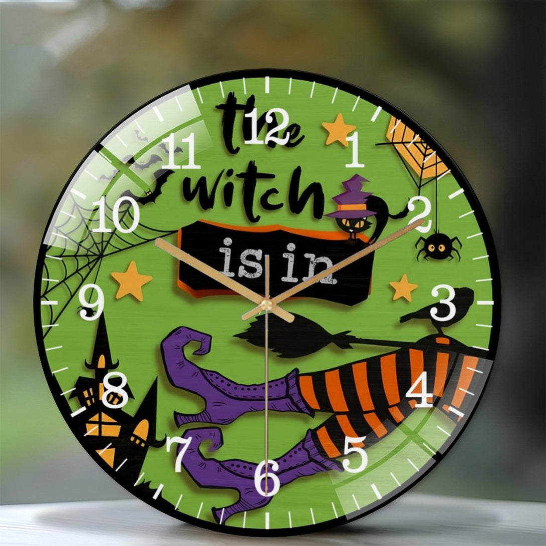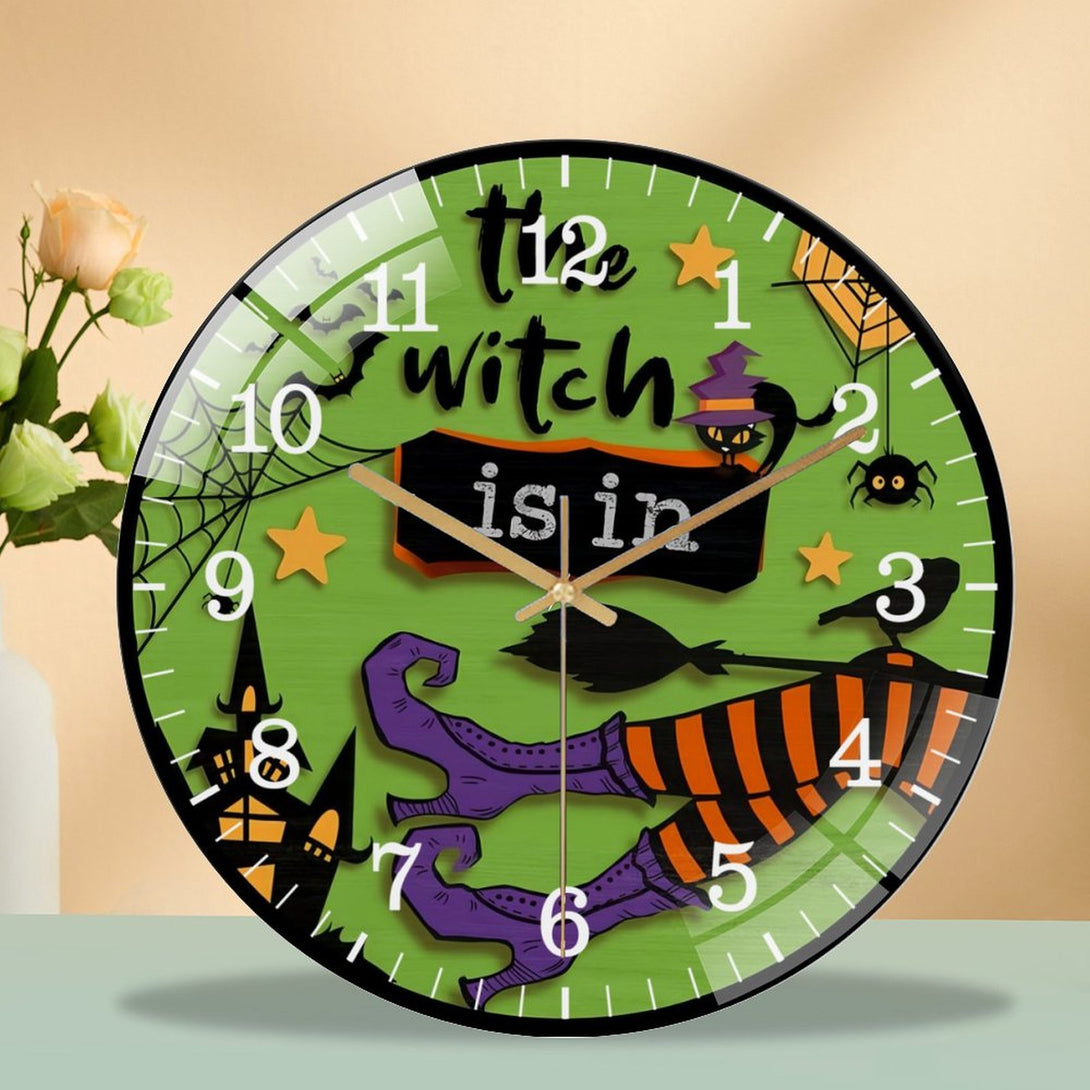 Decor Wall Clocks: The Witch Is In Glass Wall Clock, Hallo-ween Decor, Spooky Season, Halloween Welcome Glass Wall Clock for Homes, Bars, Offices, Man Caves, Garages, And Living Rooms.