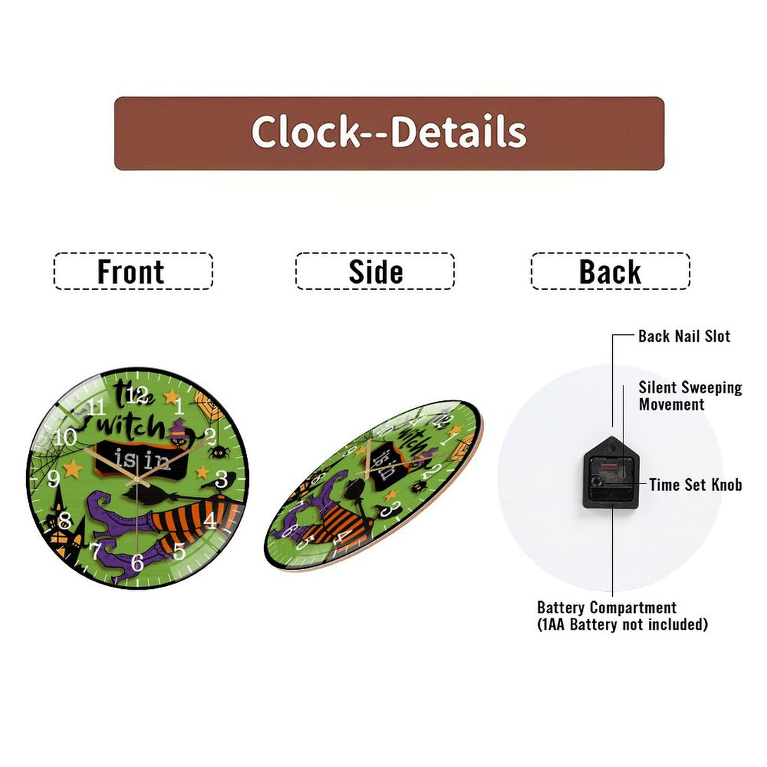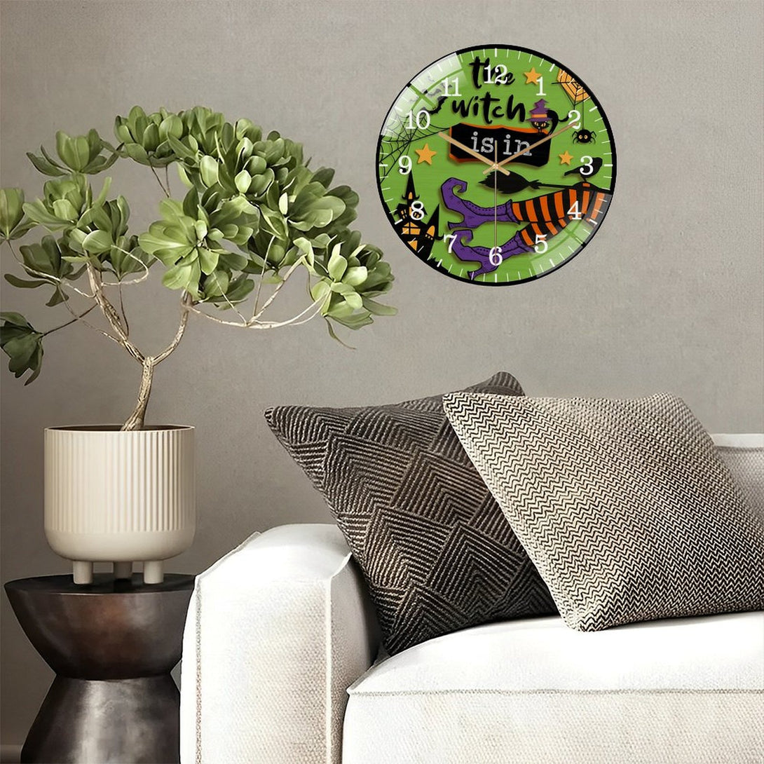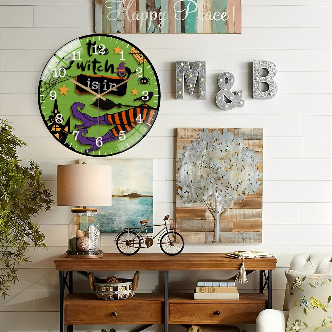 Decor Wall Clocks: The Witch Is In Glass Wall Clock, Hallo-ween Decor, Spooky Season, Halloween Welcome Glass Wall Clock for Homes, Bars, Offices, Man Caves, Garages, And Living Rooms.