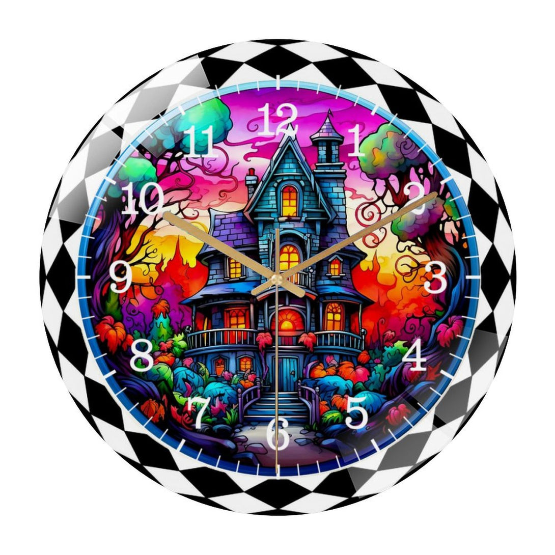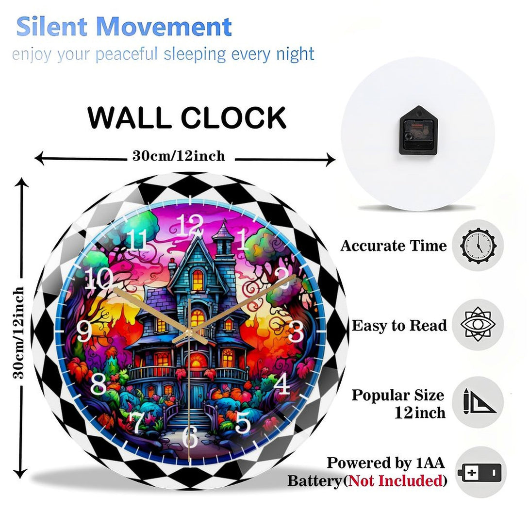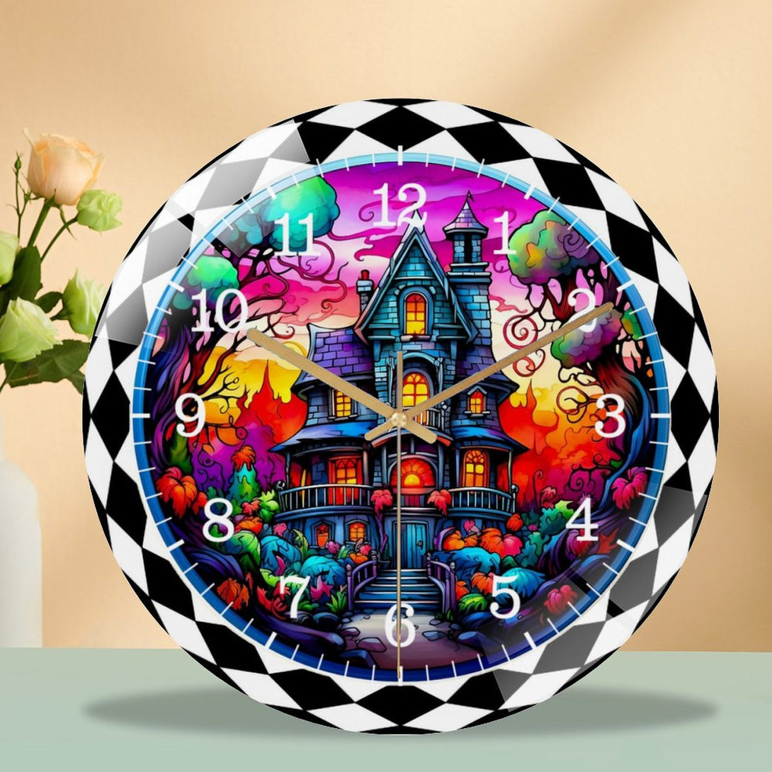 Vibrant Hallo-ween Haunted House Glass Wall Clock ,Spooky Decor Wall Clock for Homes, Bars, Offices, Man Caves, Garages, And Living Rooms. Hallo-ween Gift,12×12inch(30×30cm)