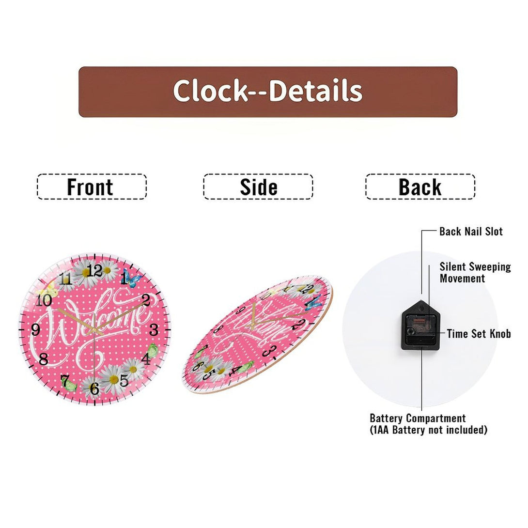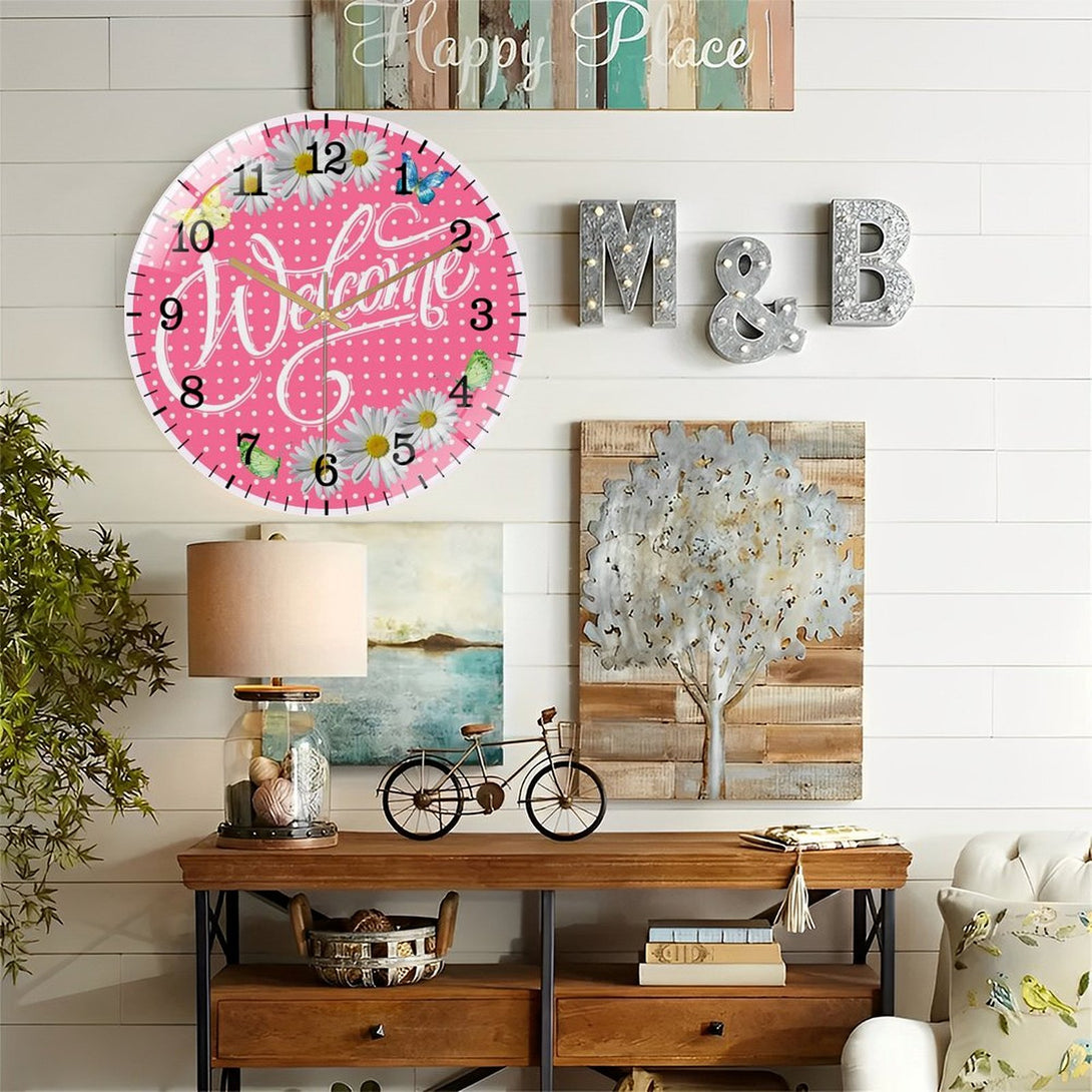 Decor Wall Clocks: Welcome Pink Daisy Spring Summer Glass Wall Clock ,Spring Decor Wall Clock for Homes, Bars, Offices, Man Caves, Garages, And Living Rooms. Also Makes A Great Gift.