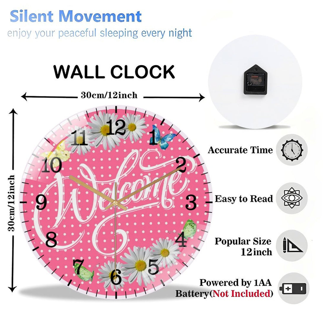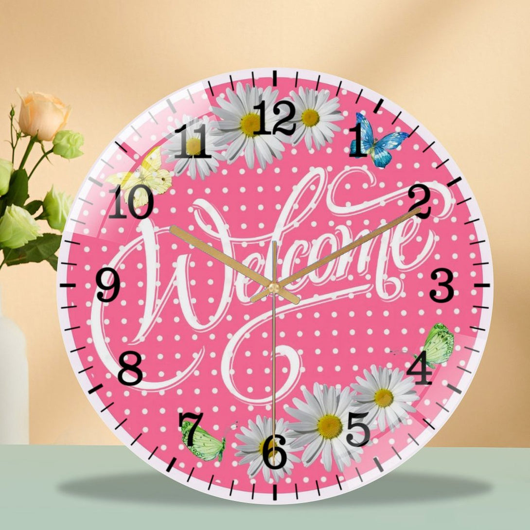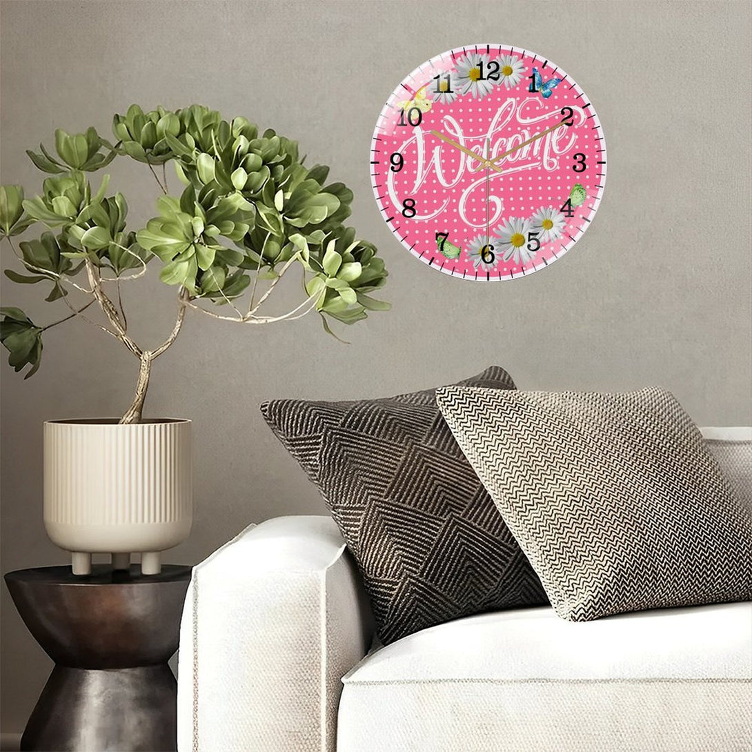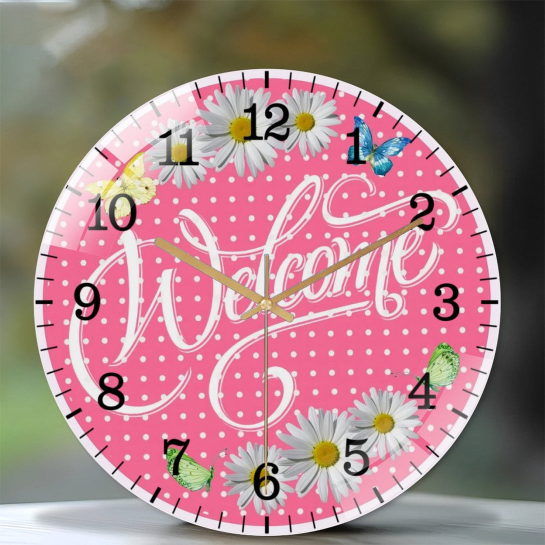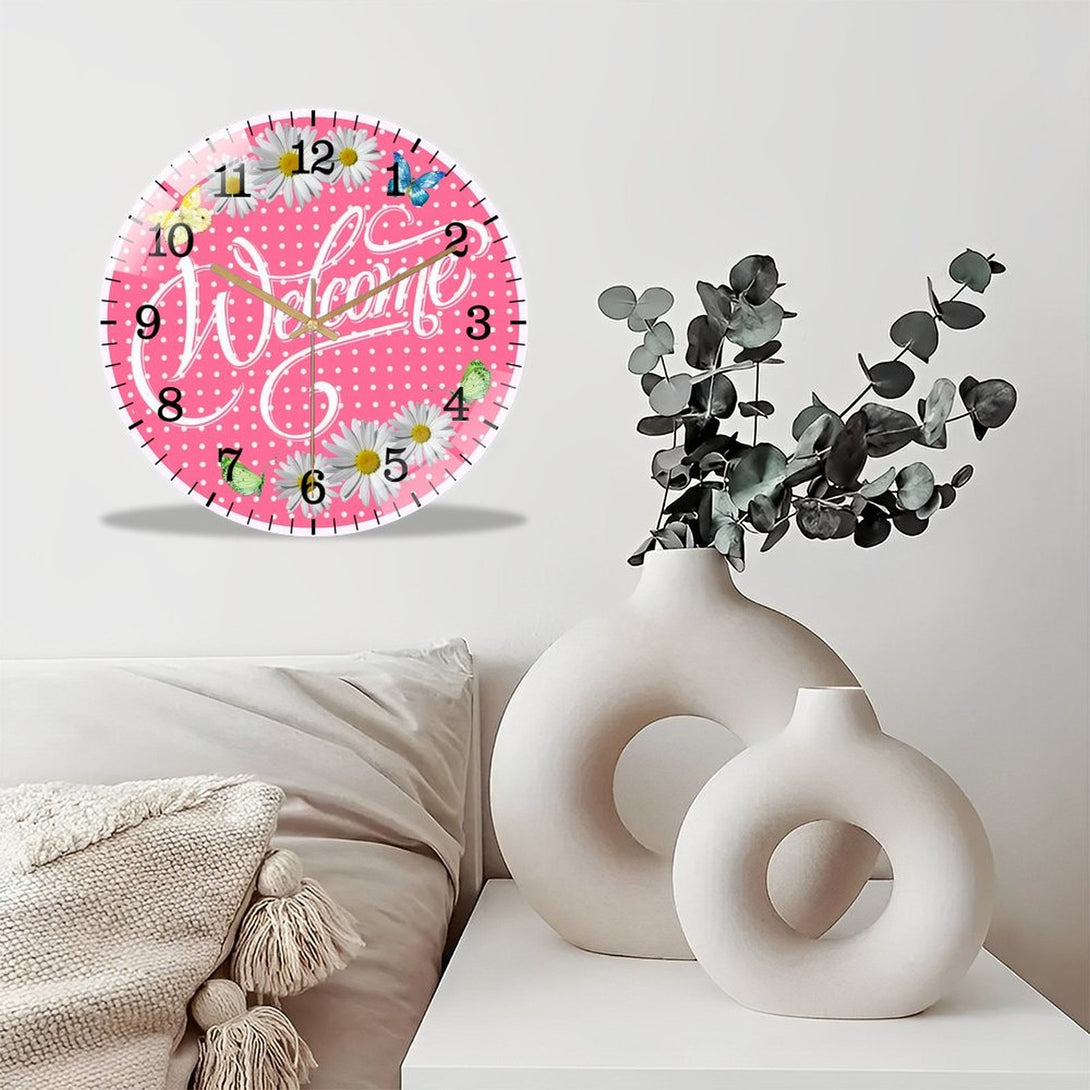 Welcome Pink Daisy Spring Summer Glass Wall Clock ,Spring Decor Wall Clock for Homes, Bars, Offices, Man Caves, Garages, And Living Rooms. Also Makes A Great Gift.,12×12inch(30×30cm)