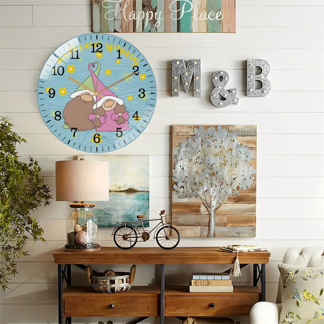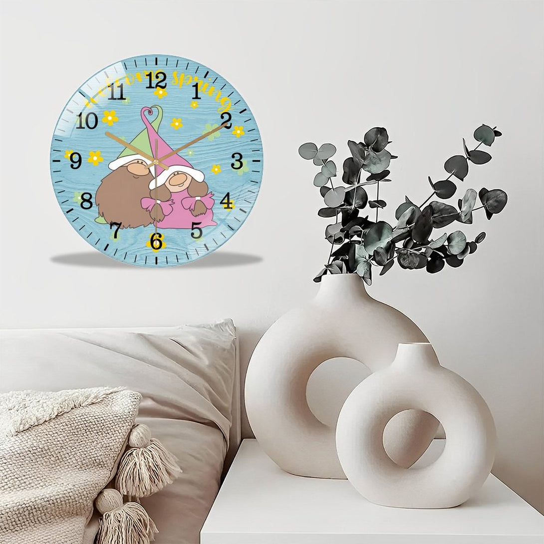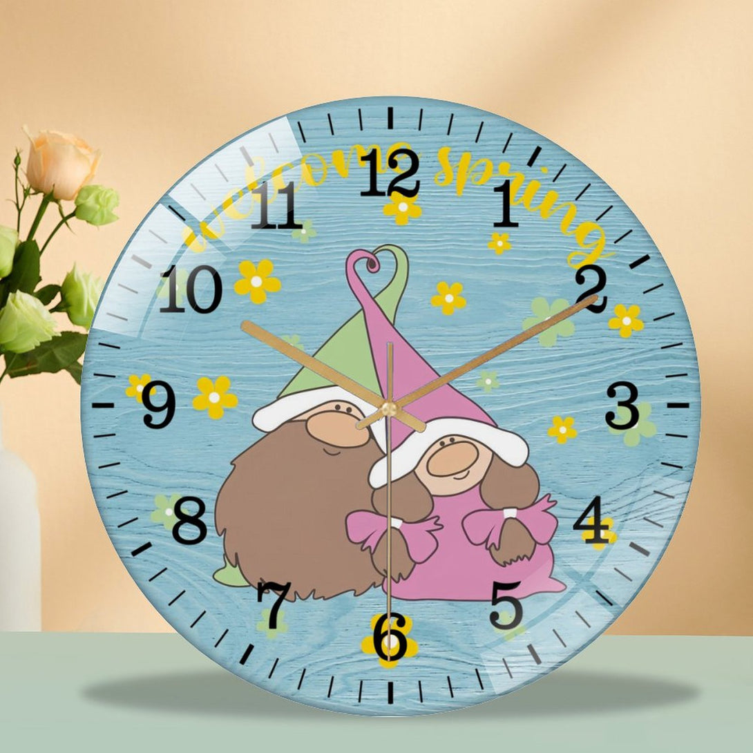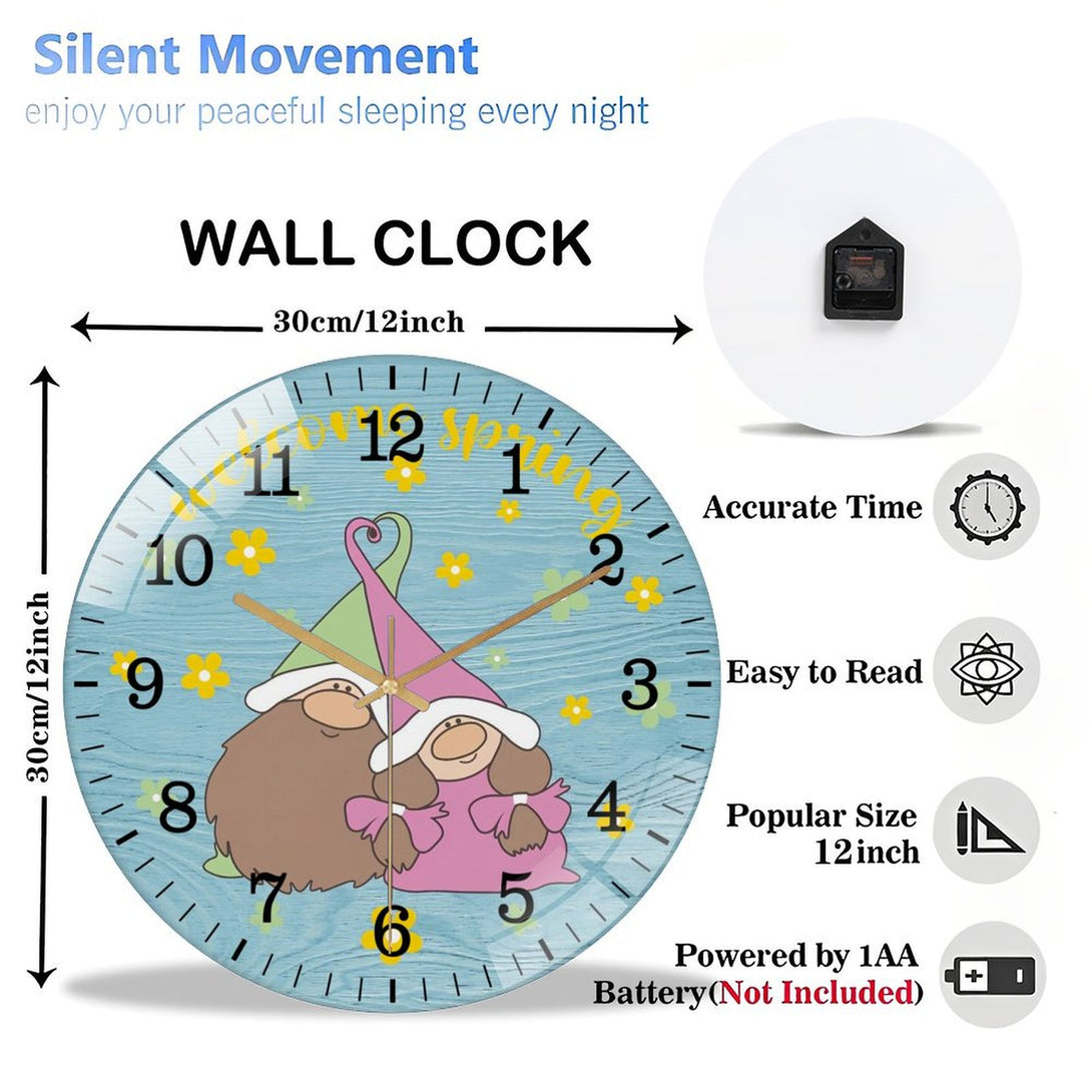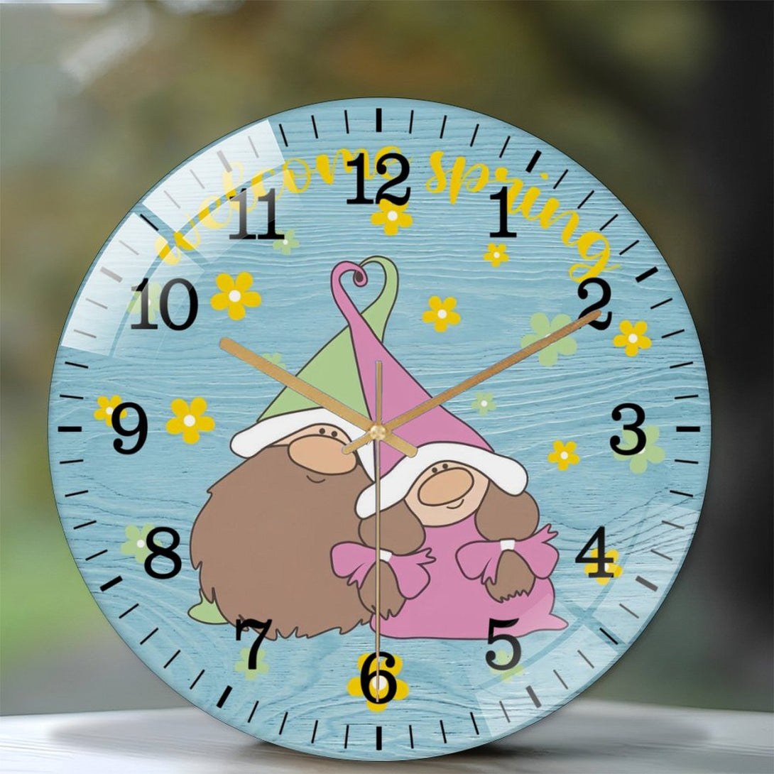 Welcome Spring Gnome Couple Glass Wall Clock ,gnome Couple Wall Clock for Homes, Bars, Offices, Man Caves, Garages, And Living Rooms. Also Makes A Great Gift.,12×12inch(30×30cm)