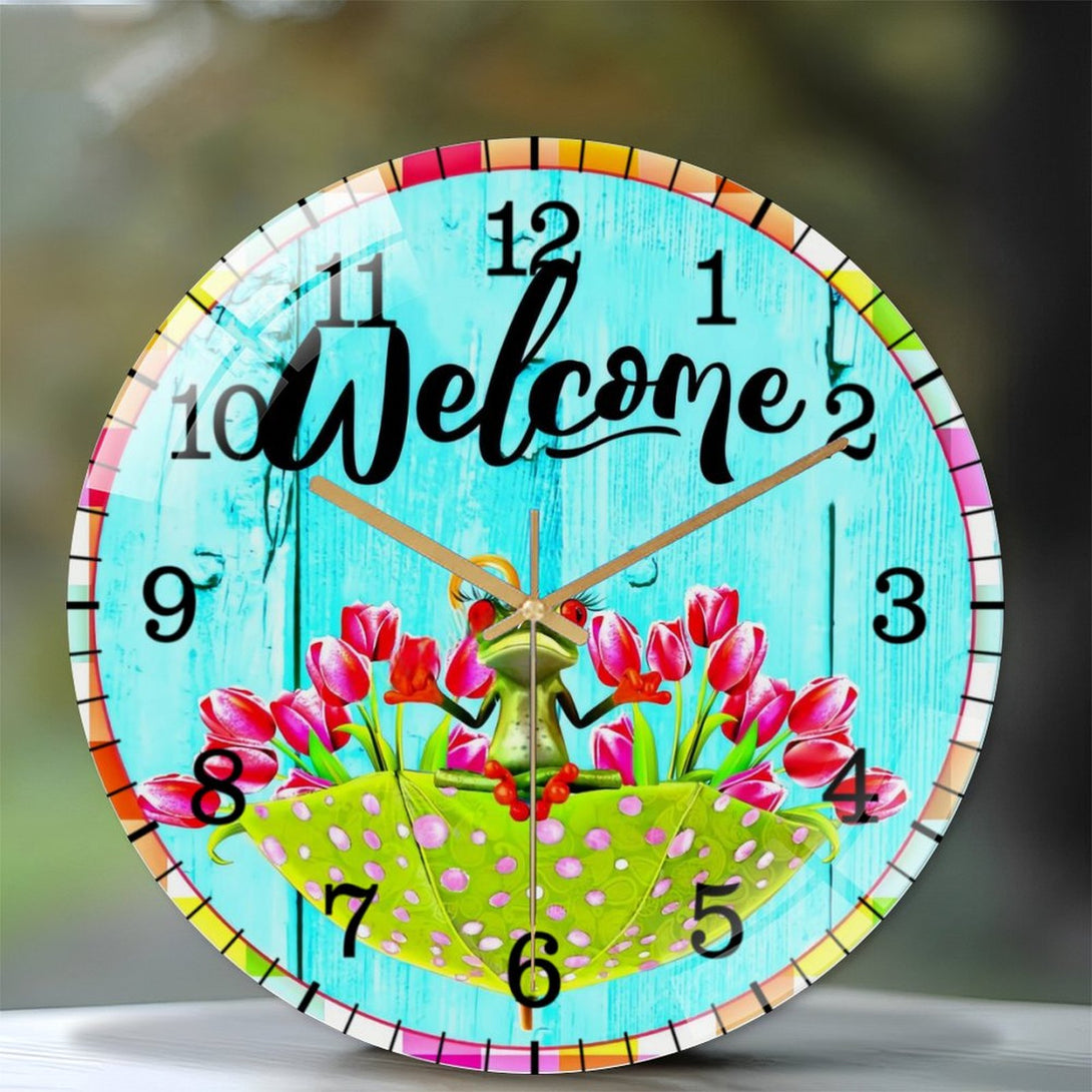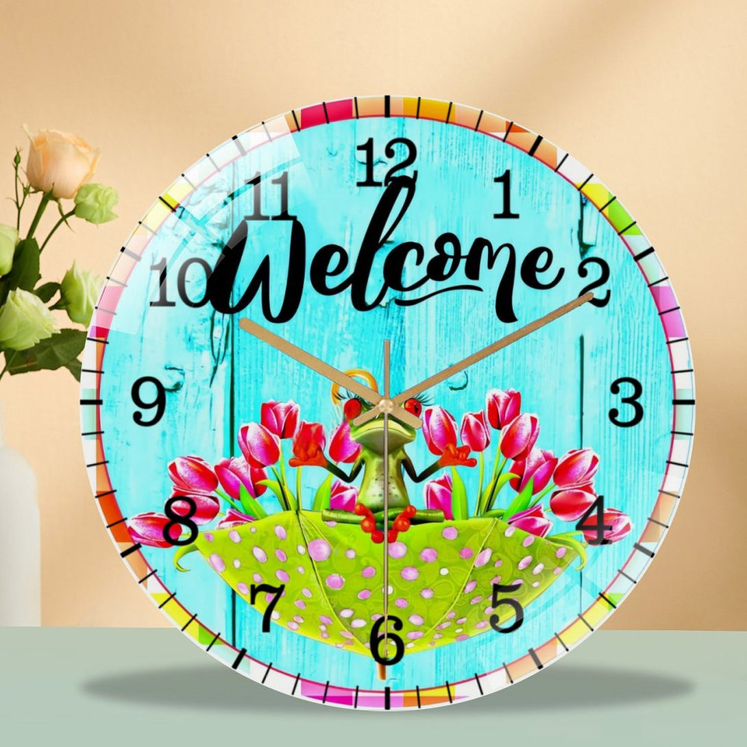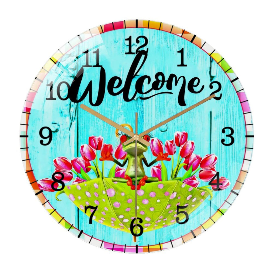 Welcome Wreath Glass Wall Clock ,Round Frog Wall Clock for Homes, Bars, Offices, Man Caves, Garages, And Living Rooms. Also Makes A Great Gift.,12×12inch(30×30cm)