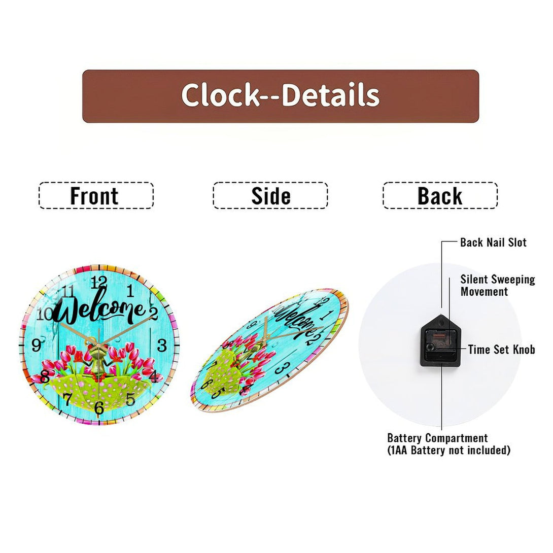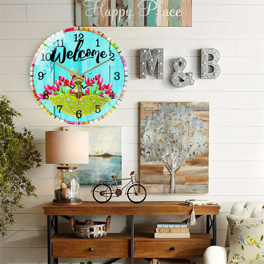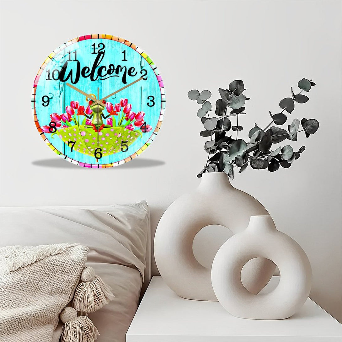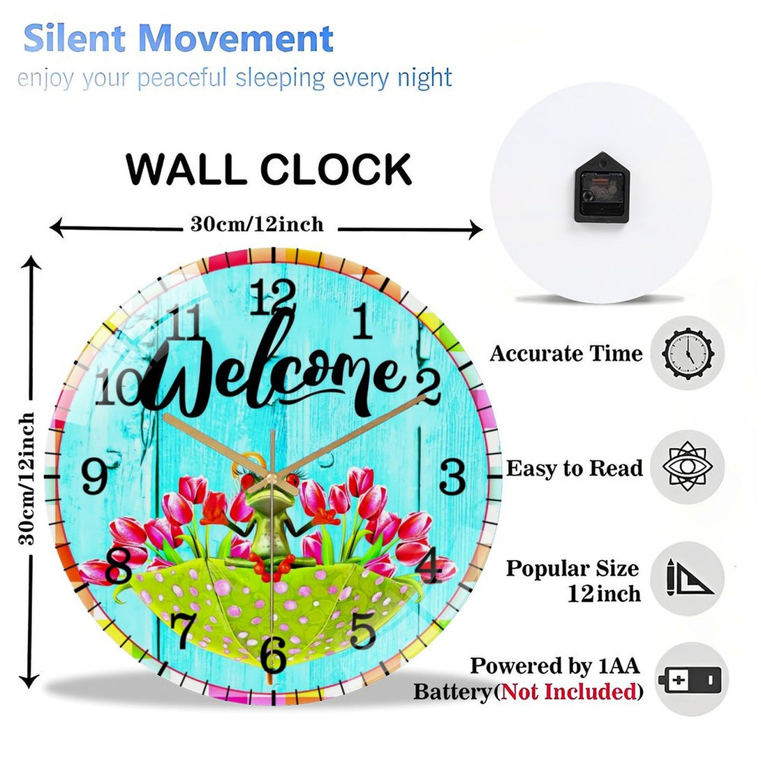 Welcome Wreath Glass Wall Clock ,Round Frog Wall Clock for Homes, Bars, Offices, Man Caves, Garages, And Living Rooms. Also Makes A Great Gift.,12×12inch(30×30cm)