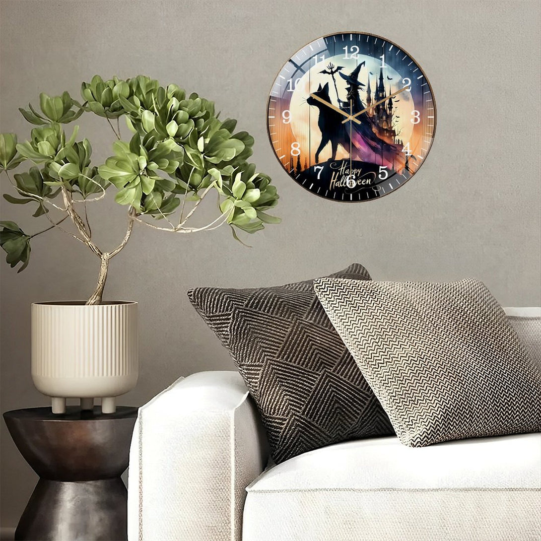 Decor Wall Clocks: Witch And Black Cat Wreath Glass Wall Clock for Homes, Bars, Offices, Man Caves, Garages, And Living Rooms. Also Makes A Great Gift. Style 12×12inch(30×30cm)