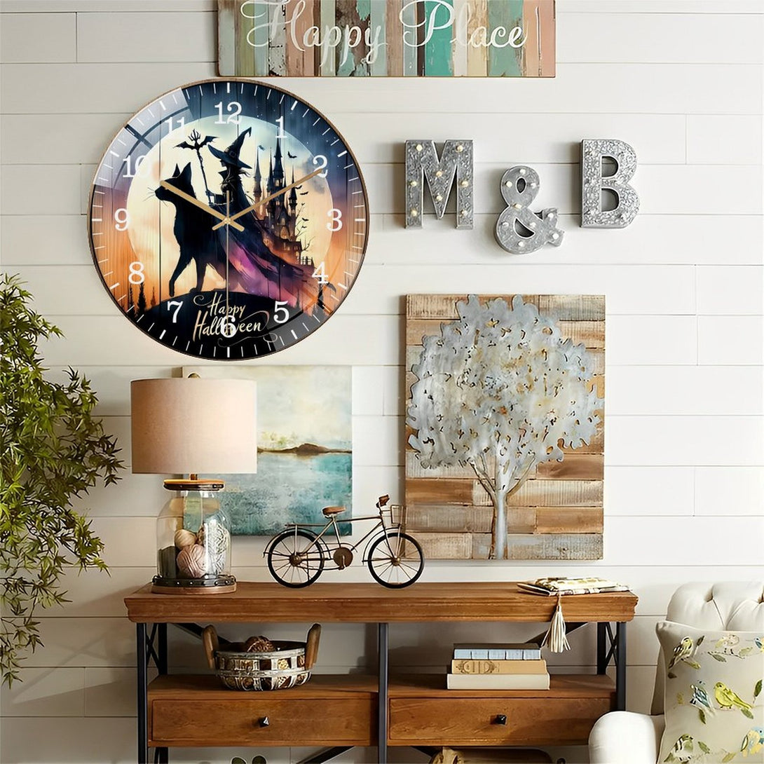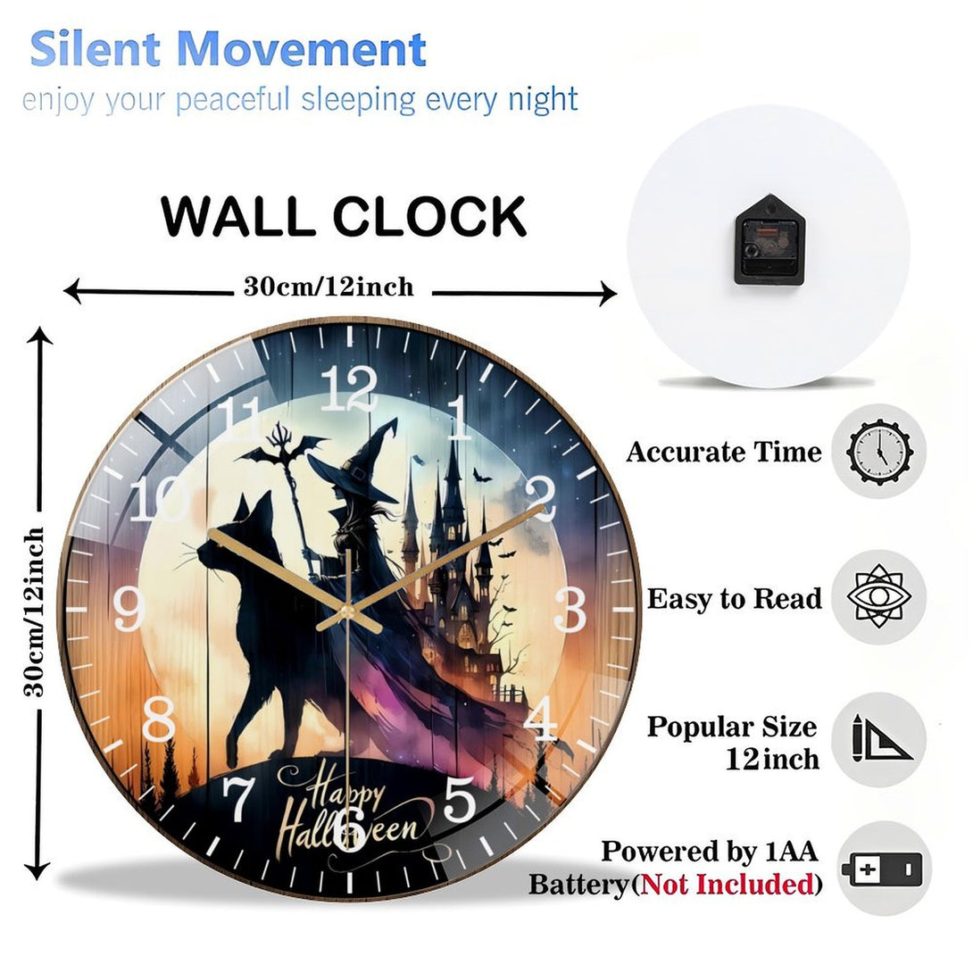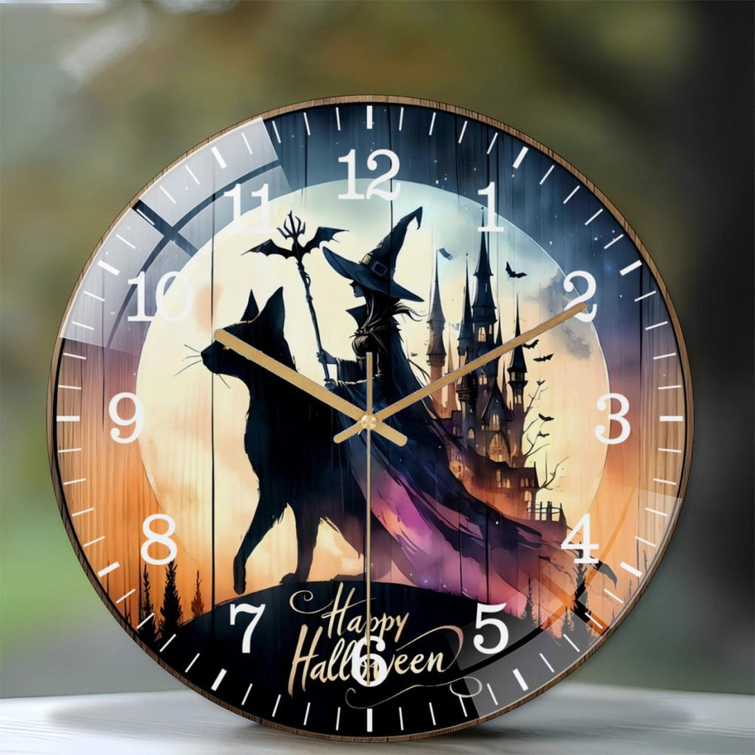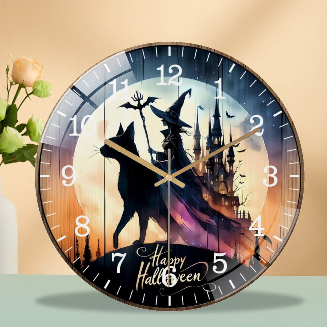 Witch And Black Cat Wreath Glass Wall Clock for Homes, Bars, Offices, Man Caves, Garages, And Living Rooms. Also Makes A Great Gift.,12×12inch(30×30cm)
