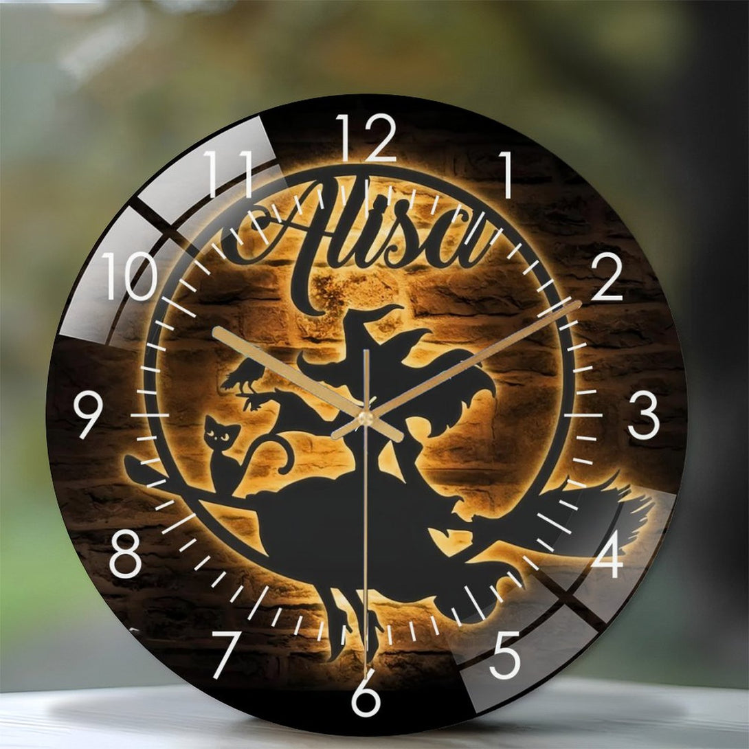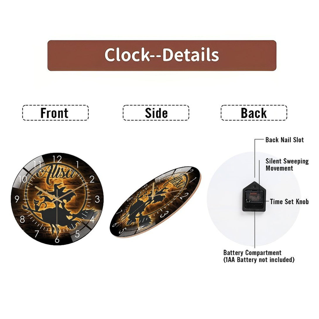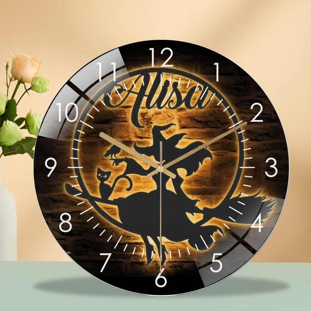 Decor Wall Clocks: Witch And Cat Glass Wall Clock,Moon Witch Riding Broom Wall Clock, for Homes, Bars, Offices, Man Caves, Garages, And Living Rooms. Hallo-ween Gift .Also Makes A Grea.