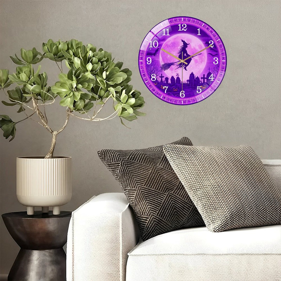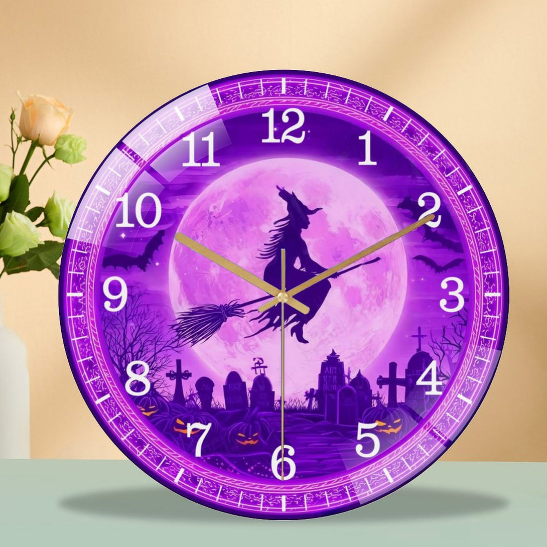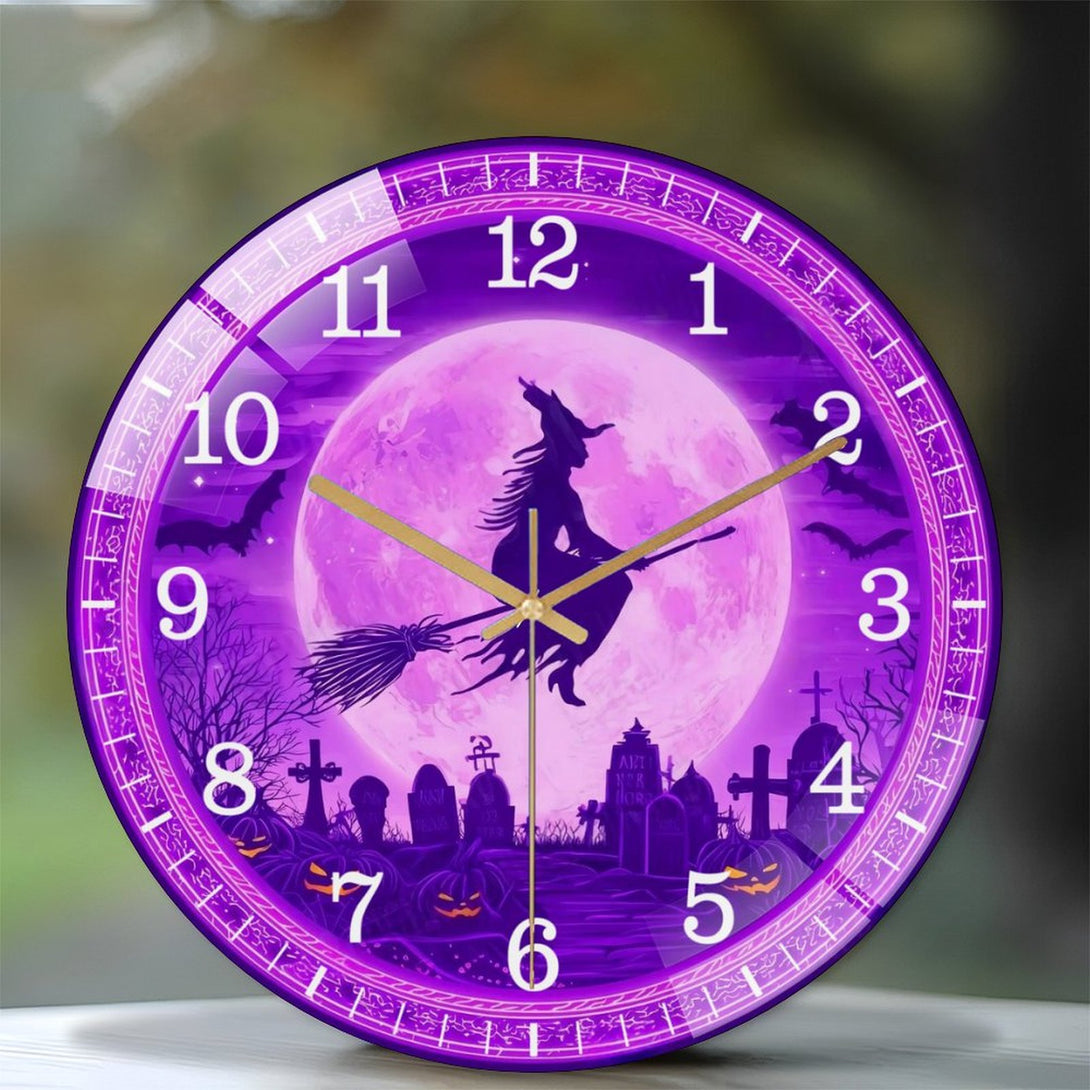 Decor Wall Clocks: Witch Flying on A Broom in Front of A Full Moon Glass Wall Clock, Hallo Ween Fall Decor Wall Clock for Homes, Bars, Offices, Man Caves, Garages, And Living Rooms