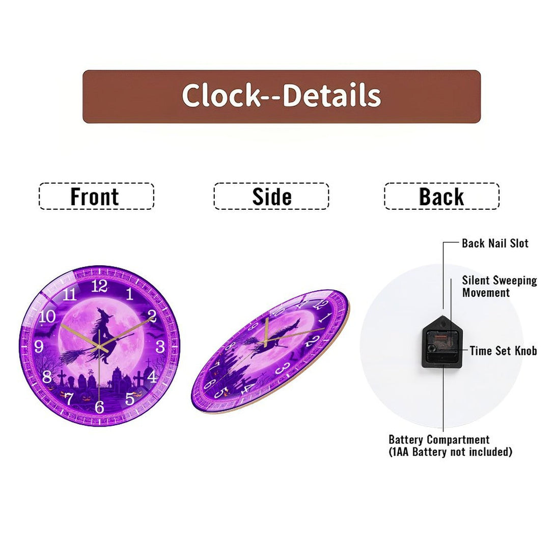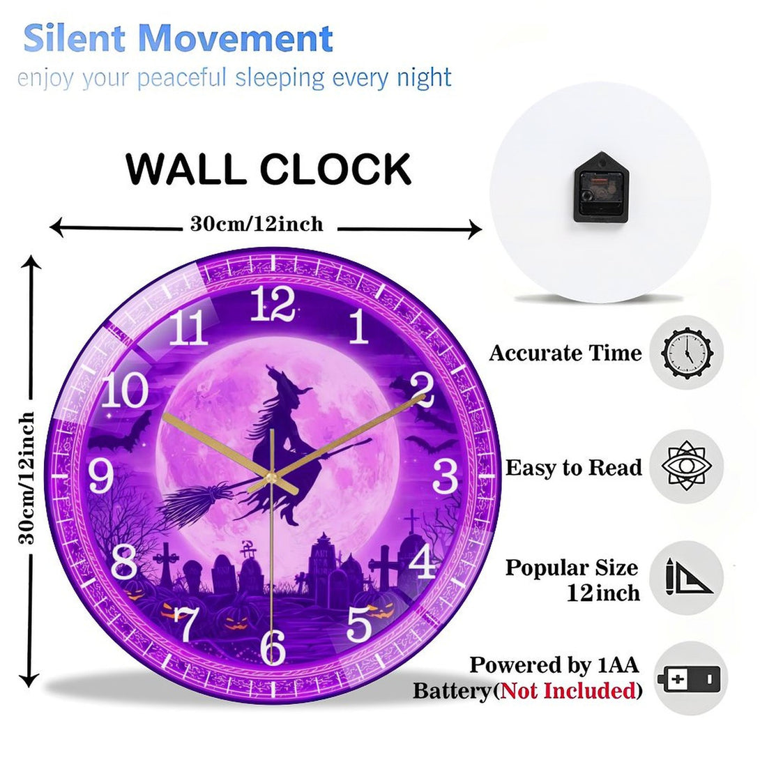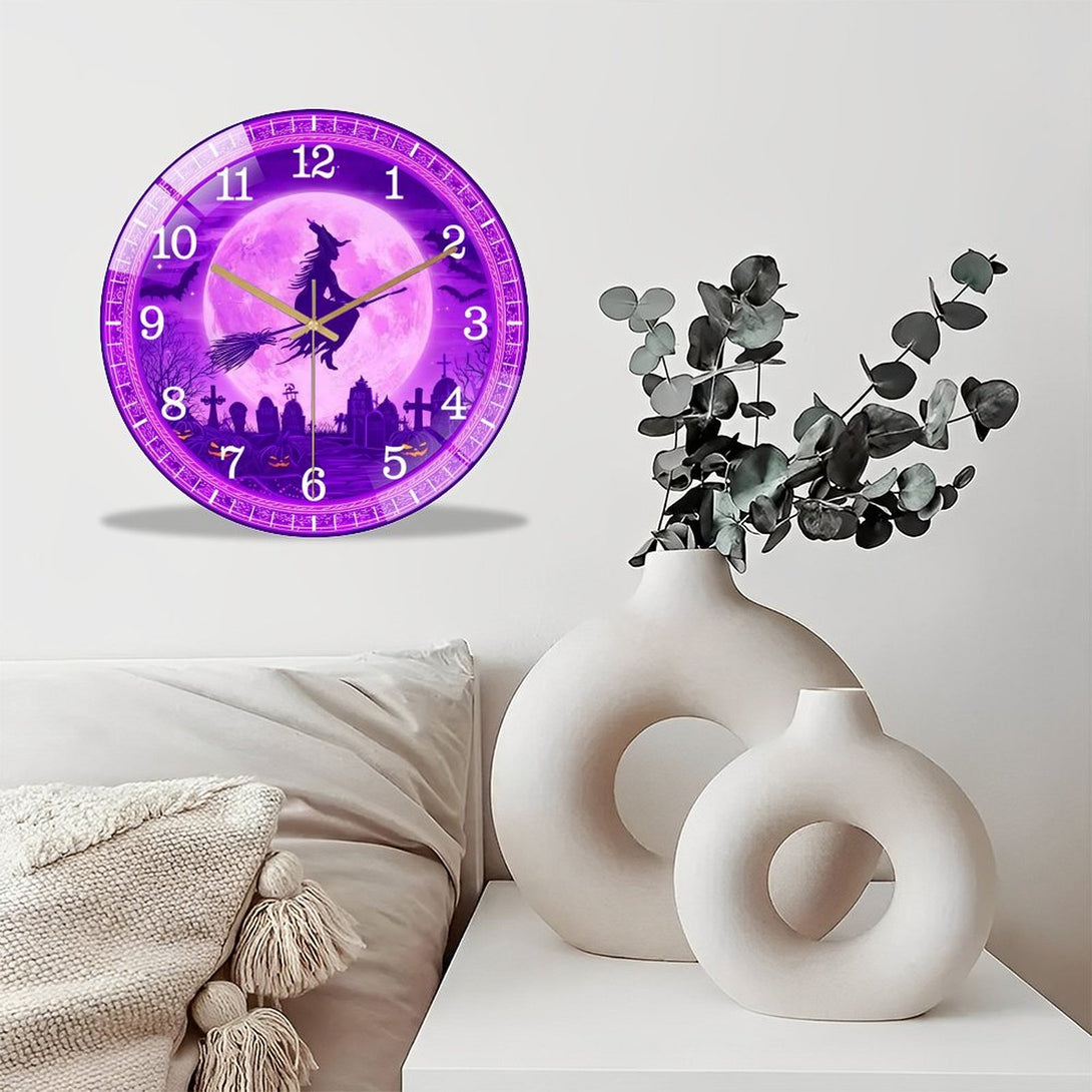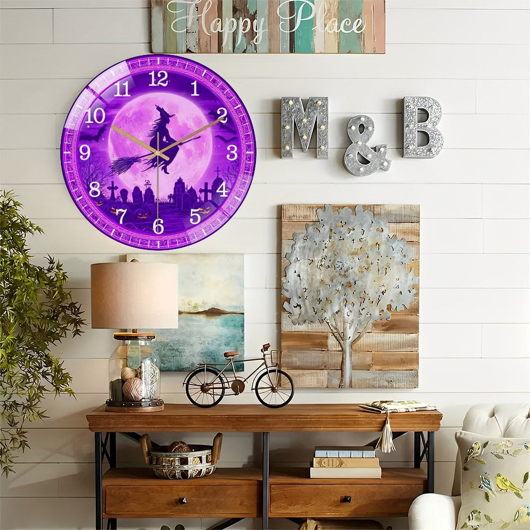 Decor Wall Clocks: Witch Flying on A Broom in Front of A Full Moon Glass Wall Clock, Hallo Ween Fall Decor Wall Clock for Homes, Bars, Offices, Man Caves, Garages, And Living Rooms