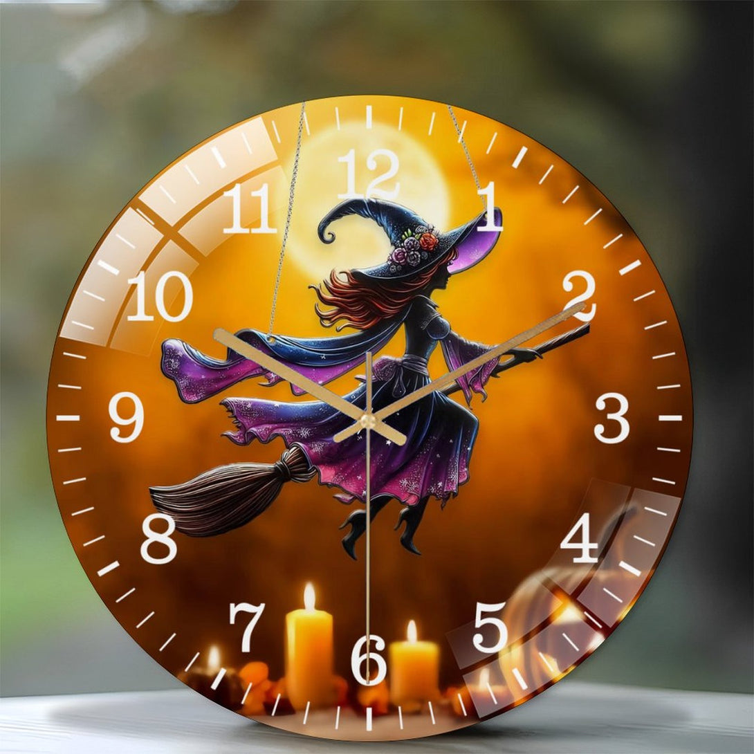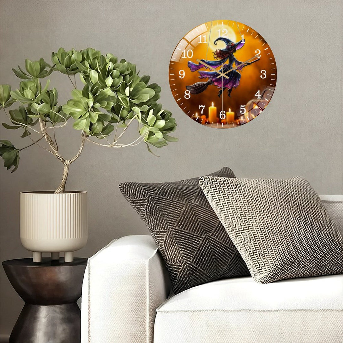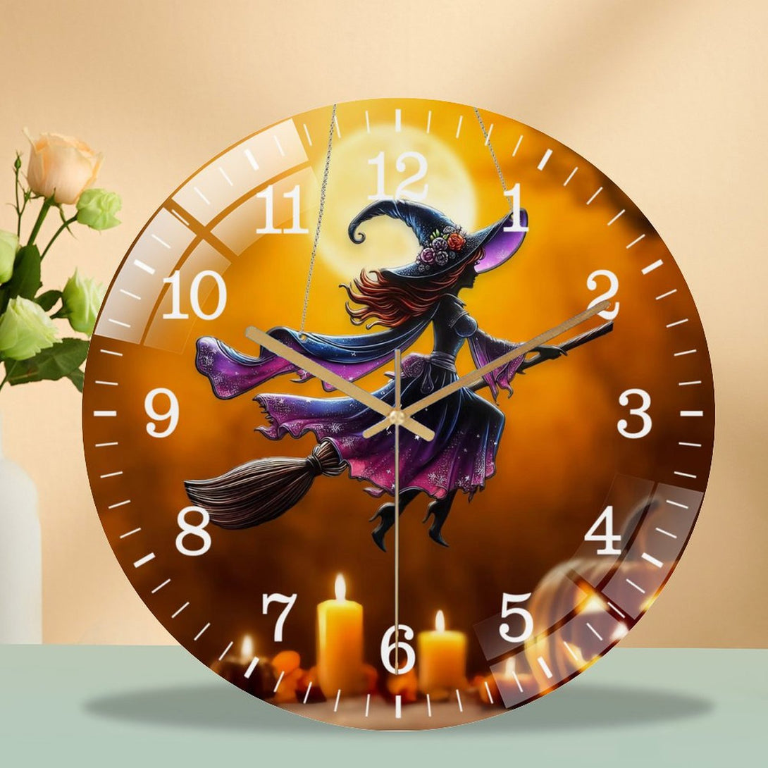 Witch on Broom Glass Wall Clock, Witch Hallo-ween Decorations Wall Clock, Scary Decor, Spooky Home Decor, Hallo-ween Gift,12×12inch(30×30cm)
