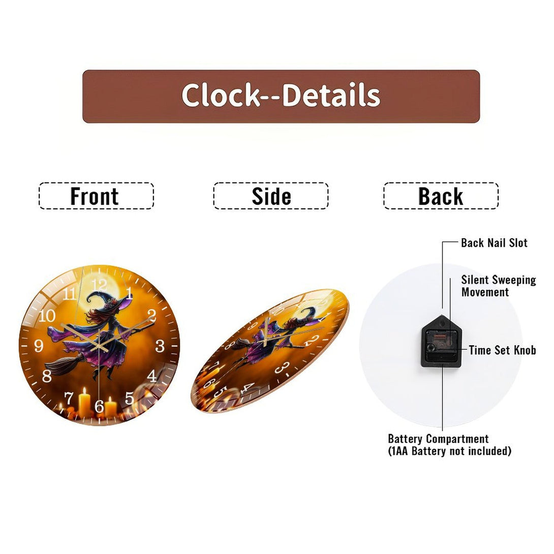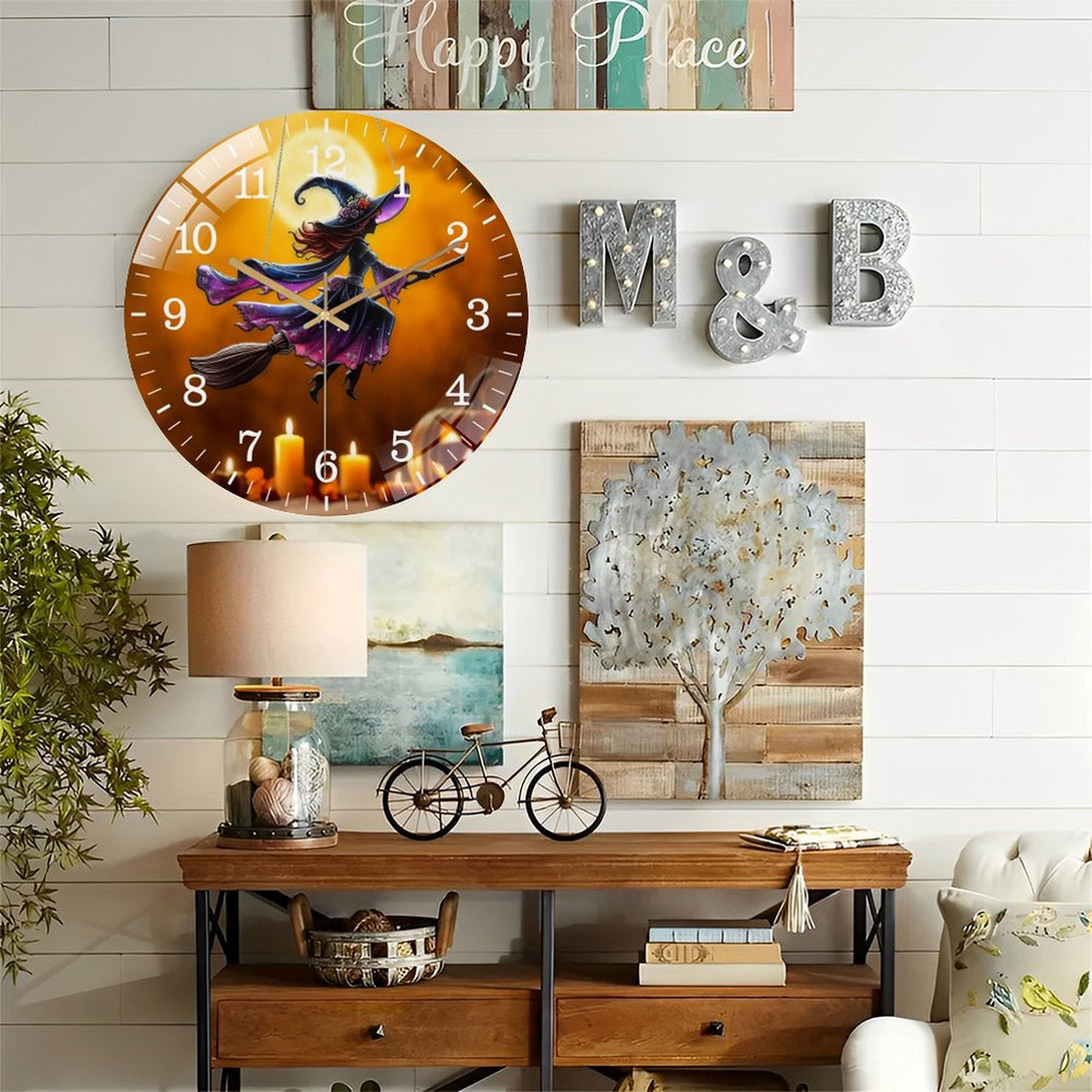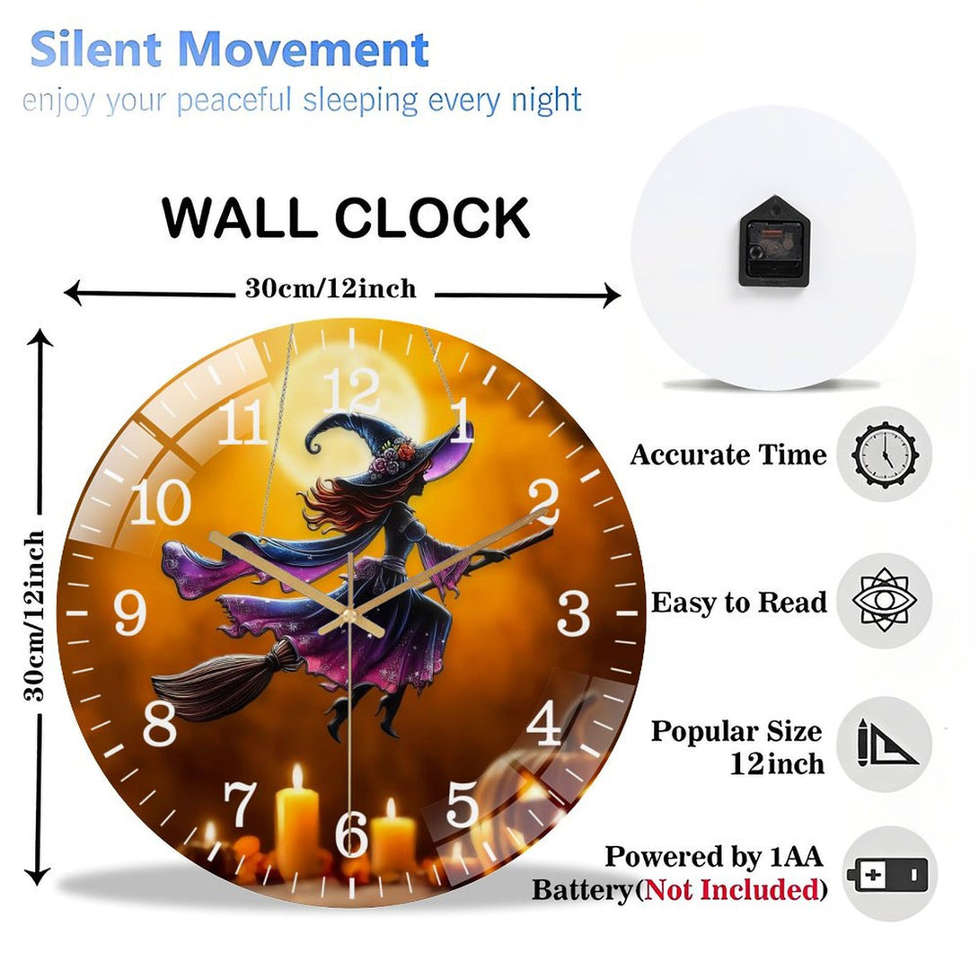 Witch on Broom Glass Wall Clock, Witch Hallo-ween Decorations Wall Clock, Scary Decor, Spooky Home Decor, Hallo-ween Gift,12×12inch(30×30cm)