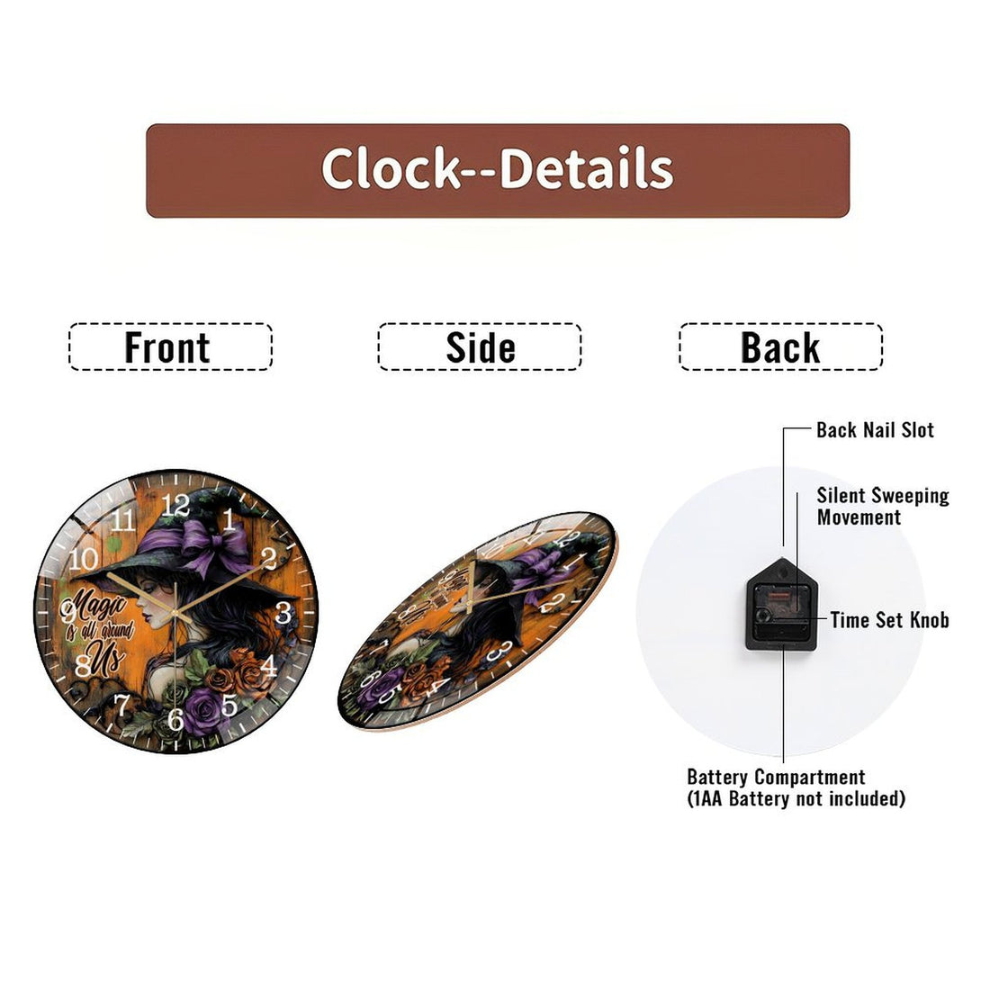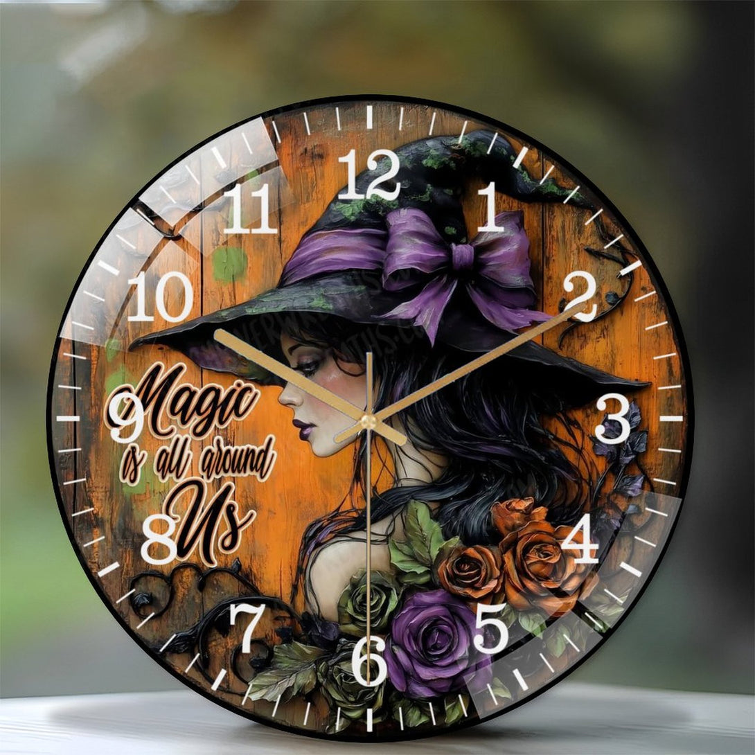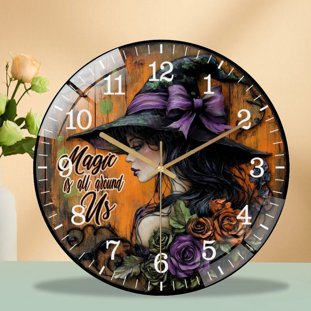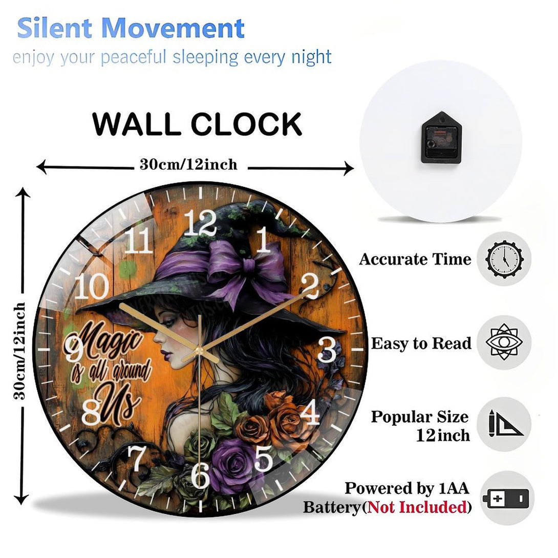 Decor Wall Clocks: Witch Wreath Glass Wall Clock, Magic Is All Around Us Wall Clock for Homes, Bars, Offices, Man Caves, Garages, And Living Rooms. Also Makes A Great Gift. Style 12×12inch(30×30cm)