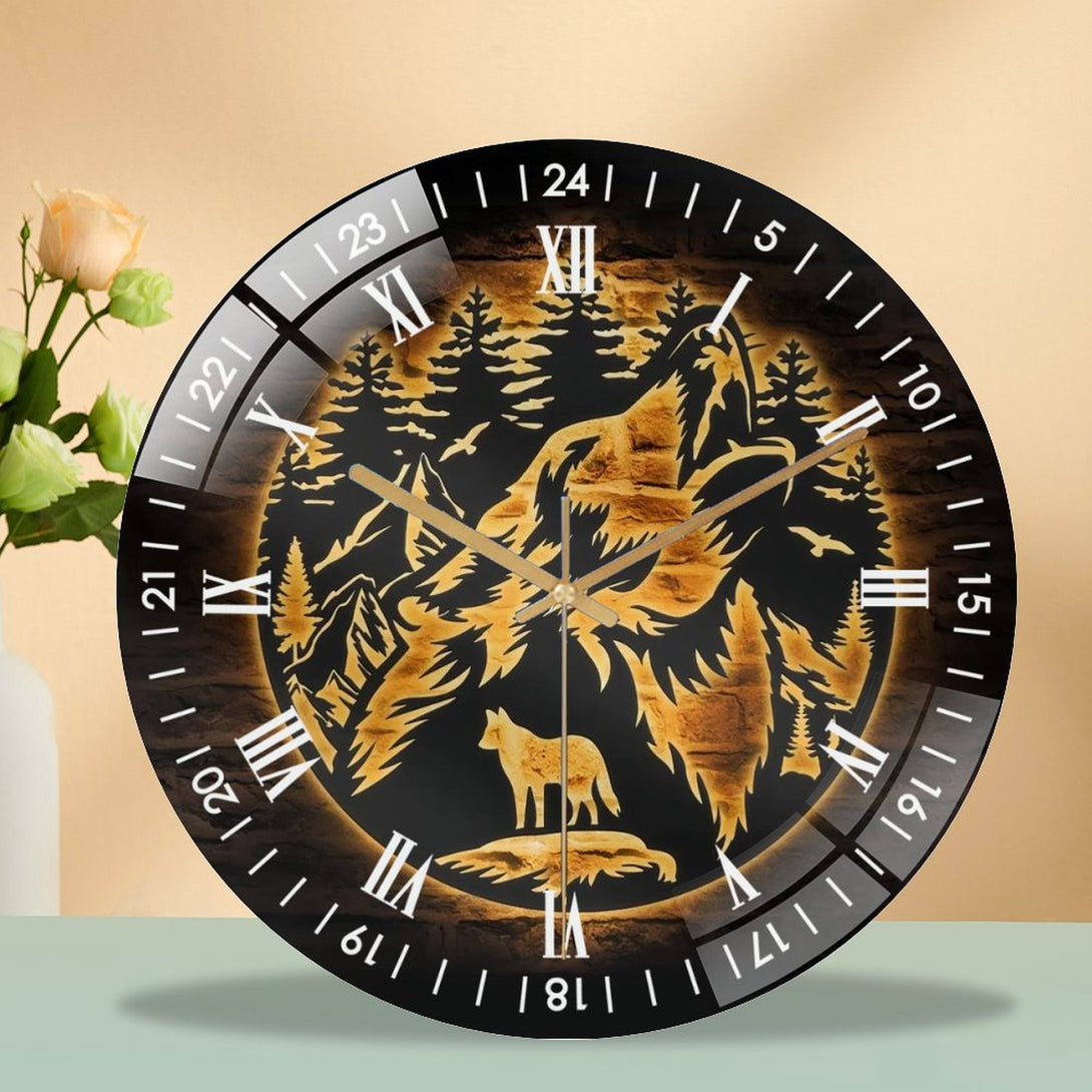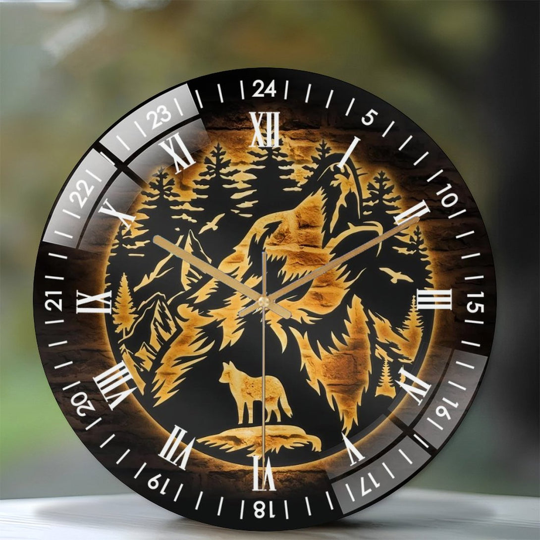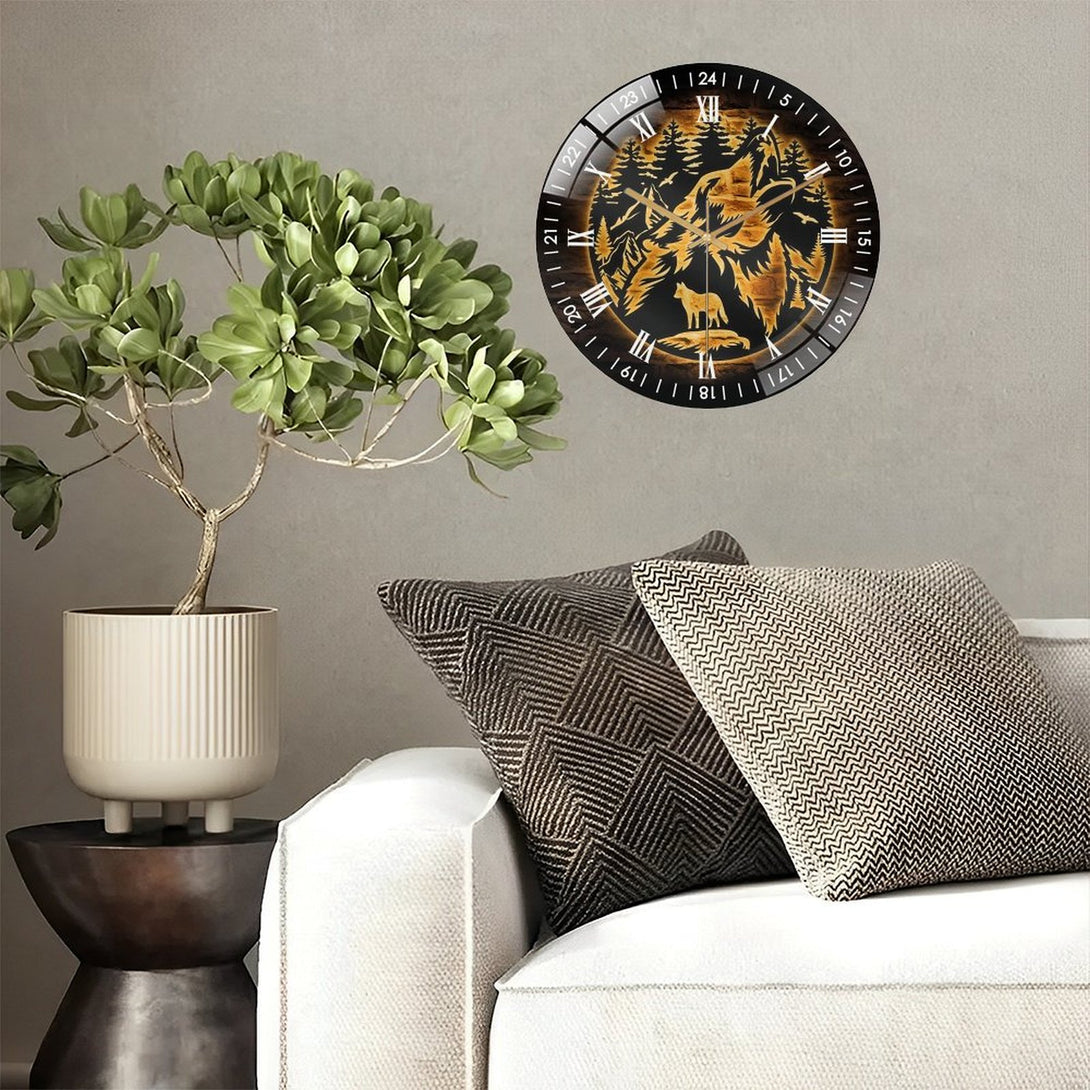 Wolf In Mountain Forest Glass Wall Clock, Wolf Moon Glass Wall Clock,Home Decor Boy Girl Nursery Decoration Christmas Birthday Housewarming,12×12inch(30×30cm)