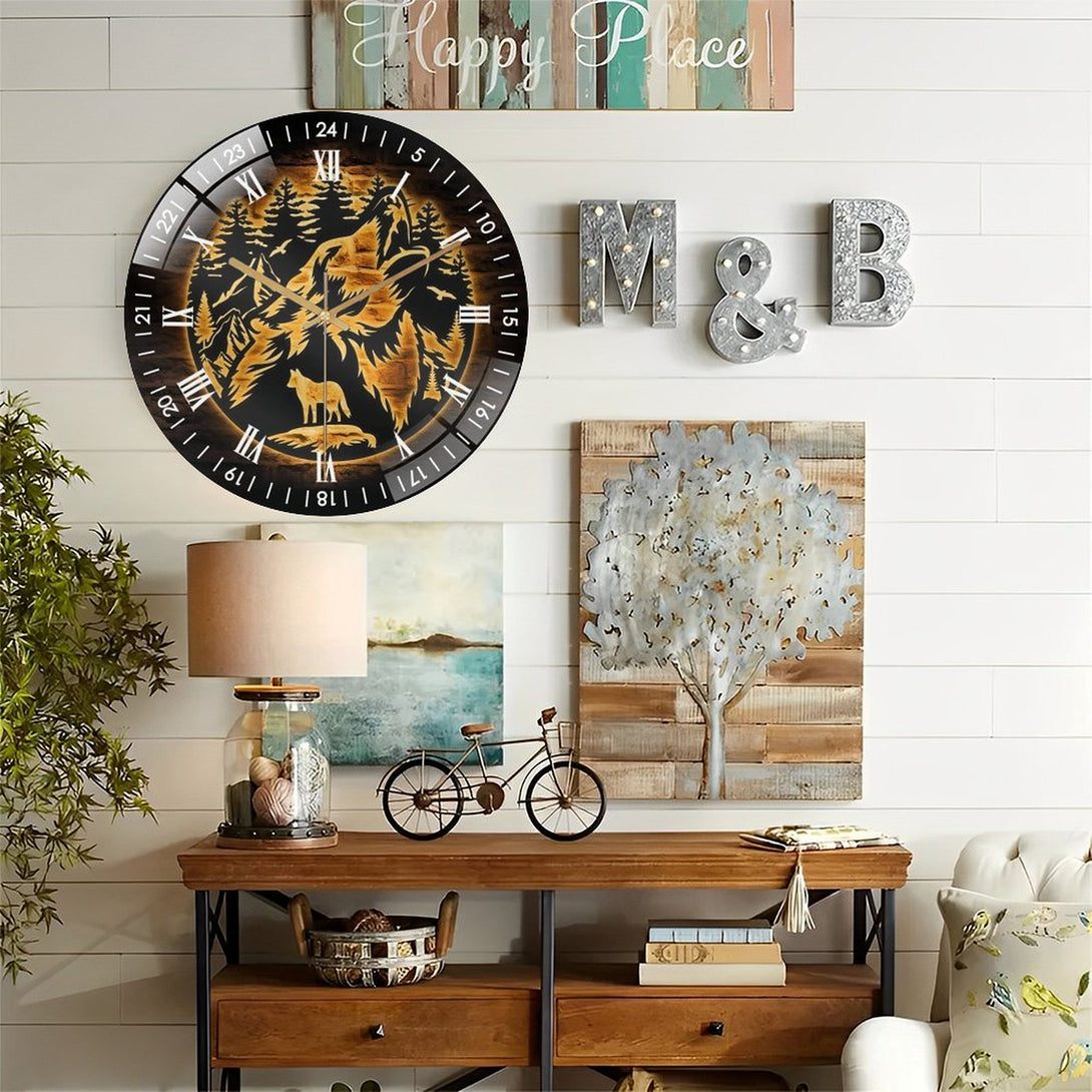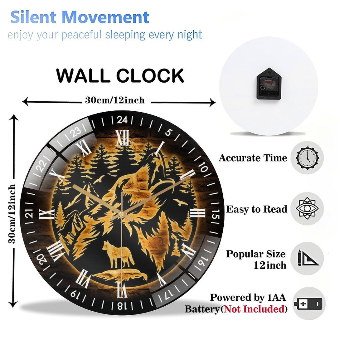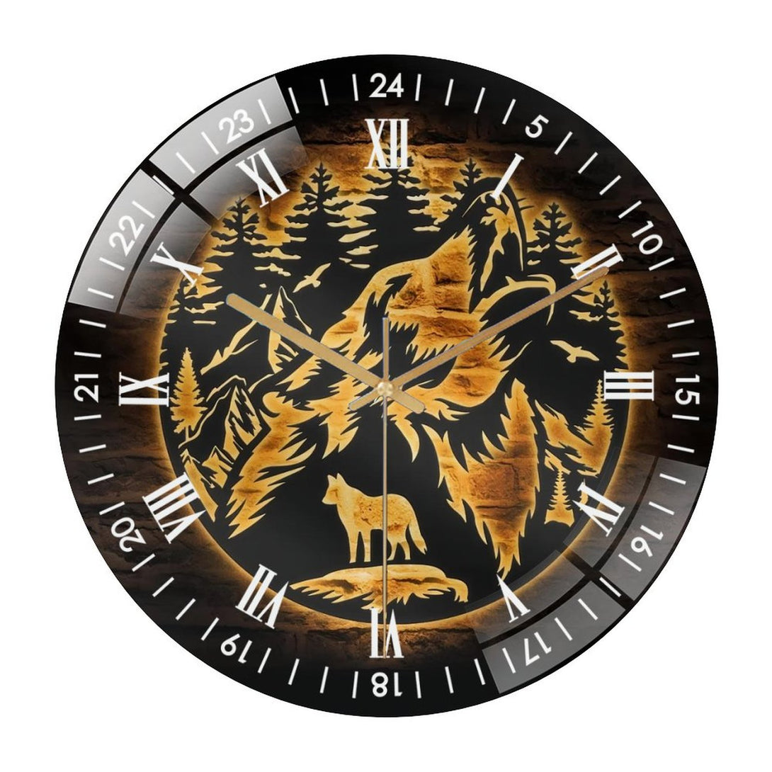 Wolf In Mountain Forest Glass Wall Clock, Wolf Moon Glass Wall Clock,Home Decor Boy Girl Nursery Decoration Christmas Birthday Housewarming,12×12inch(30×30cm)